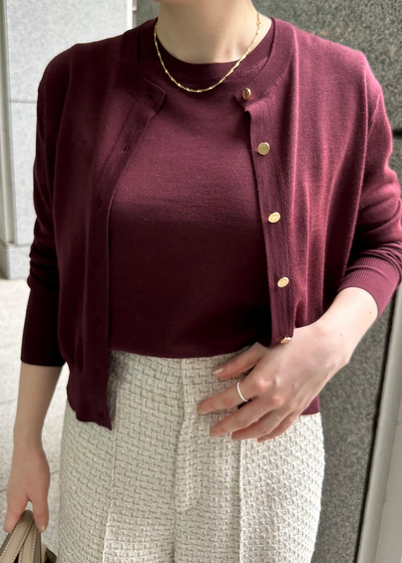 ワインカラーが女性らしい上品な雰囲気に、ワイドパンツがカッコ良さを加えてくれるコーディネートです。