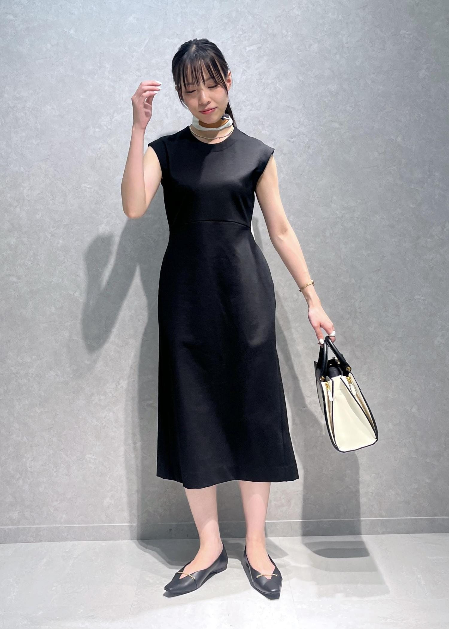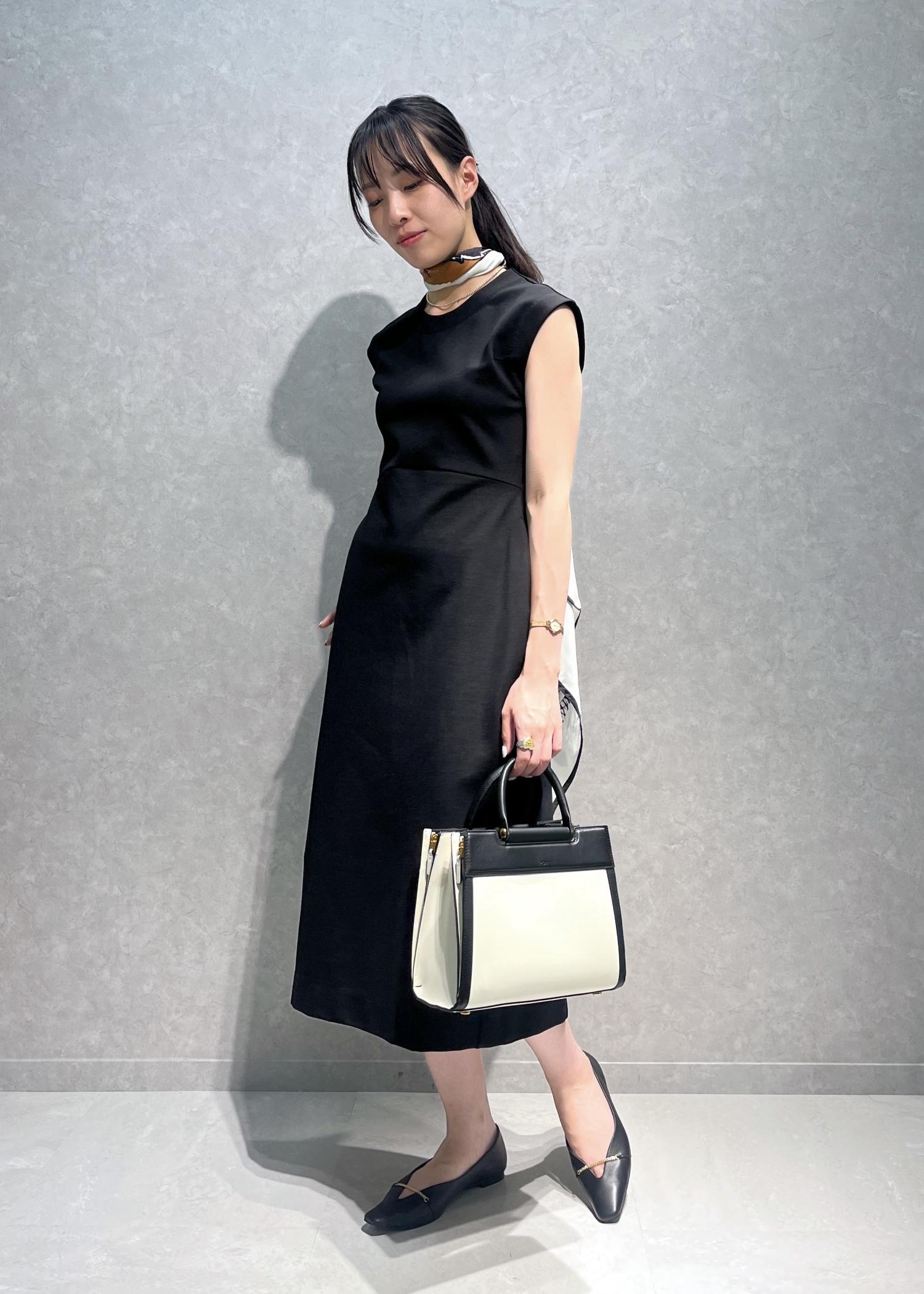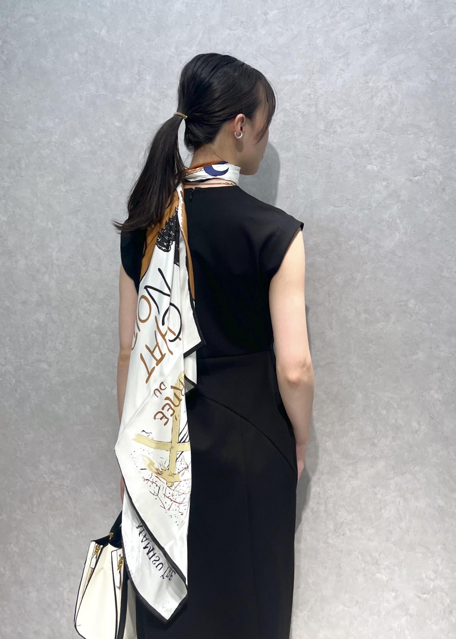 シルエットにこだわったシンプルなブラックワンピースにロートレック柄の大判ストールで揺れ感のあるスタイリングにまとめてみました◎