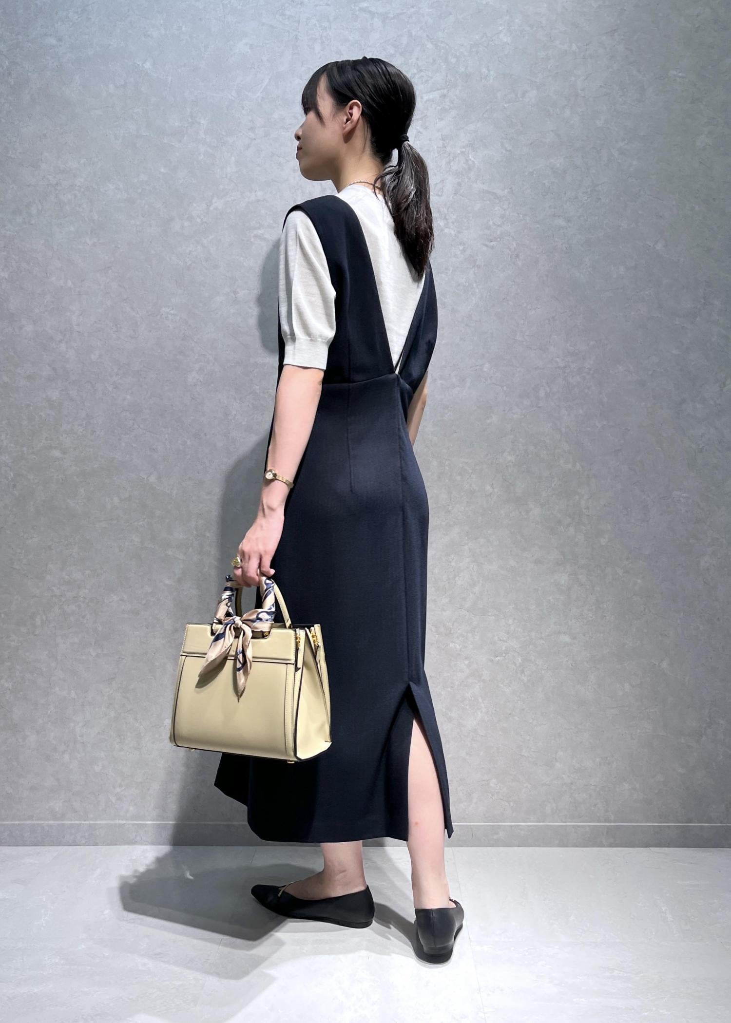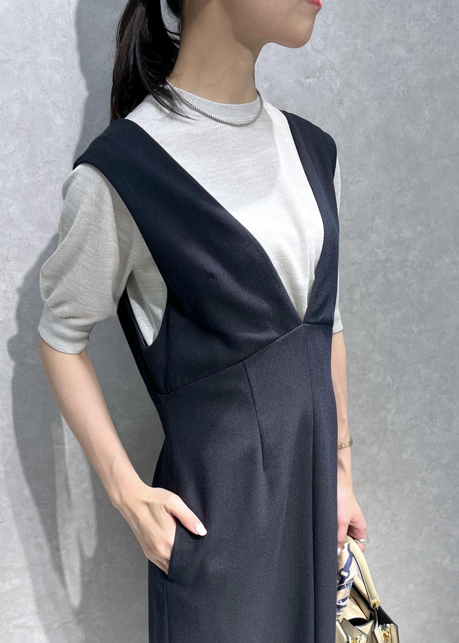 深いVネックラインがスタイルを良く見せてくれるフォルムが綺麗なワンピースにコンパクトな五分袖でシンプルにまとめてみました!