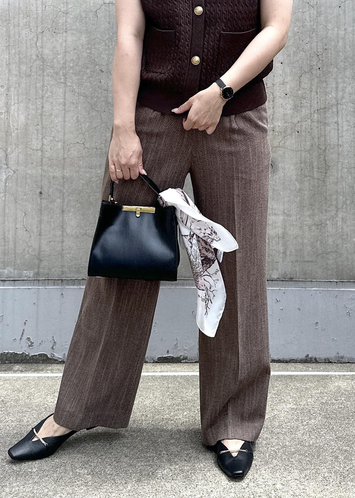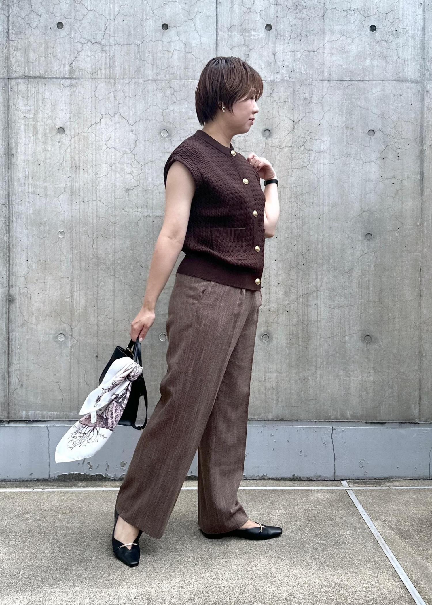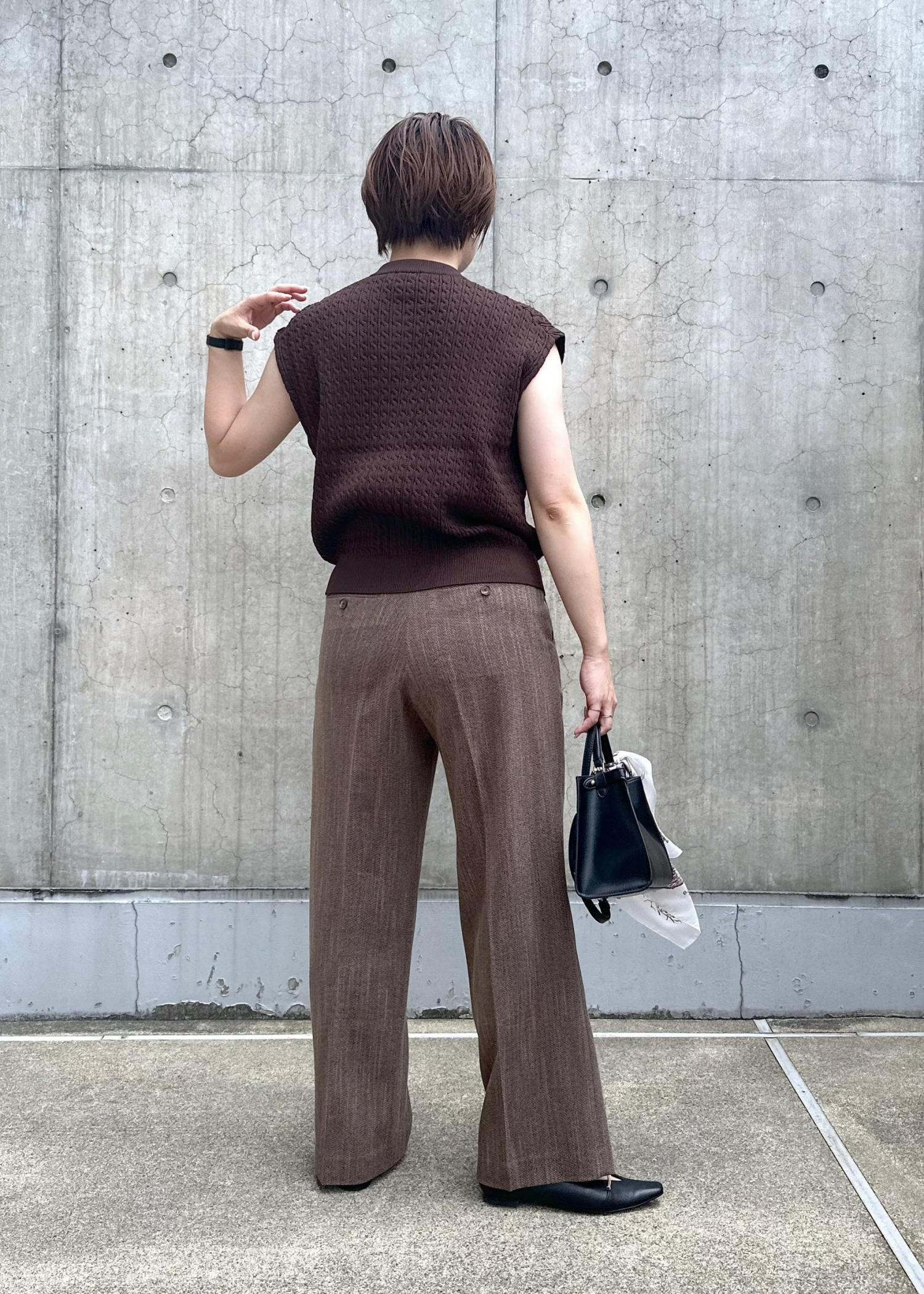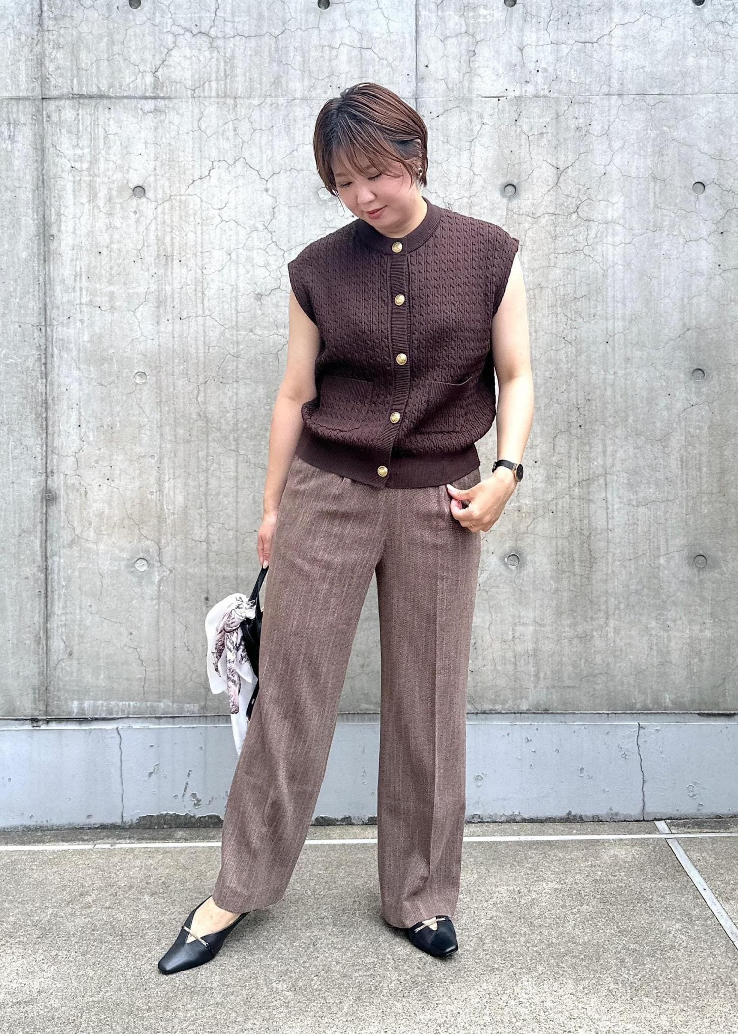 新作のニットベストとシルエットがきれいなセミワイドパンツを合わせて秋先取りのコーデにしてみました‼︎