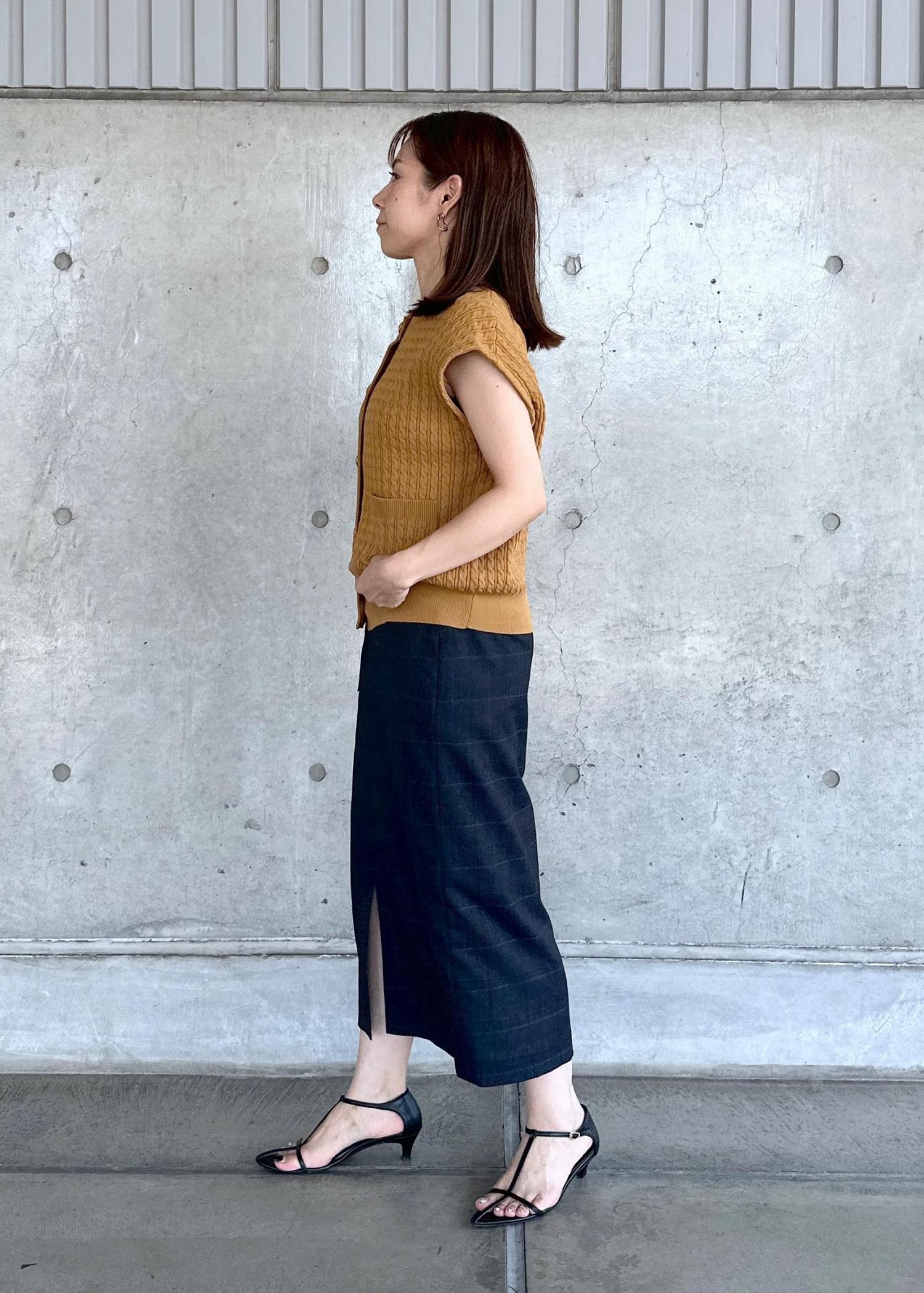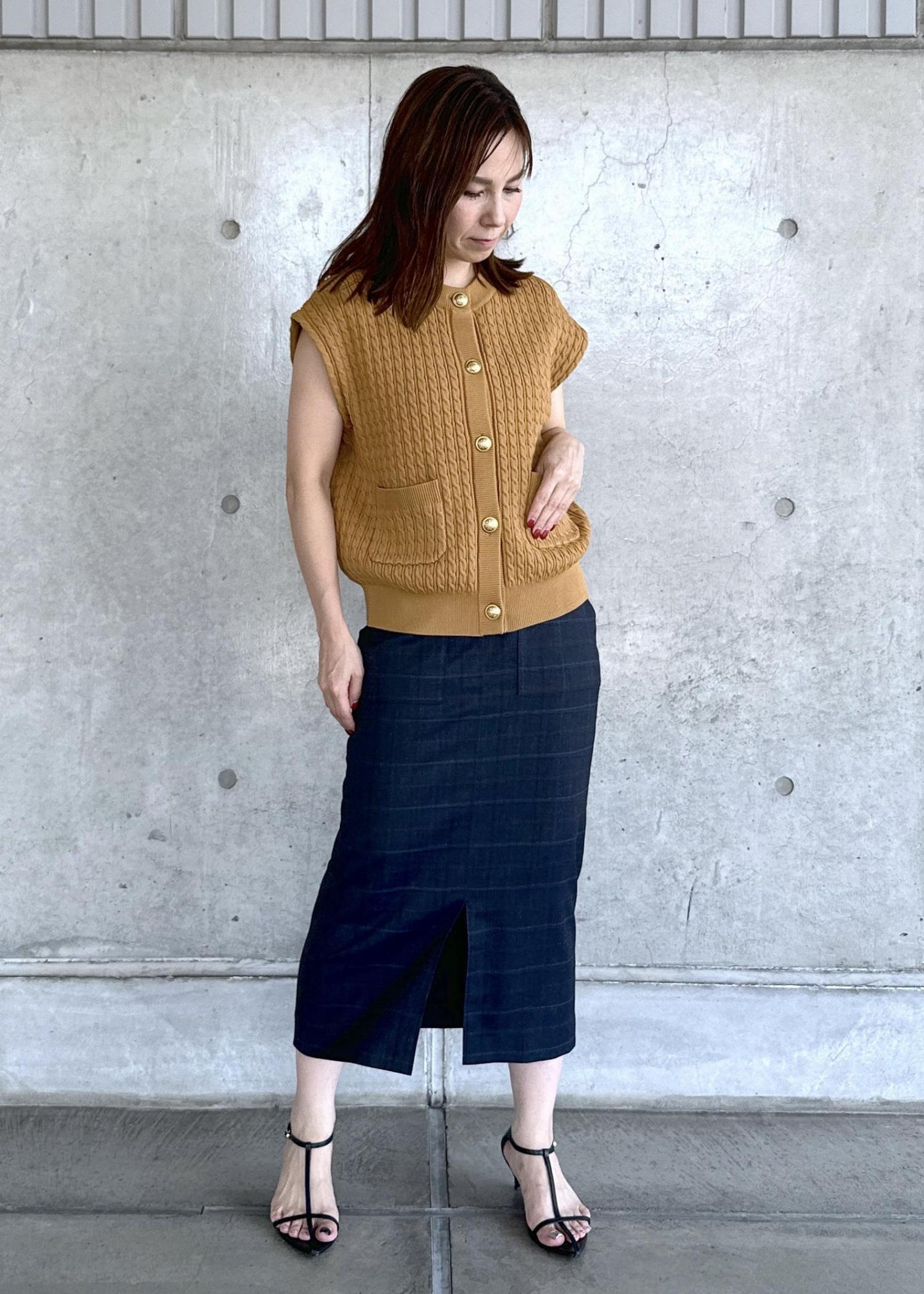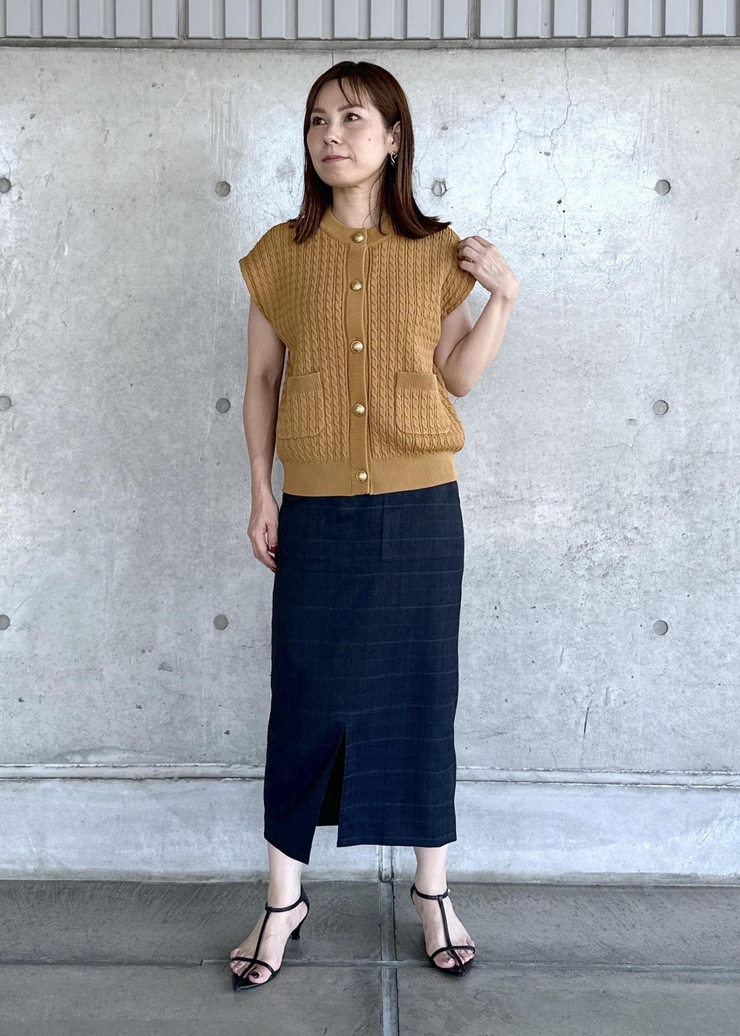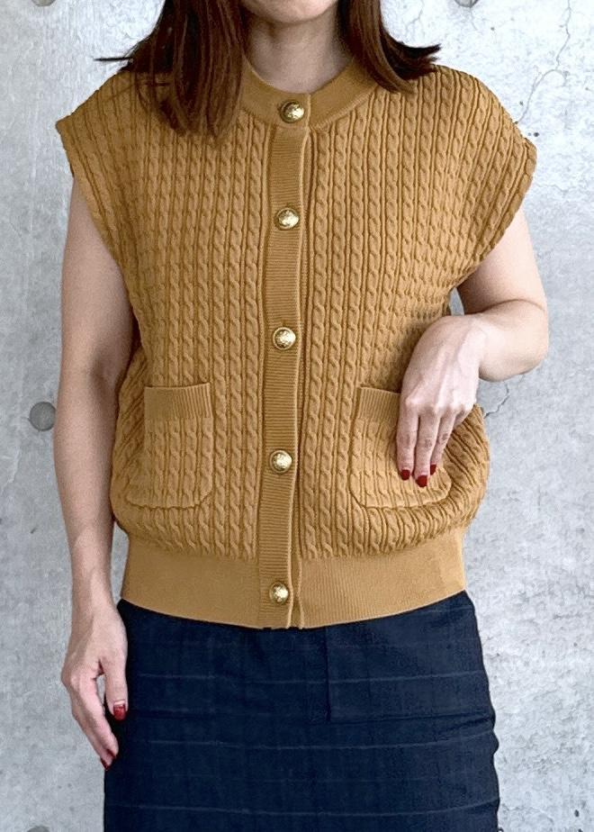 ミニケーブル編みがカジュアルになりすぎず、光沢のあるキレイな発色とゴールドのボタンが大人の女性にぴったりです!
