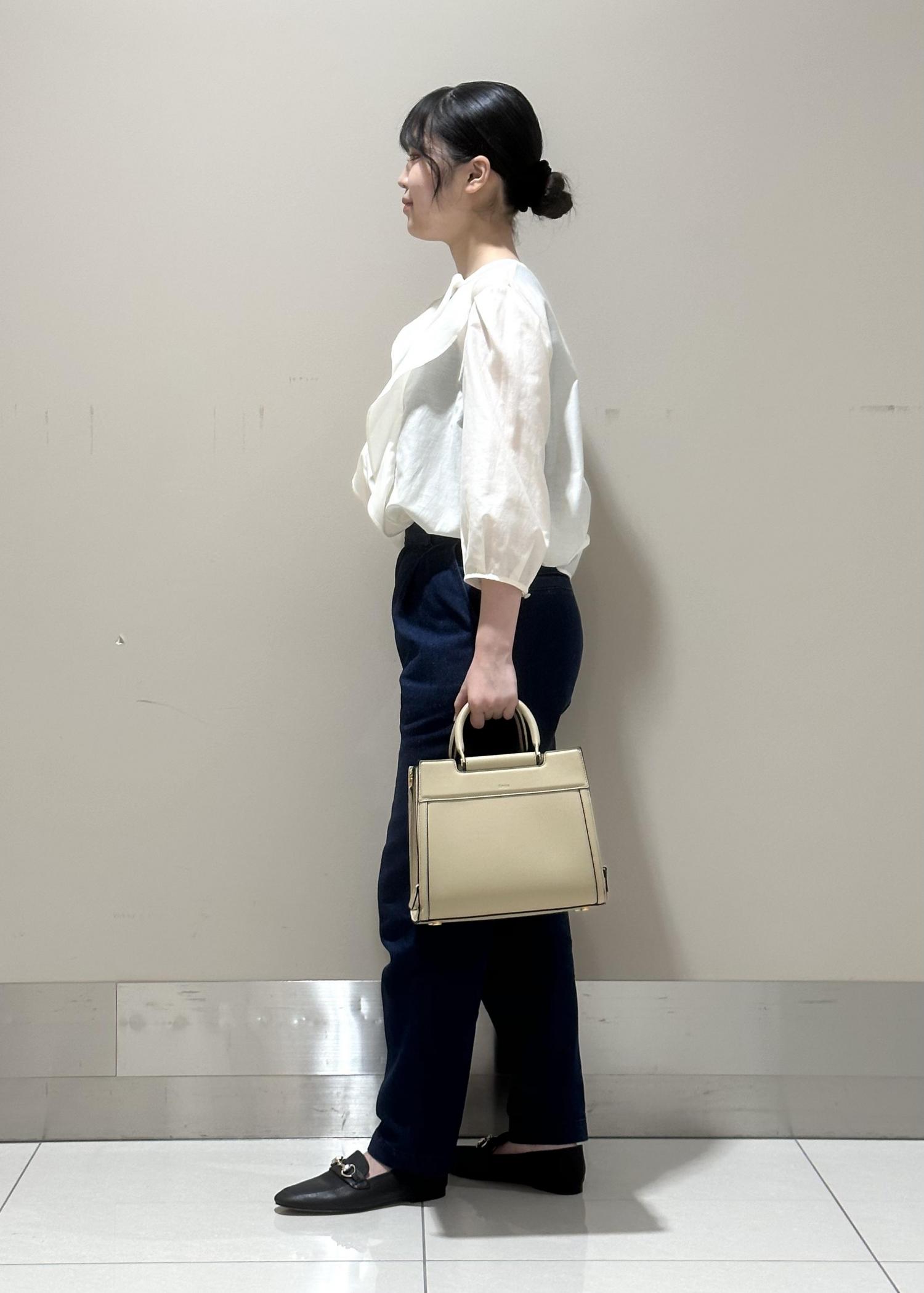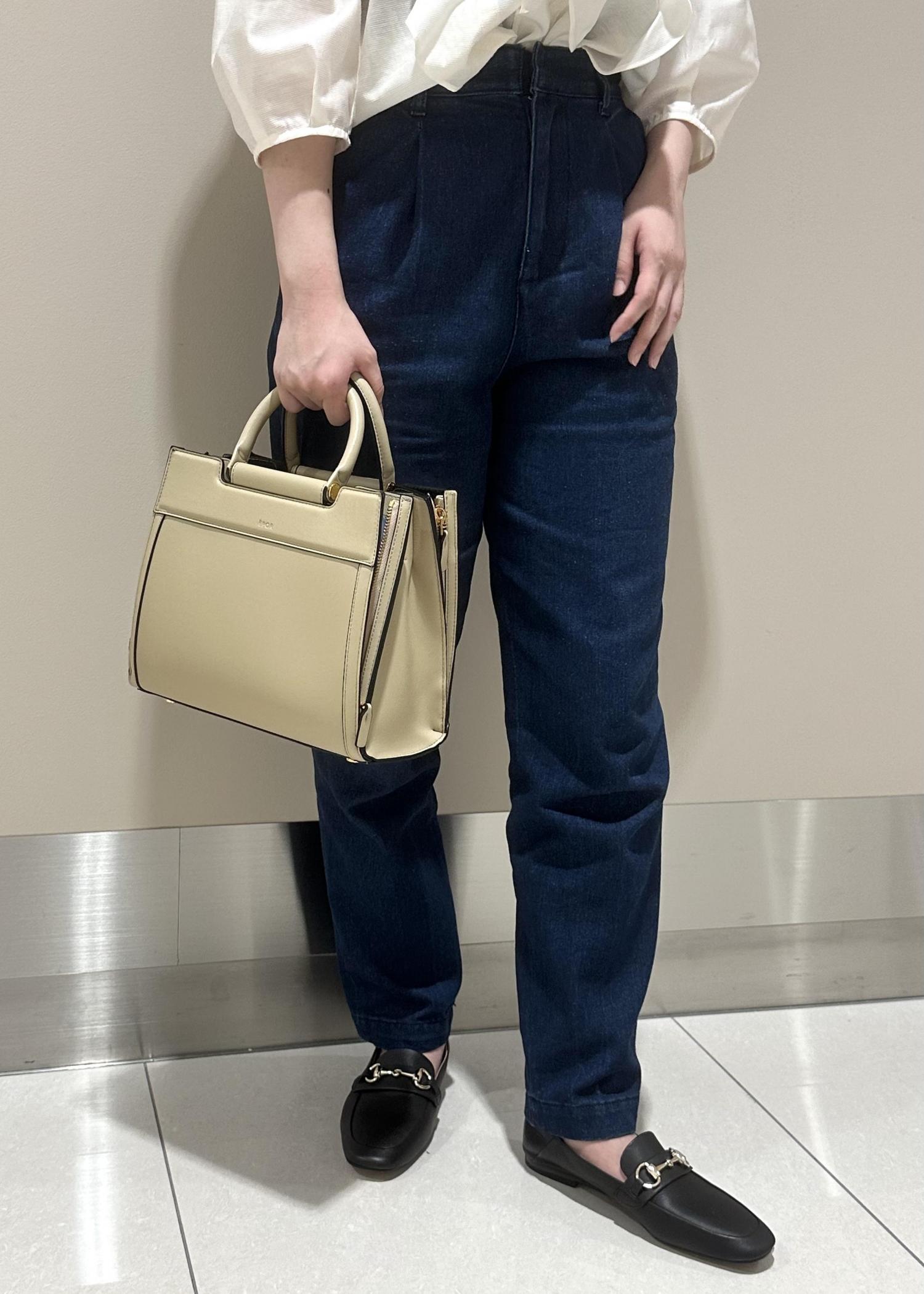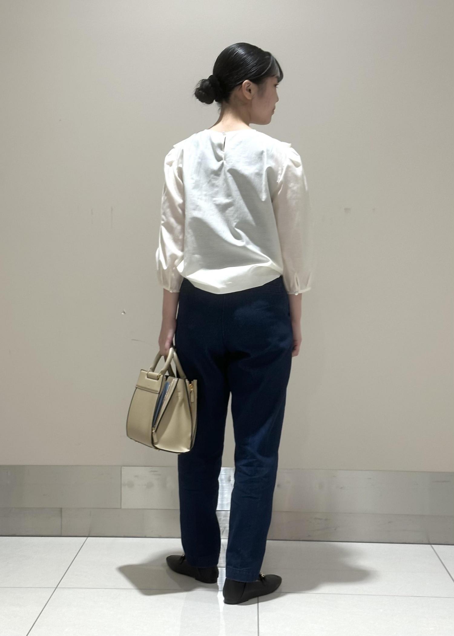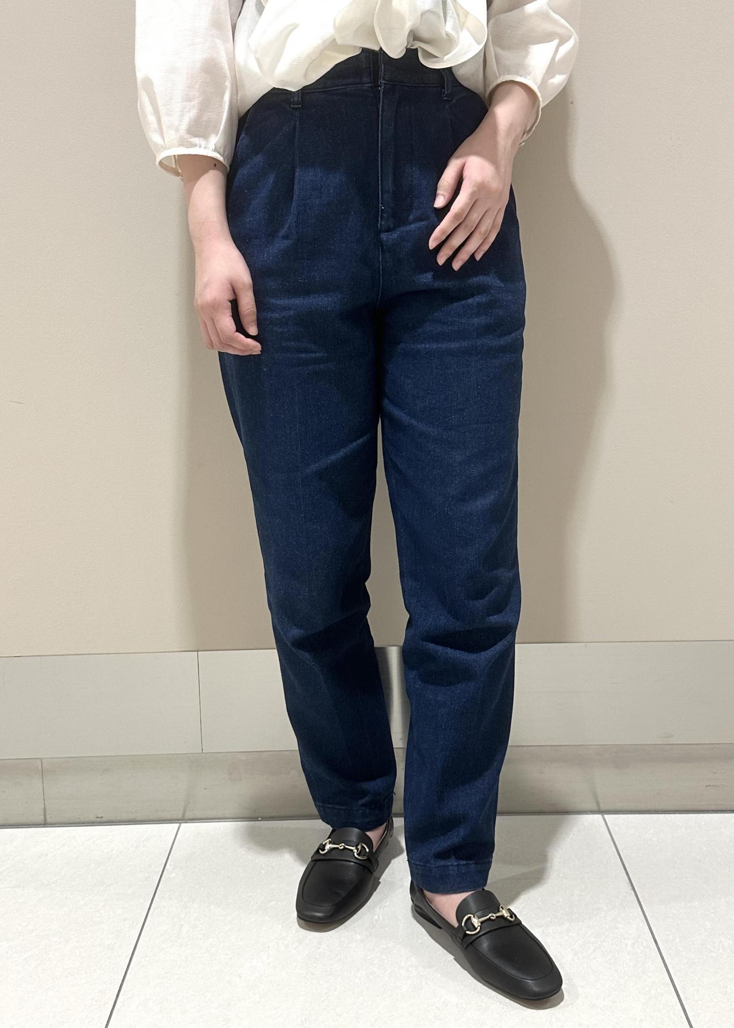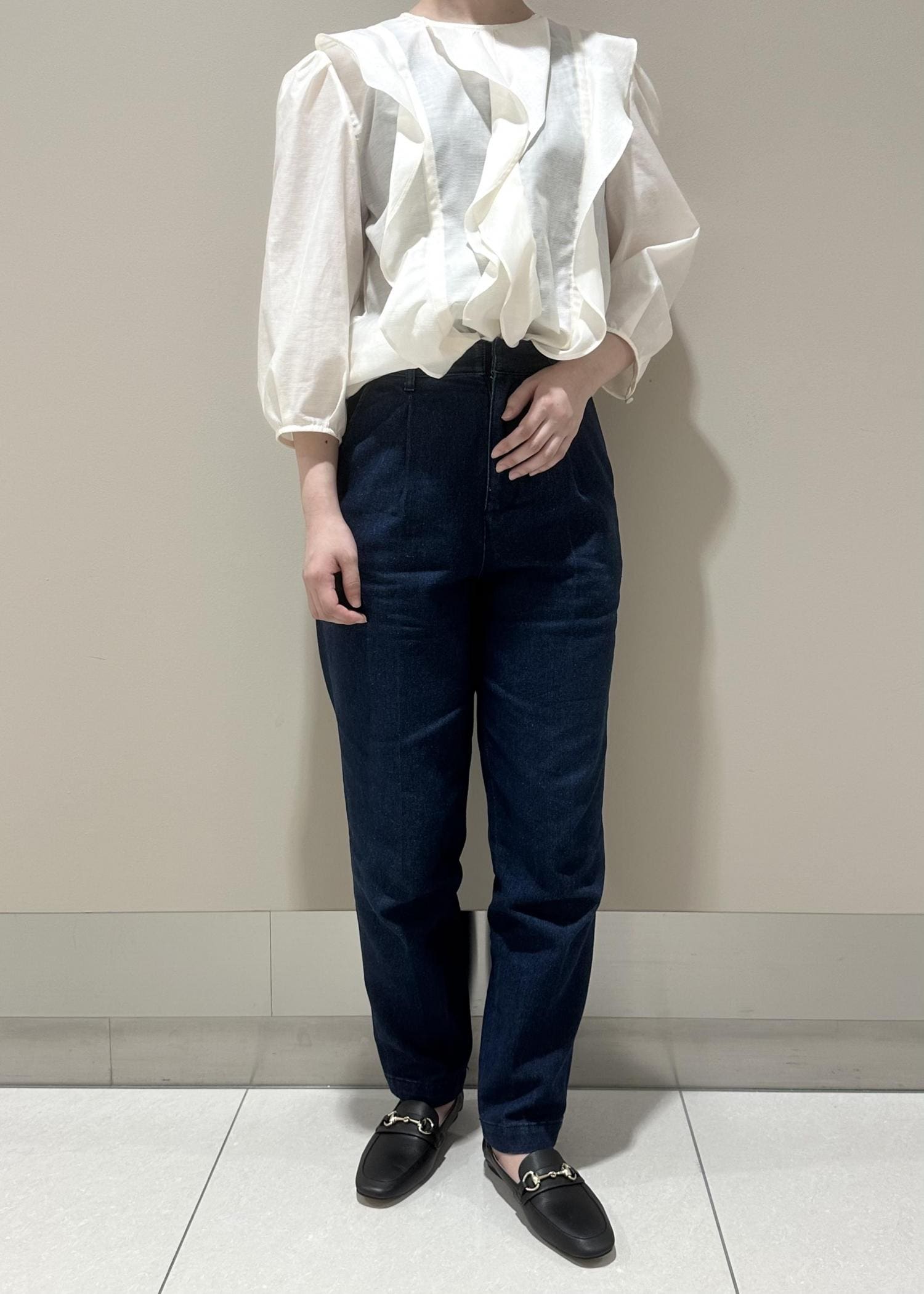 デニムパンツはテーパードの形なのでブラウスと合わせてもきれいめに決まります。
