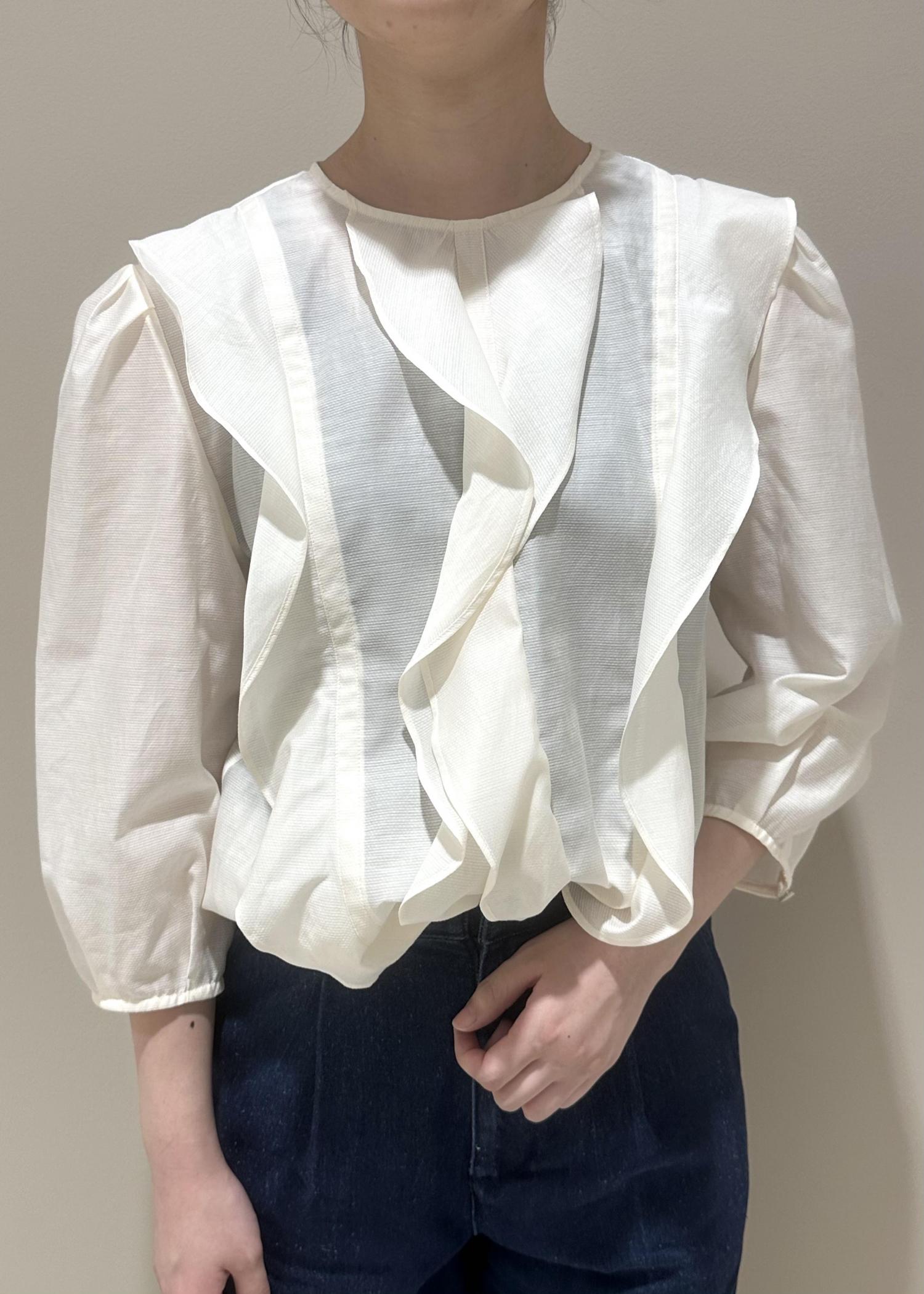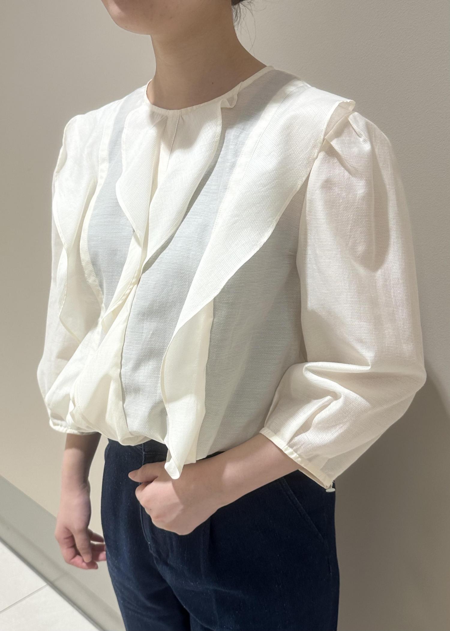 新作ブラウスは大きめのフリルがコーデを華やかにしてくれます。さらっとした肌触りなので今の時期からでも着やすいです◎