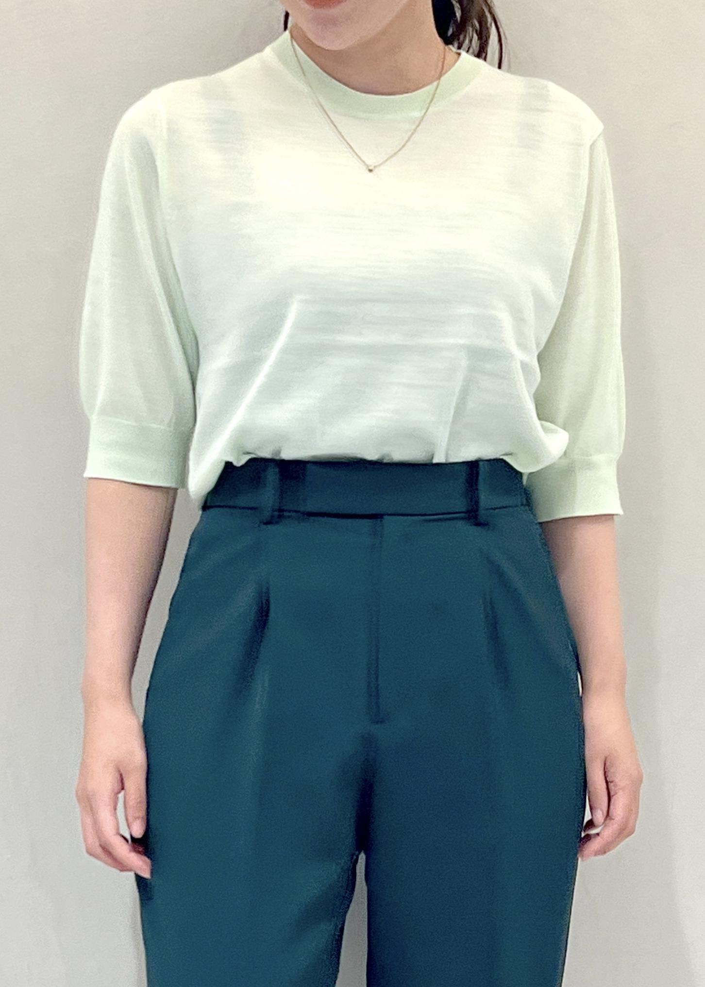 ボディラインはですぎないのにコンパクト見えする五分袖のニットは