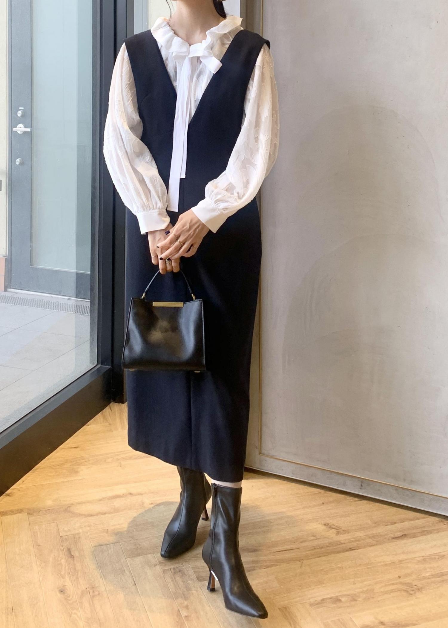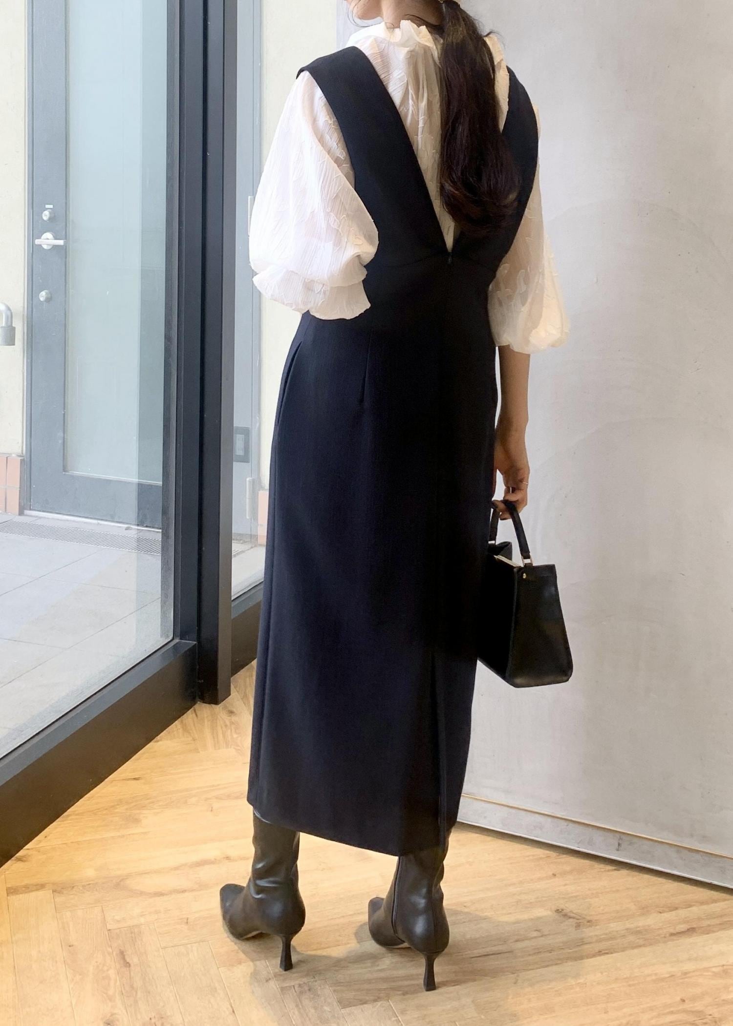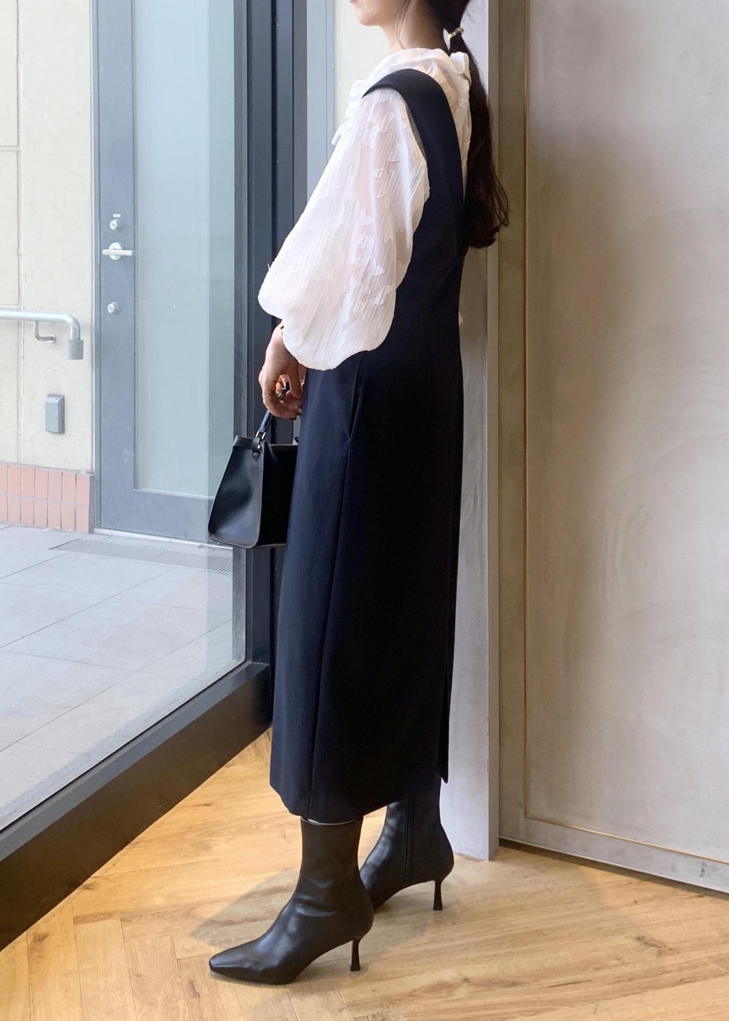 インナー次第で様々な着回しができる一つあると重宝するジャンパースカートで、シワにもなりにくくオンオフ問わず着用していただきやすいです。