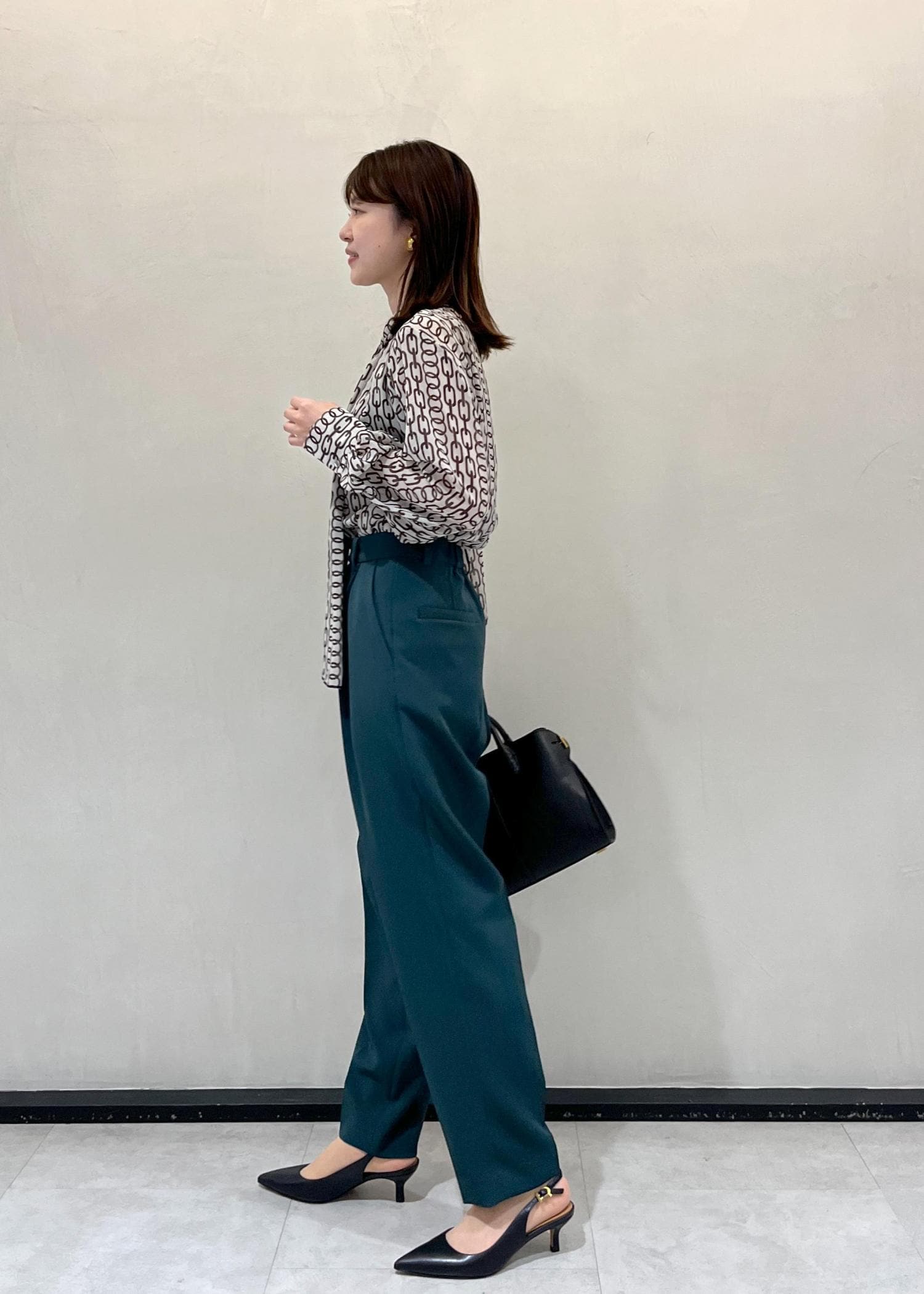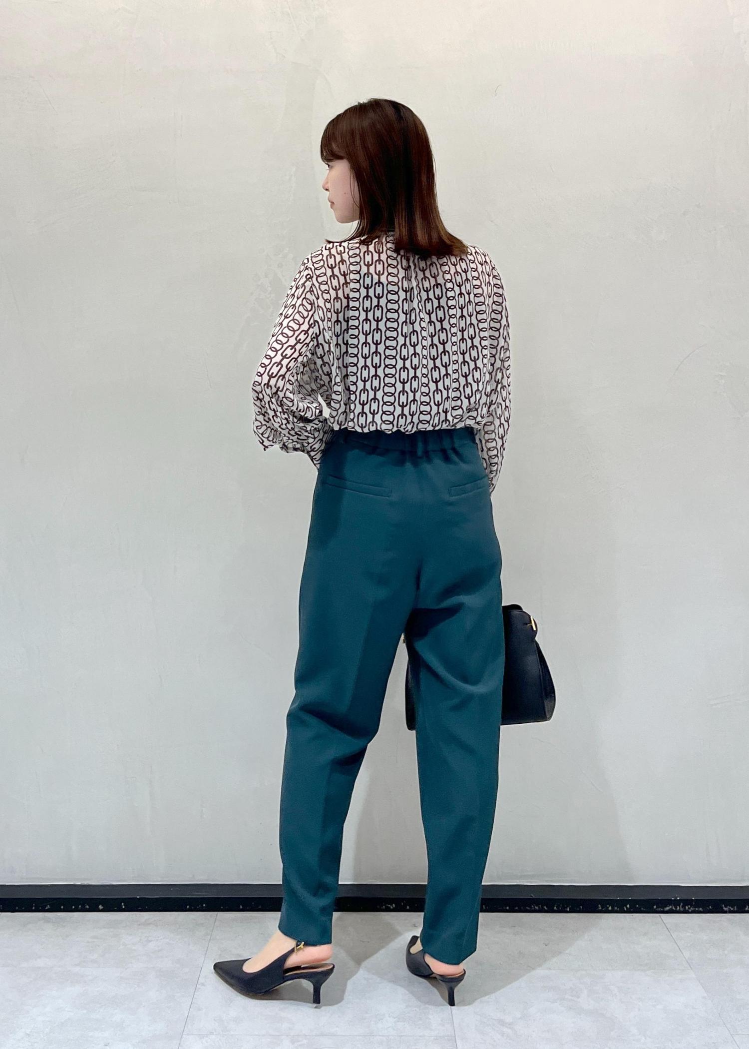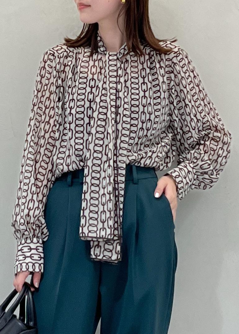 今季のボウタイブラウスは、ロペオリジナルのチェーンプリント。よく見るとプリントがブラウンカラーなので柔らかい印象に。