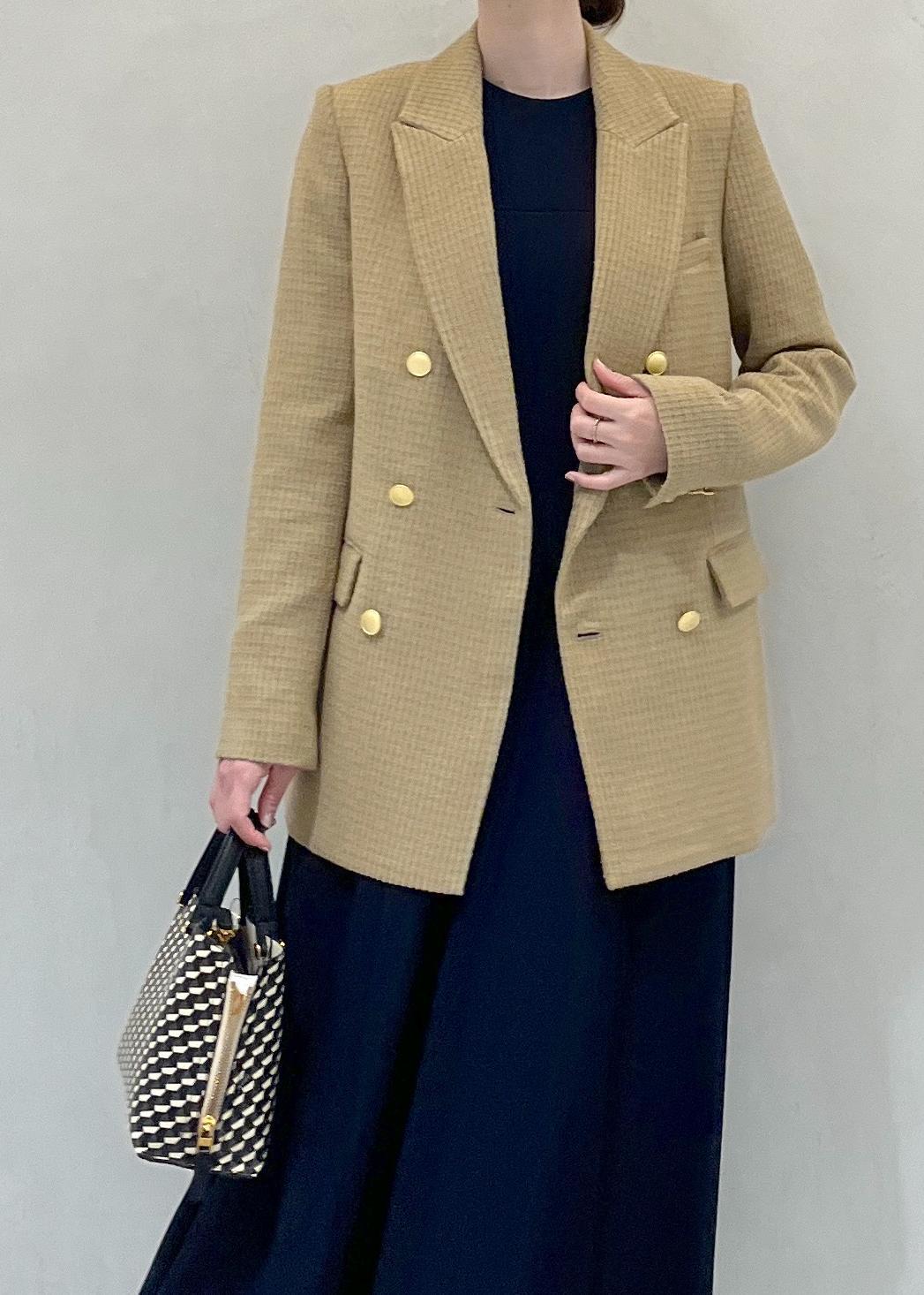 ストレッチ性がありストレスフリーなワンピースに、ジャケットを合わせて綺麗めコーデに。