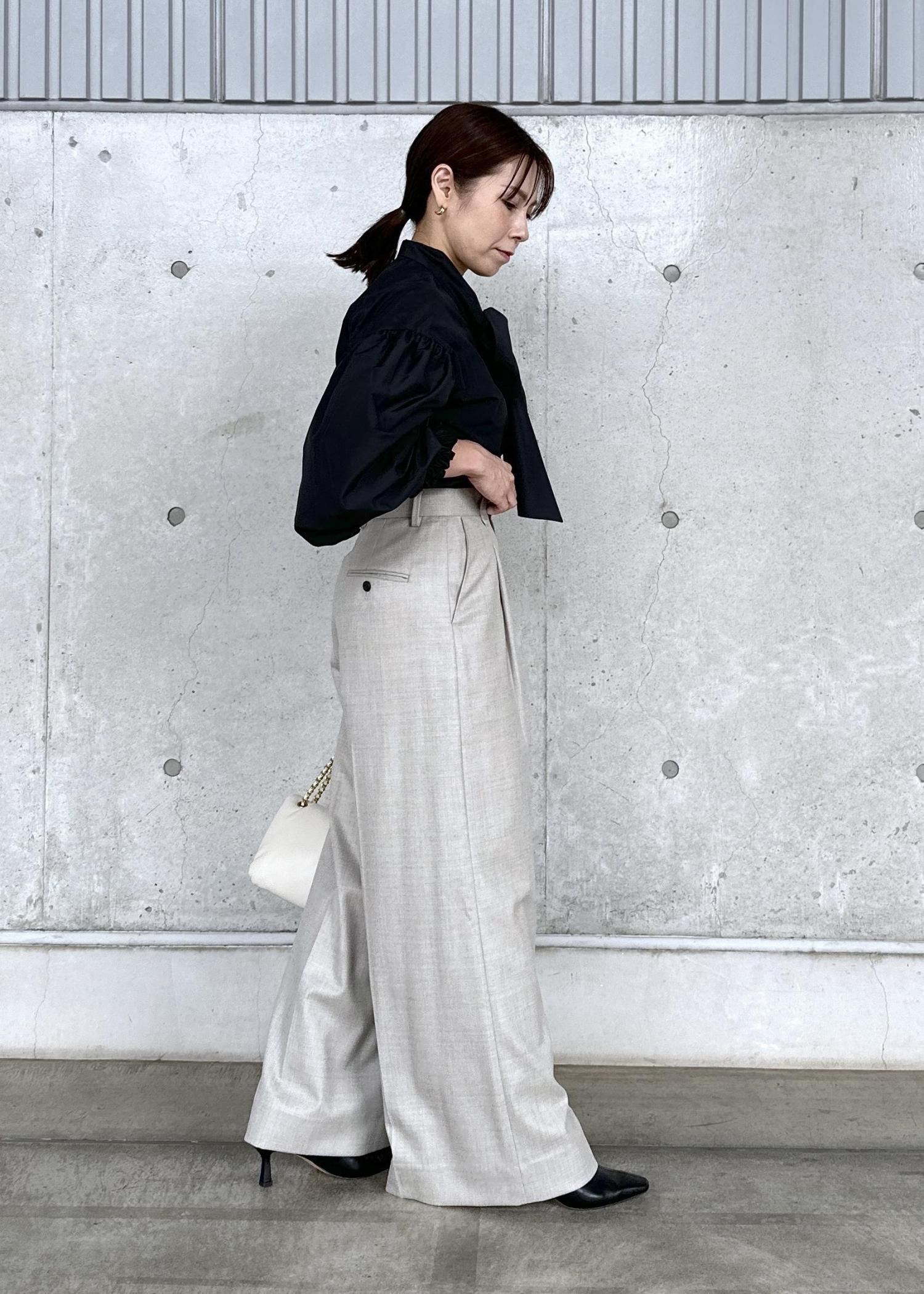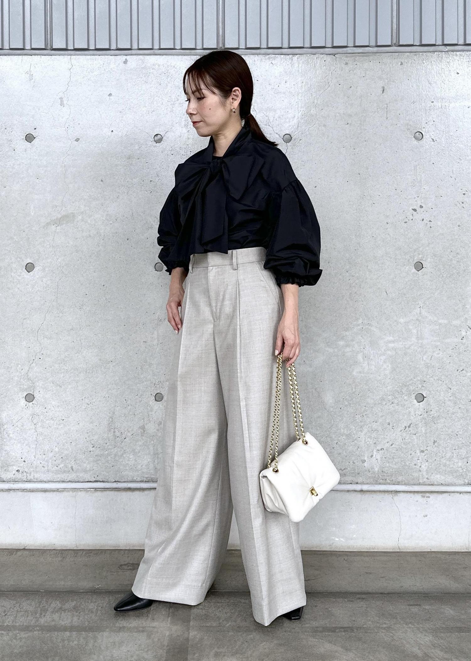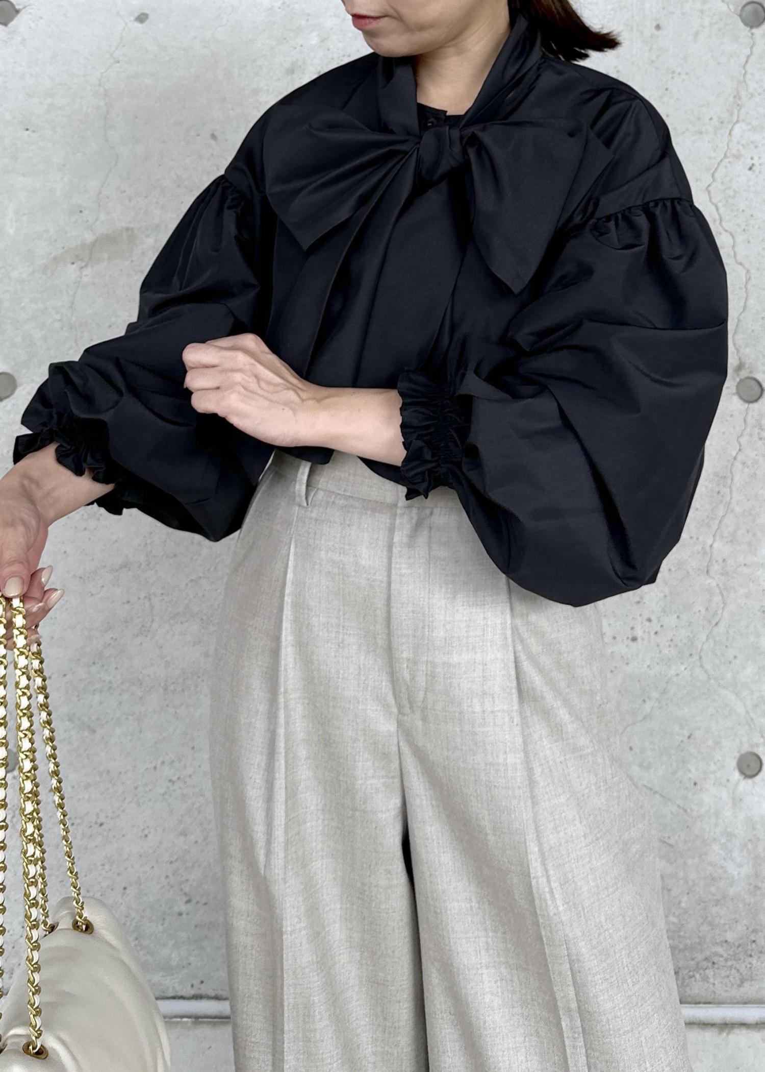 大胆なボウタイや袖のデザインが魅力のブラウス♪ ハリのあるタフタ素材とブラックのカラーで、 甘さを抑えつつも華やかな一枚です!! ♡ボタンを押してお気に入り! お気に入りしていただくと、気になったコーディネートや商品がチェックしやすくなります。 ※記載のないアイテムはスタッフ私物です。 ※店頭及び屋外での撮影画像は、光の当たり具合で色味が異なって見える場合がございます。 商品の色味はスタジオ撮影の画像をご参照下さい。 LINE接客も承ってます! お取り置きなどもお伺い出来ますので、お気軽にメッセージ送ってください!