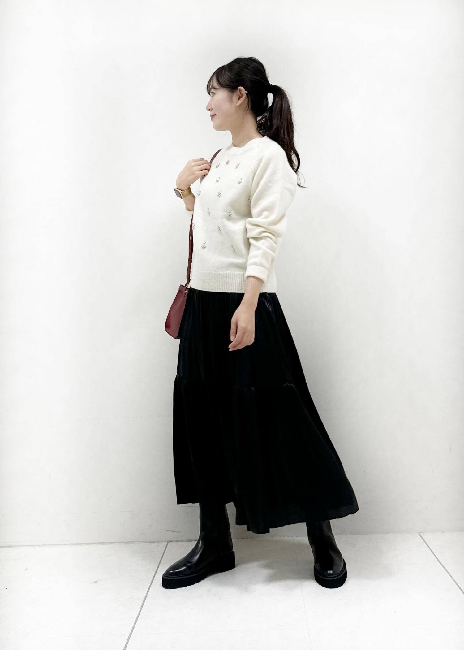 ビジューの白ニットは上品で可愛いコーデを楽しみたい時にはぴったりのアイテムです!