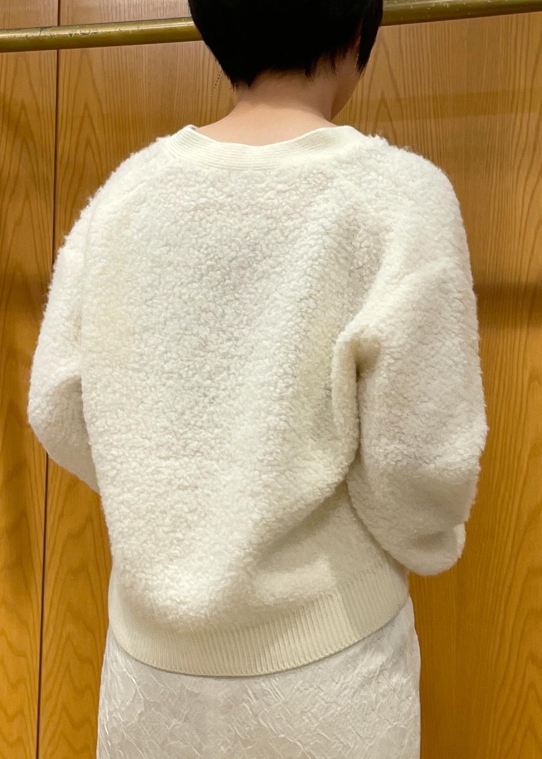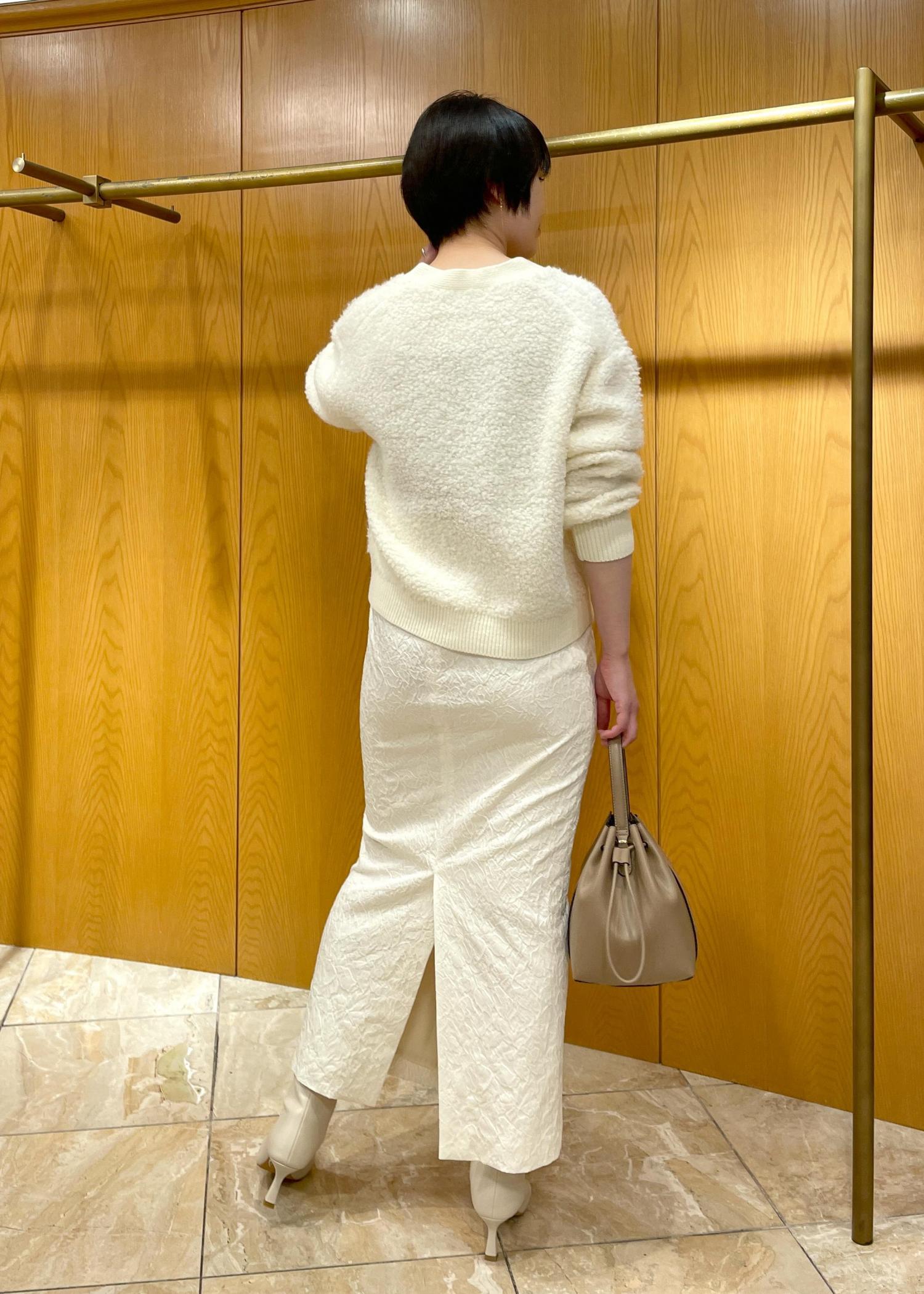 ふわふわでビージュー釦がポイントのカーディガンに ジャガードタイトスカートを合わせたホワイトコーディネートです。 フェミニンなホワイトカーディガンは抜け感の出るサイズ感で、羽織りとしも一枚着トップスとしても楽しんでいただけるオススメの一枚で♪ ※店頭及び屋外での撮影画像は、光の当たり具合で色味が異なって見える場合がございます。 商品の色味はスタジオ撮影の画像をご参照ください。 LINEでロペスタッフに相談は【友だち追加】をタップをして下さい