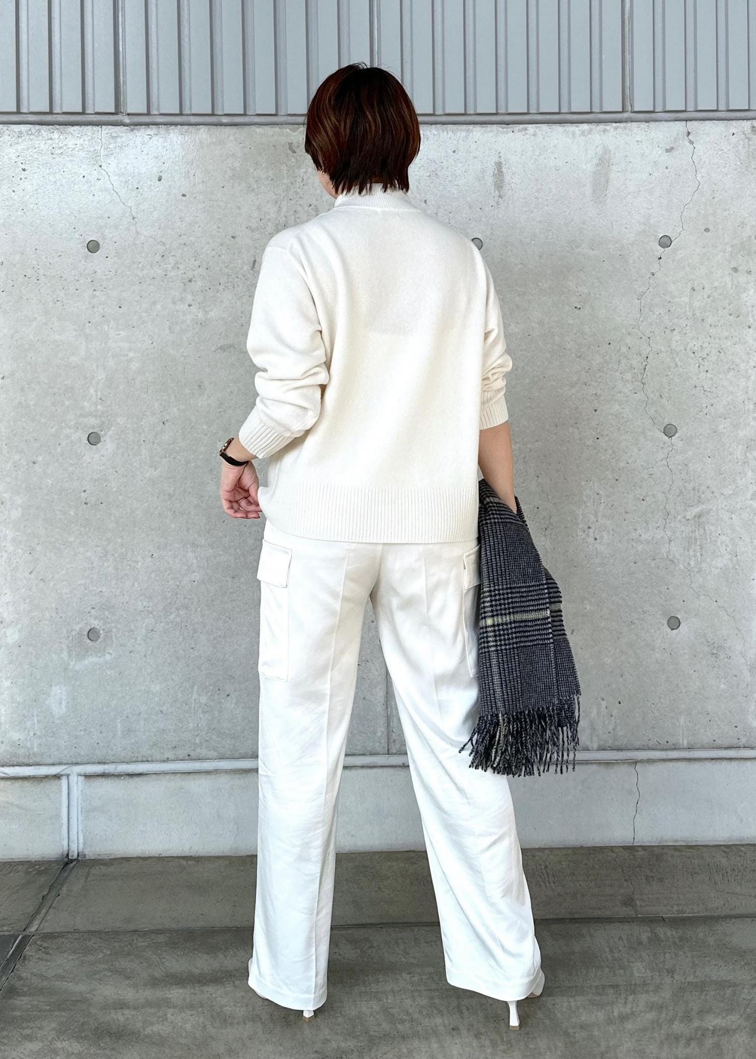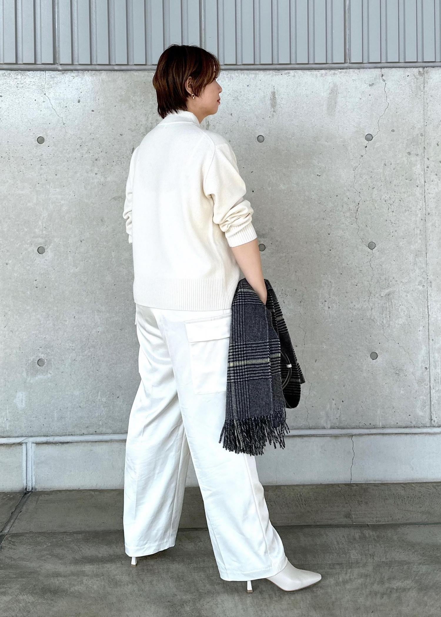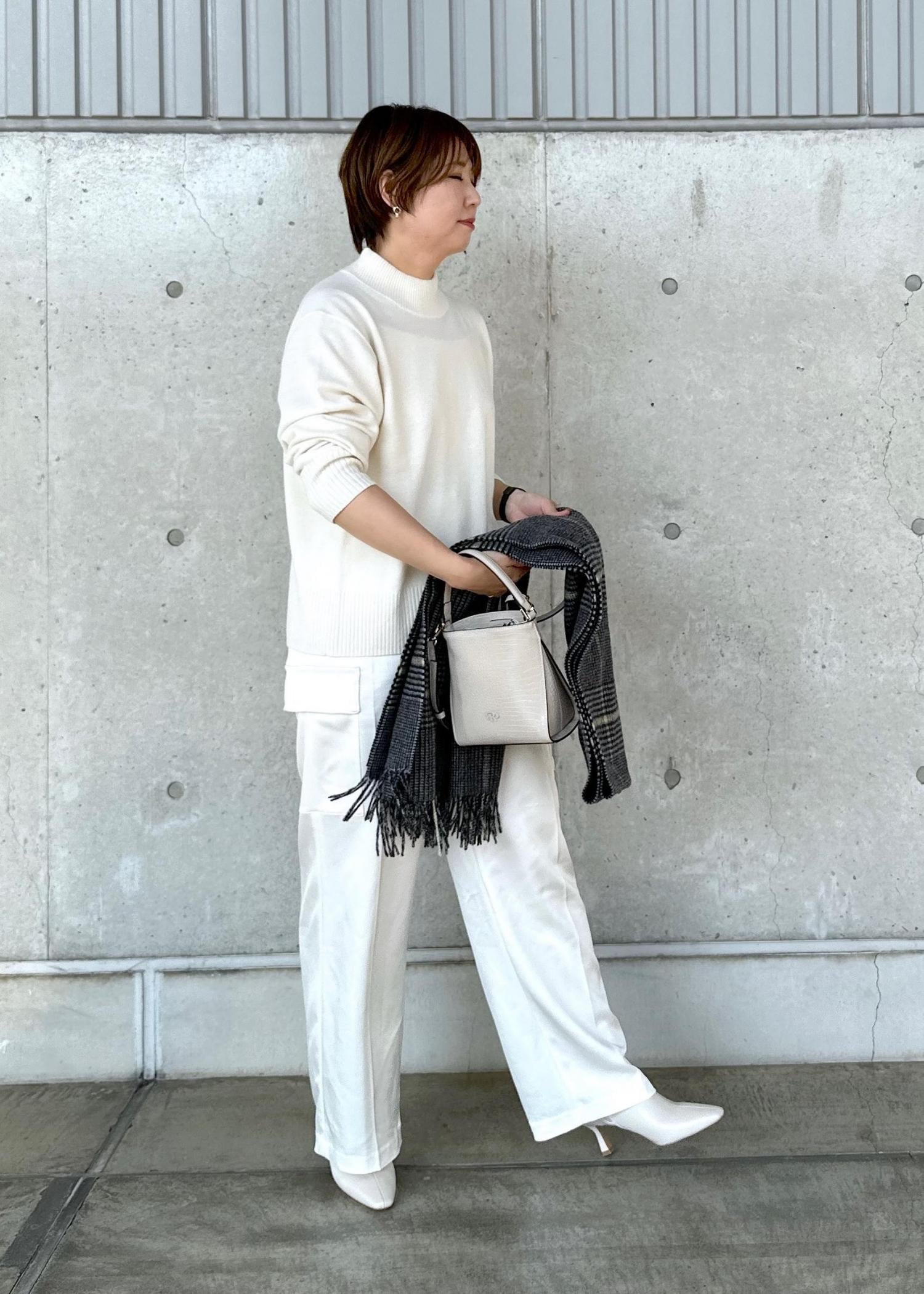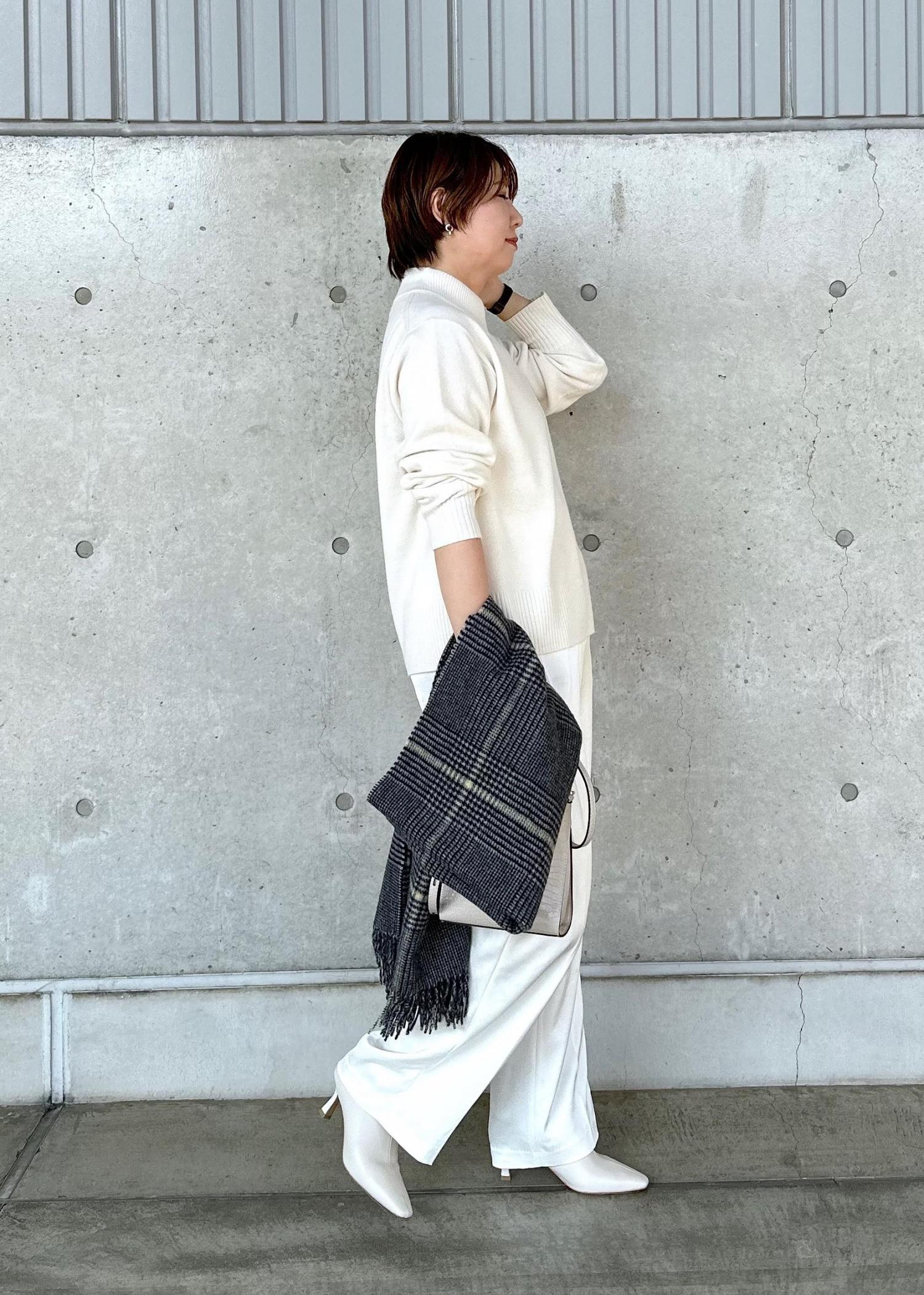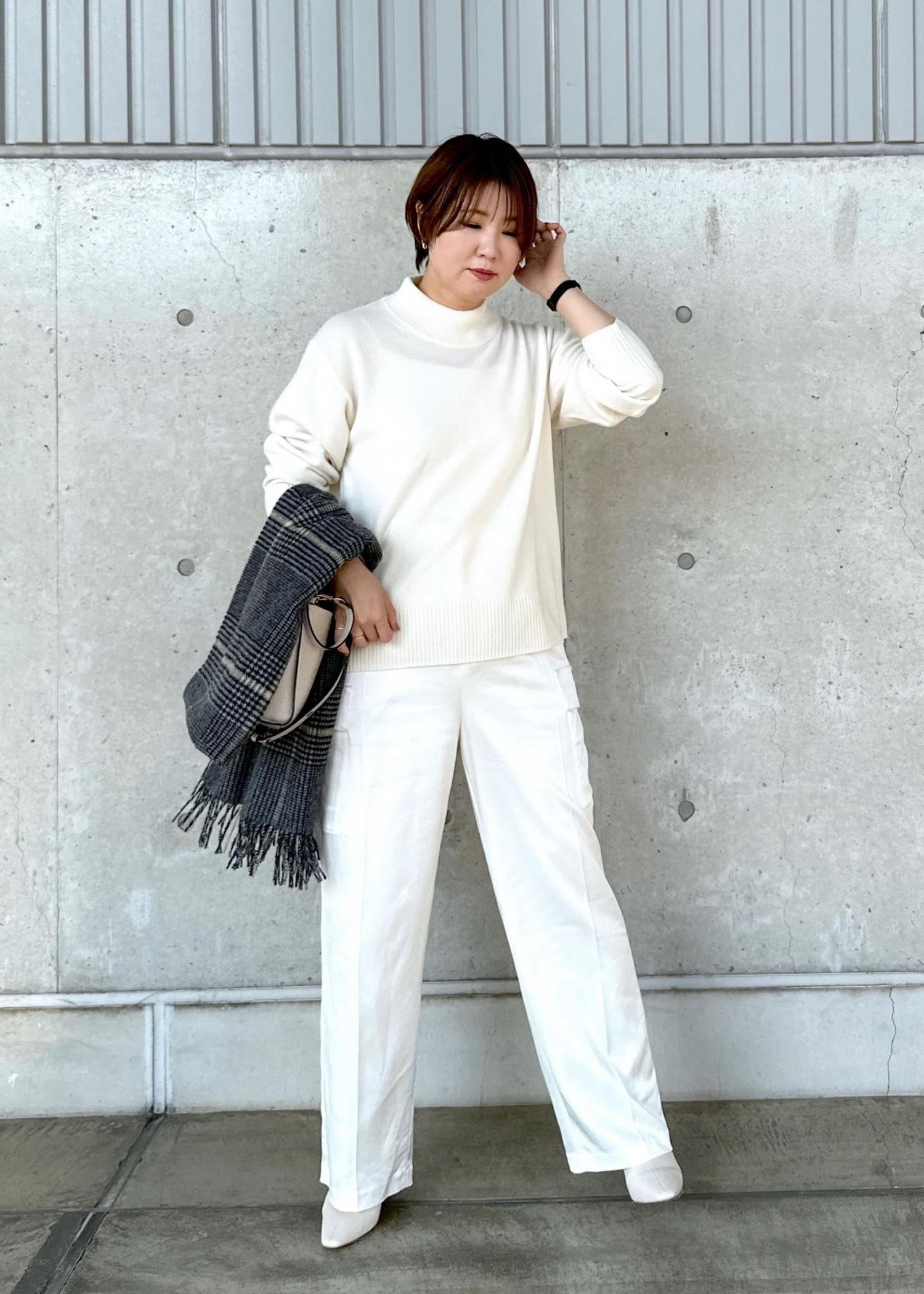 今すぐ着られる肌触りが良いニットとシルエットがキレイなパンツを合わせて、ホワイトのワントーンコーデにしてみました!!