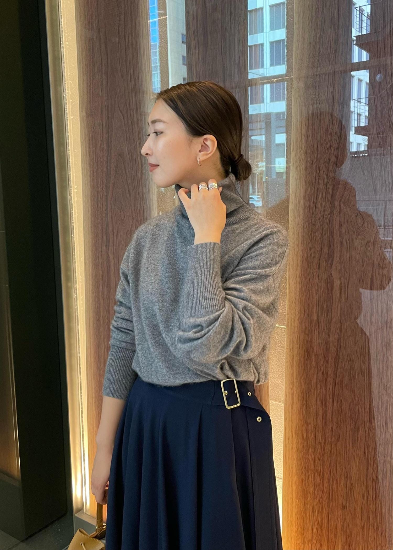 タートルネックニットと合わせてストール要らずの冬スタイル。