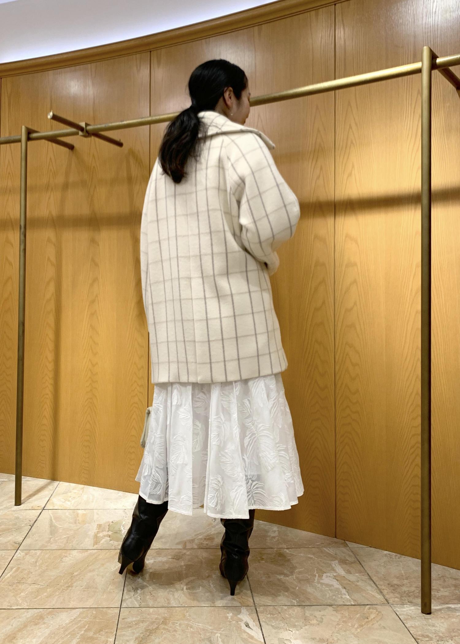 今回はチェックにリーフ柄と一見、乱雑に見えるコーデですが白を基調に統一感を出してワントーンコーデにしてみました。
