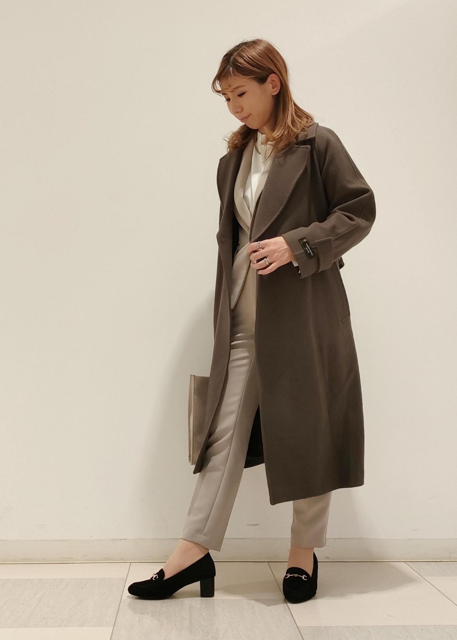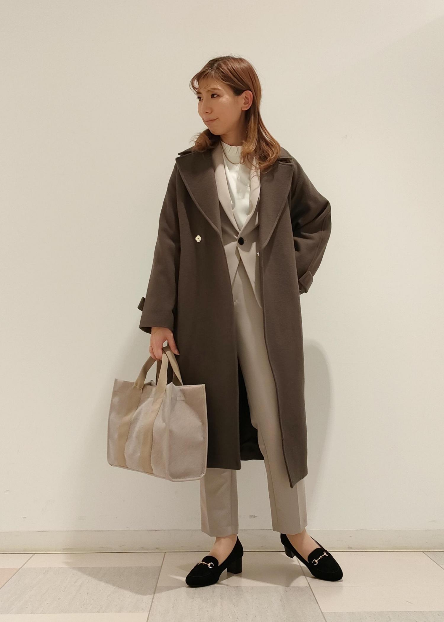 上下セットアップできちんと感のあるスーツスタイルにアウターを同系濃色で合わせたスタイリッシュな印象のコーディネート。お子様がいらっしゃるお母様のお式典などにも使いやすいアイテムでまとめました。ストレッチがきいていて動きやすさも抜群です!