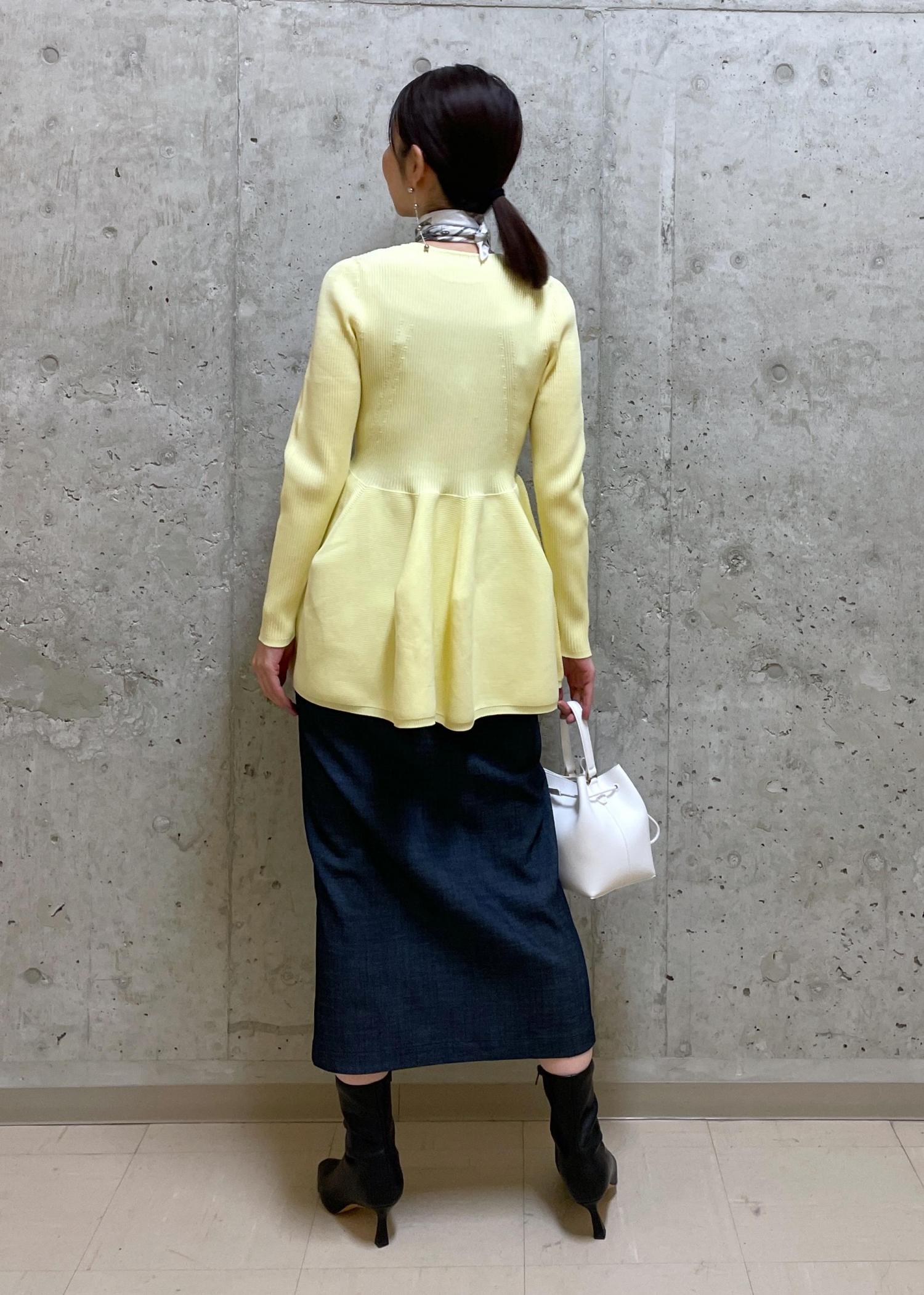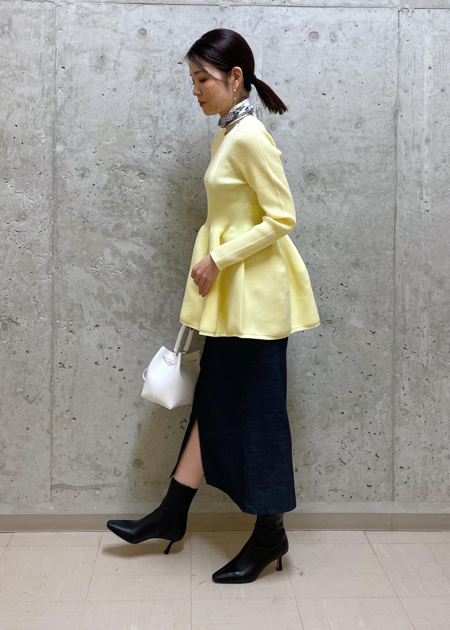 イエローのペプラムニットは春らしいカラーで、一気に華やかな印象になります◎