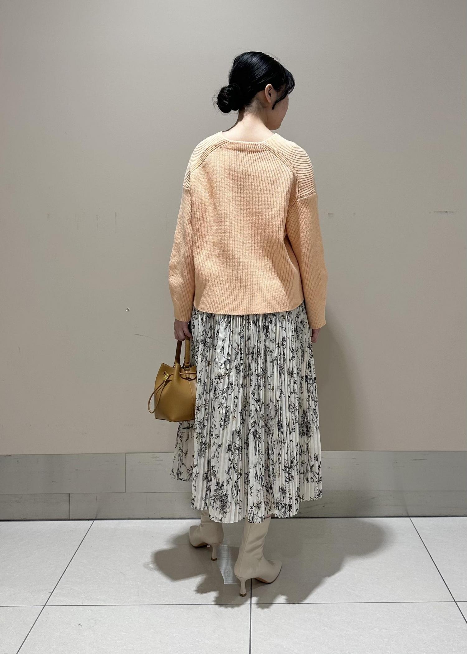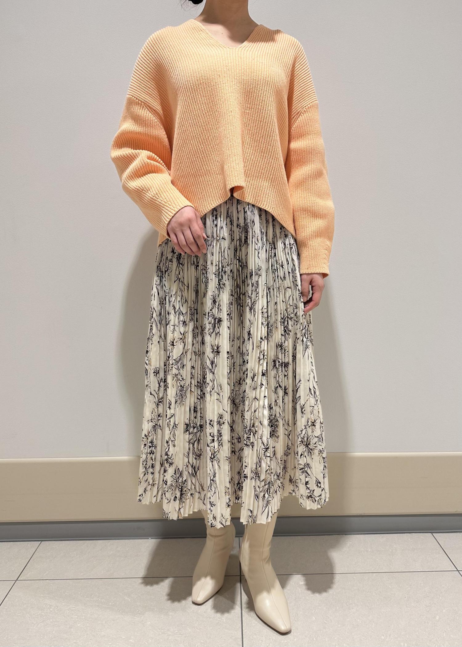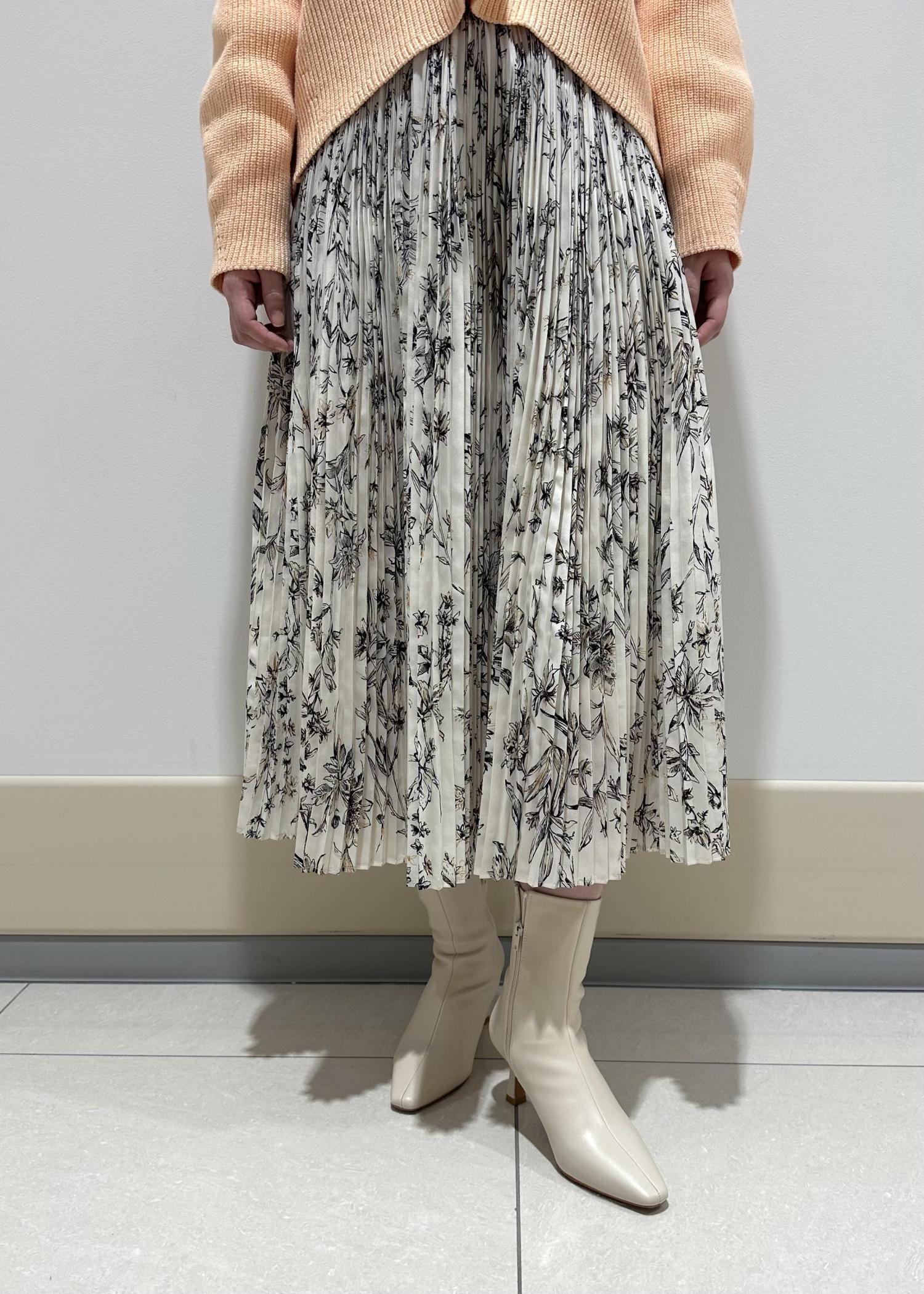 フラワーモチーフのスカートを合わせて、フェミニンでさわやかな春コーデにしてみました♪