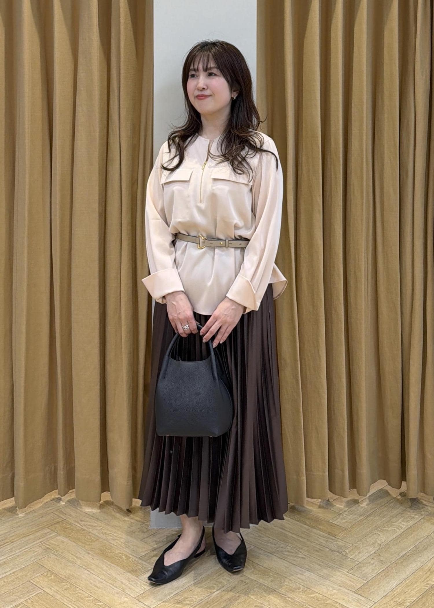 Vネックでスッキリ見えしますがレイヤードしてインナーを見せるのもおすすめ。