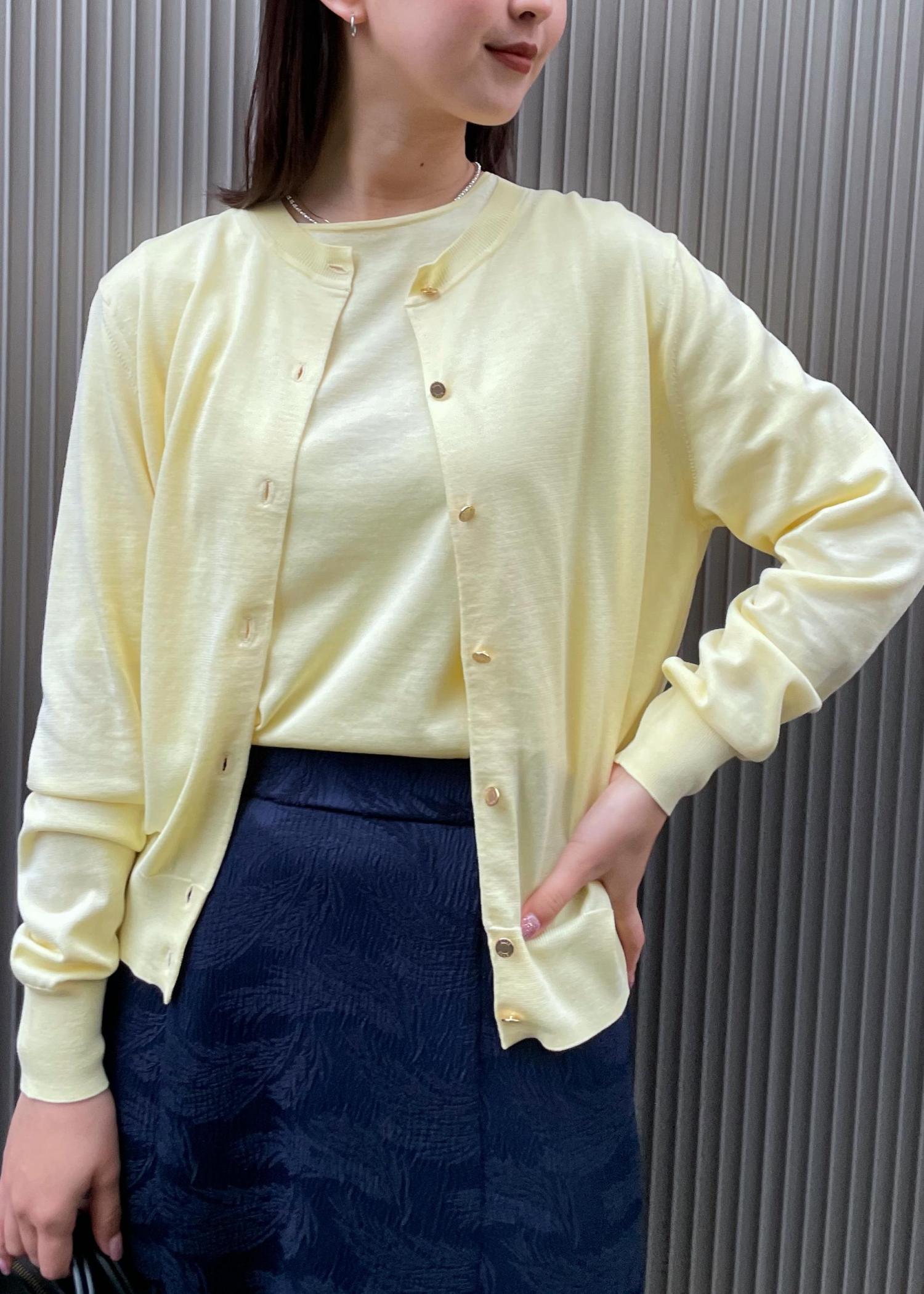 アウトレットROPÉ【洗える/涼感】シルクコットン クルーネック カーディガン【アンサンブル対応】イエロー / F¥12,650レビュー163cmでFサイズ着用。