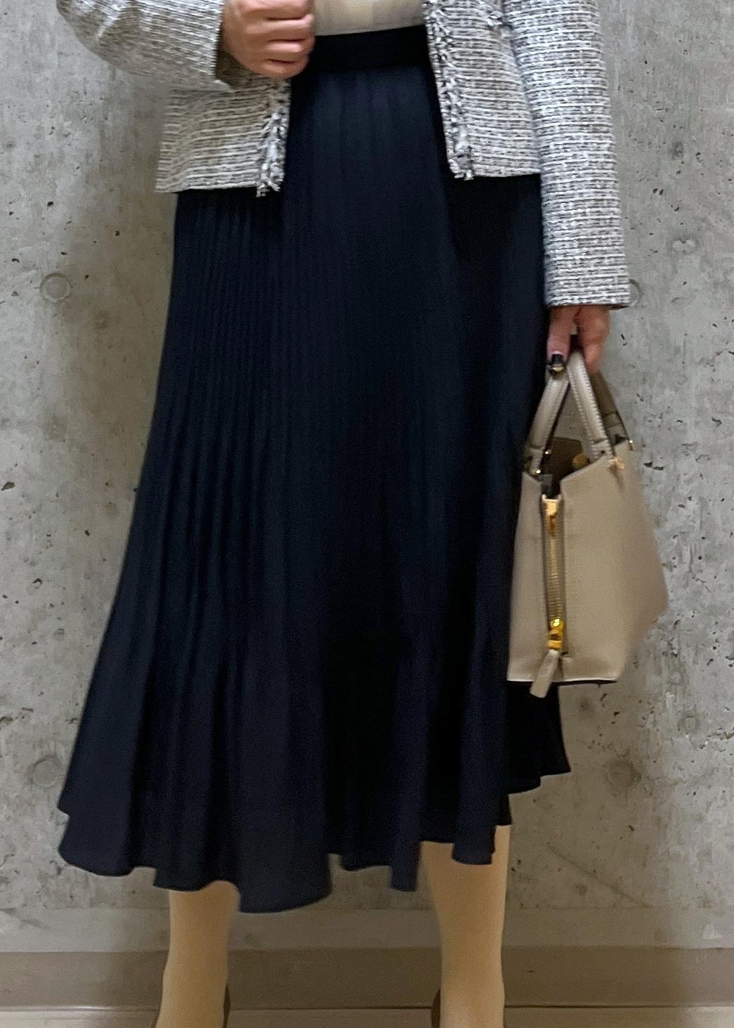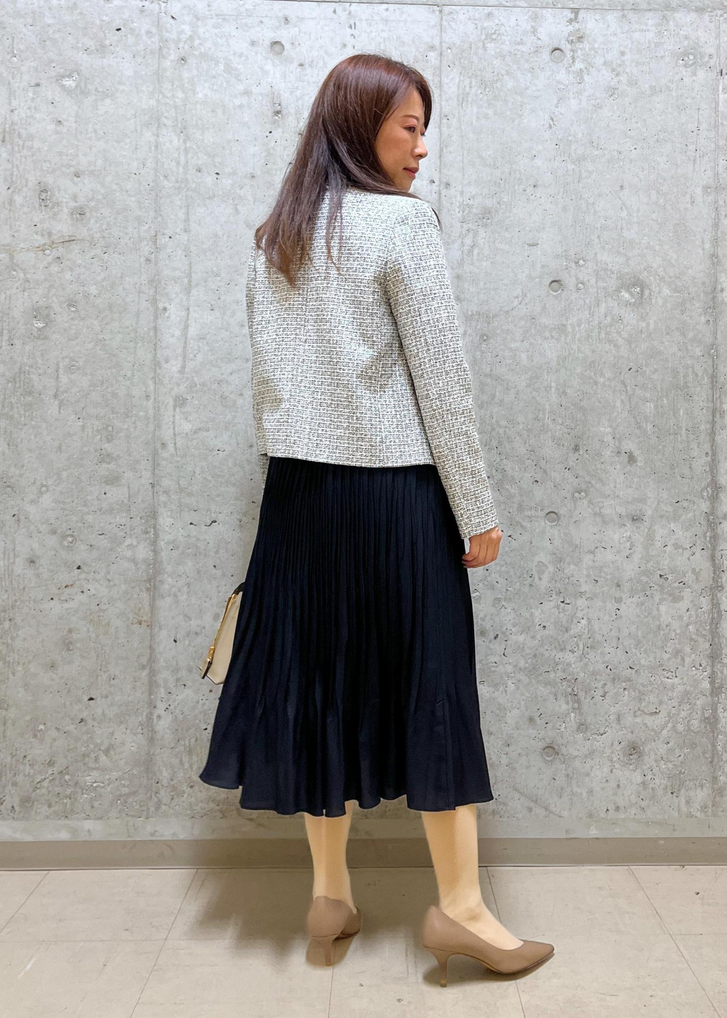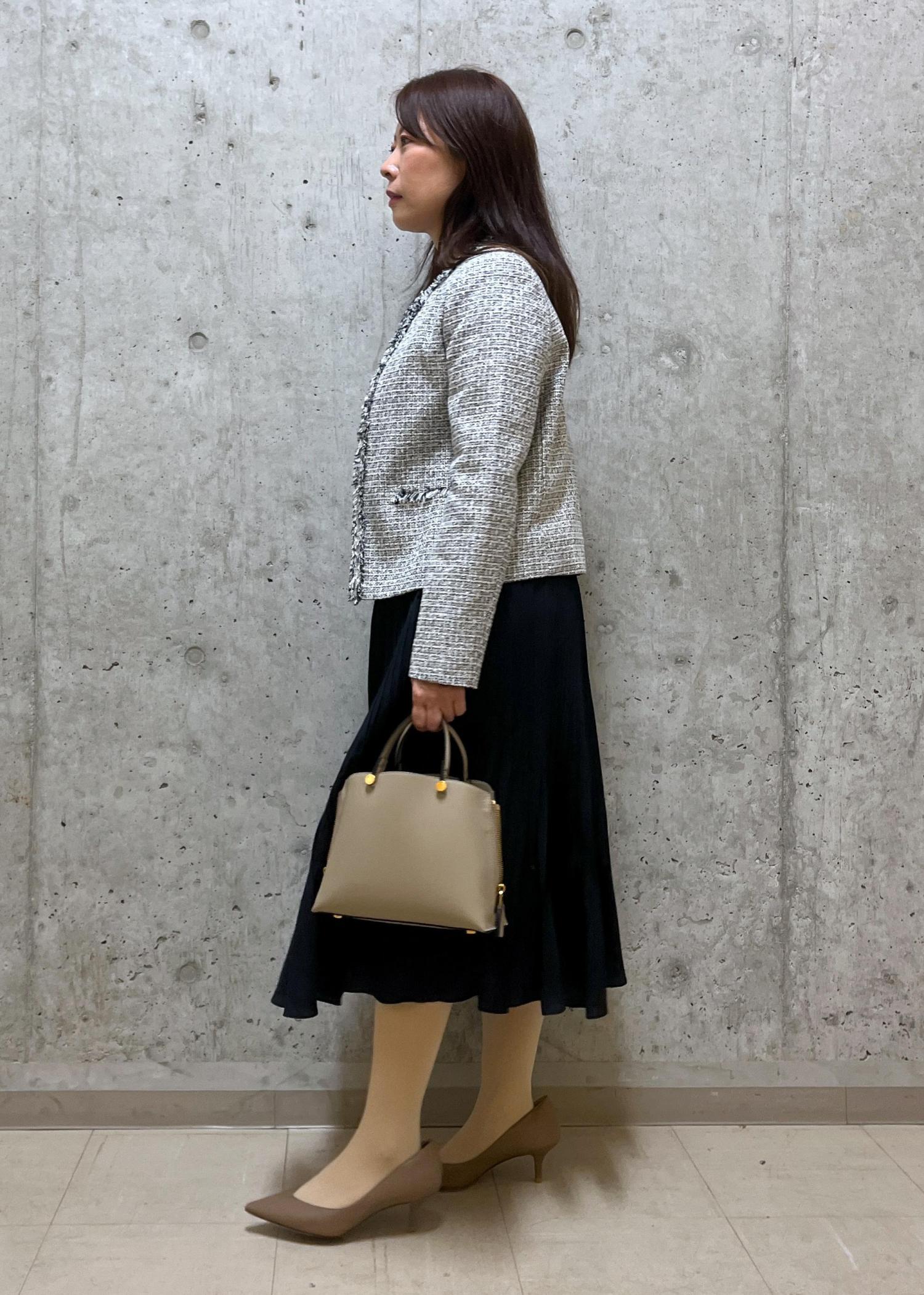 スカート、ツィードのジャケットにさりげなく入ったラメが高級感を漂わせてくれるコーディネートです。
