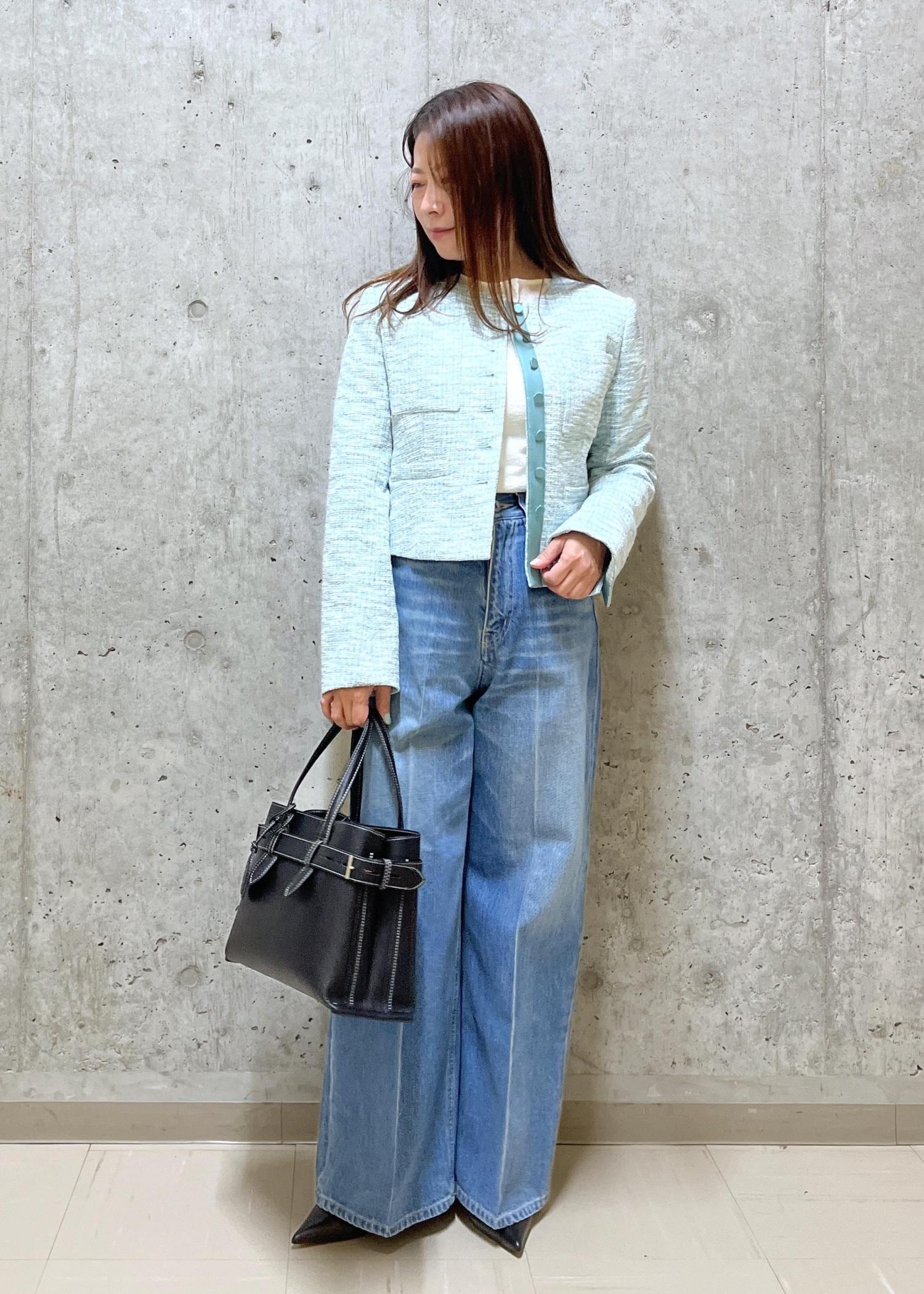 裾はヒップが隠れる丈で、着心地は軽く、中厚手くらいのしっかりしたツイード素材です。 -