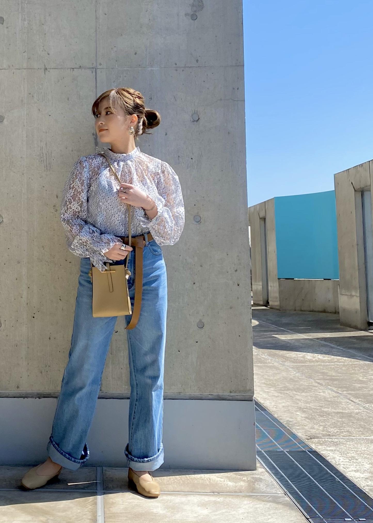 ropéオリジナルのモノグラム柄のレースブラウスに合わせた大人カジュアルコーディネートを組んでみました♪ 甘いデザインがデニムパンツやワイドパンツ等、カジュアルめなボトムスとも相性抜群です★ レース素材が春コーデにバッチリです。是非店頭で試着してみて下さいませ♪