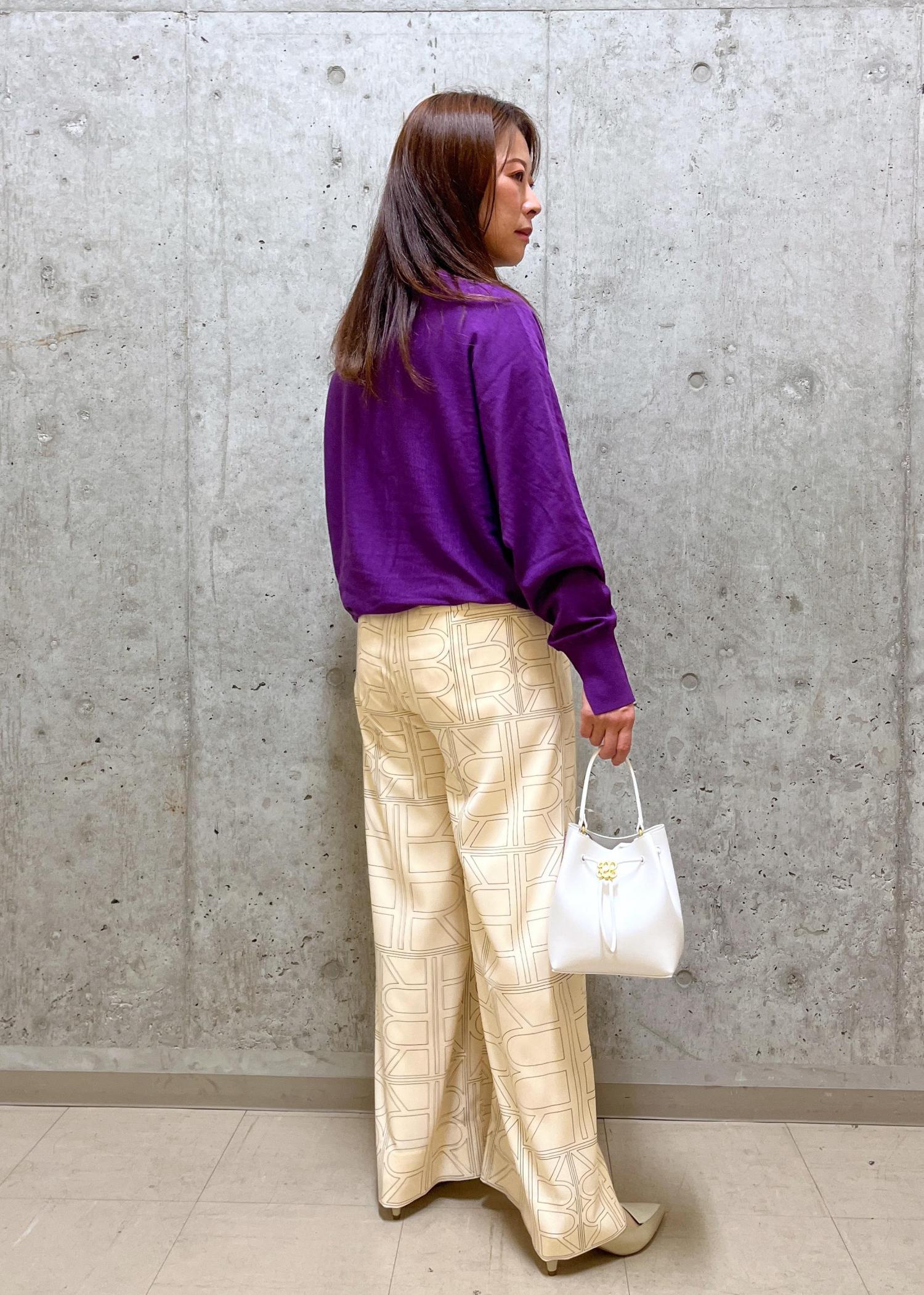 ニットとパンツのシンプルなコーデは、ハッキリしたカラーとモノグラムパンツがオシャレな雰囲気に!