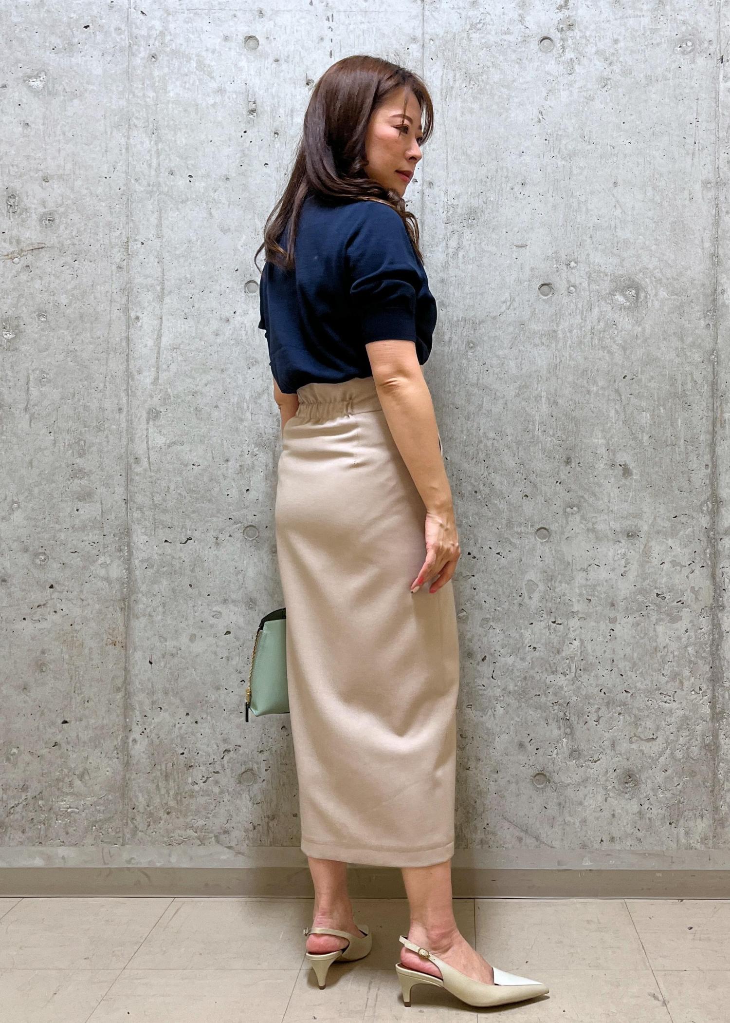 ネイビーとベージュのベーシックカラーと、定番ニットとスカートでまとめたコーディネートは、オン、オフと幅広いシーンで活躍してくれるスタイルです。