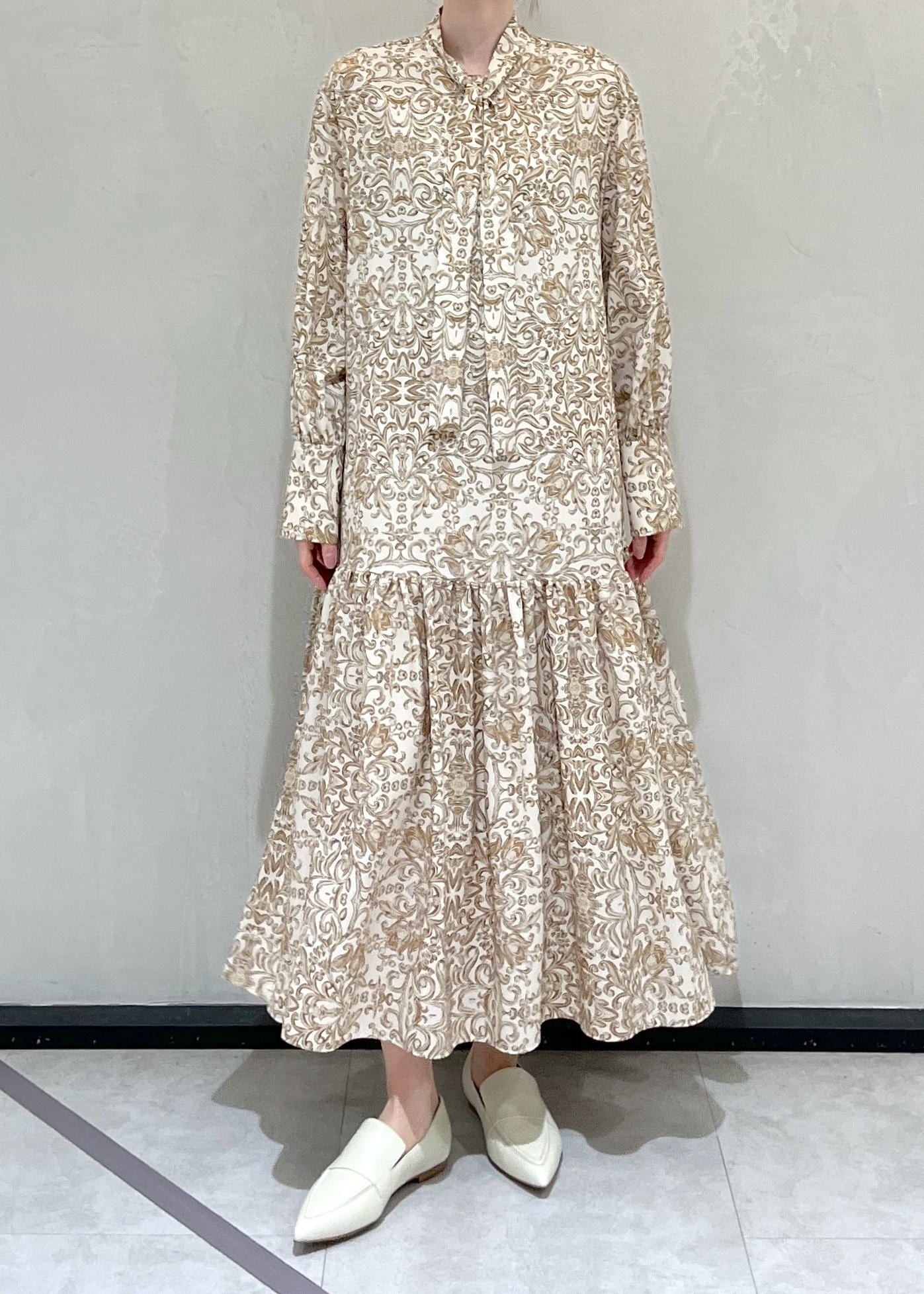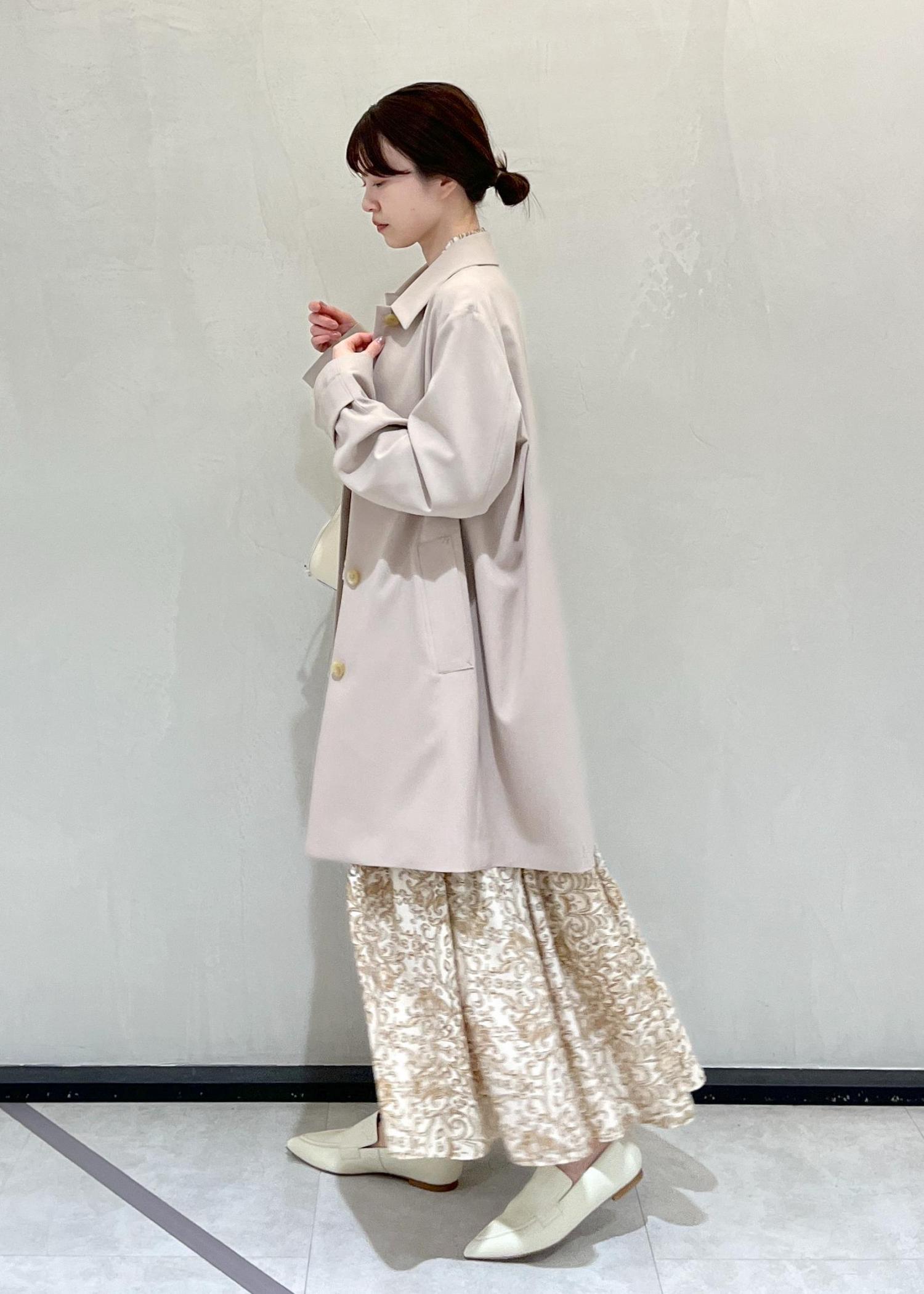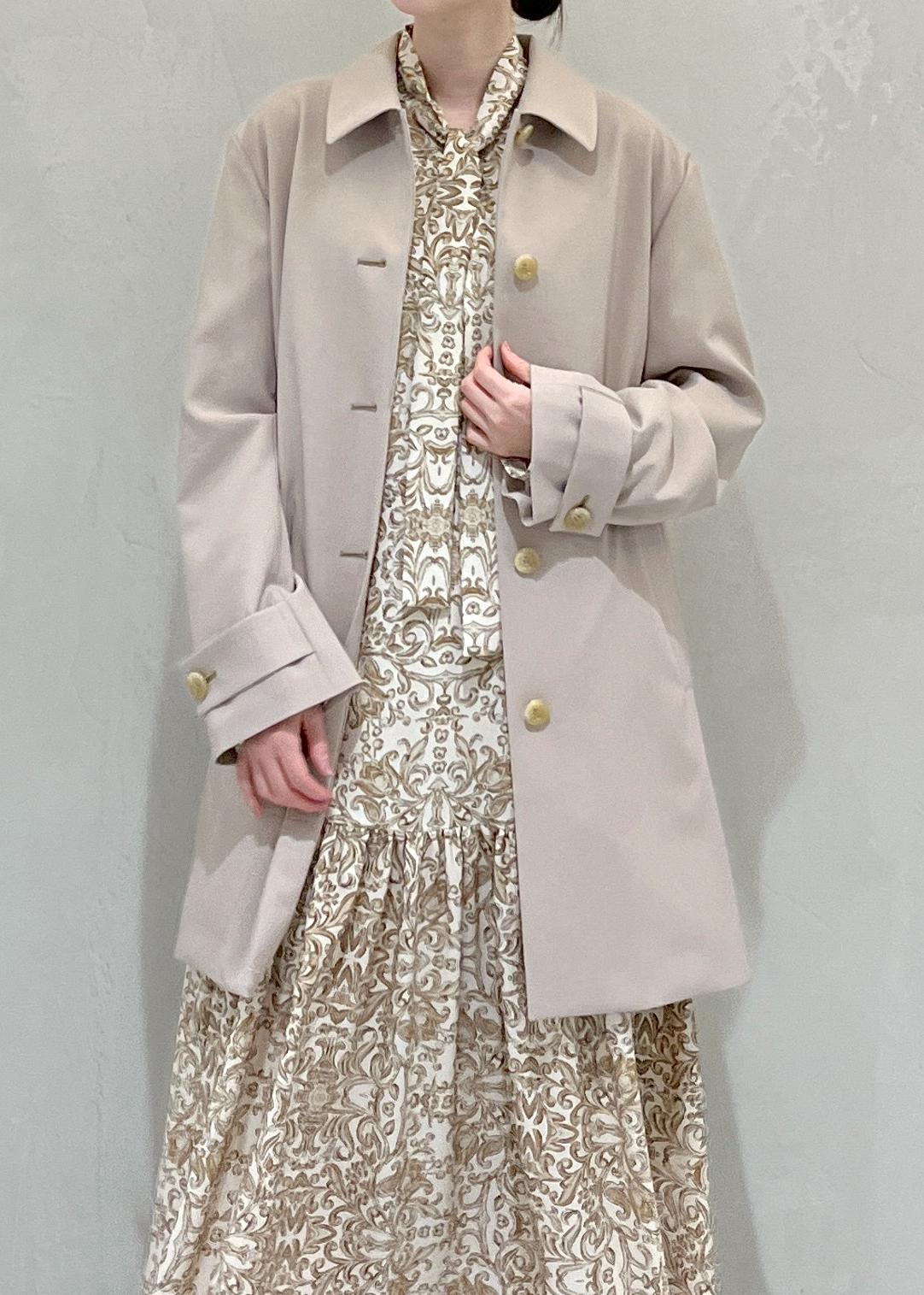 ステンカラーコート×総柄ワンピースで春らしくコーディネートしました。靴とバッグはホワイトでまとめて爽やかな印象に◎