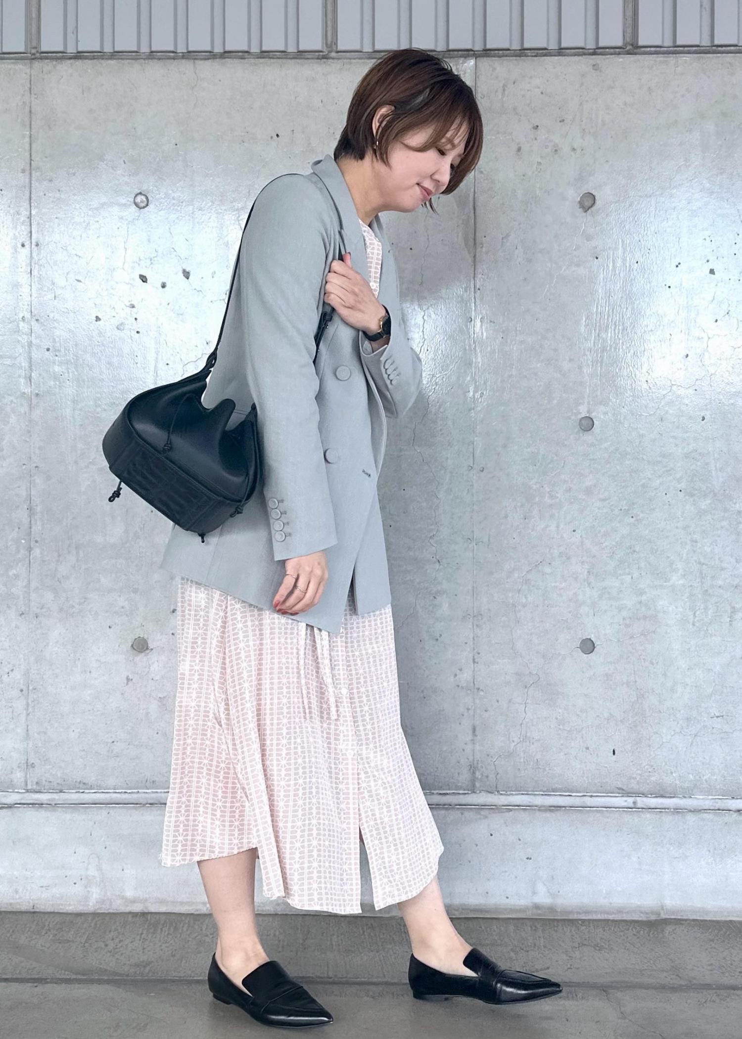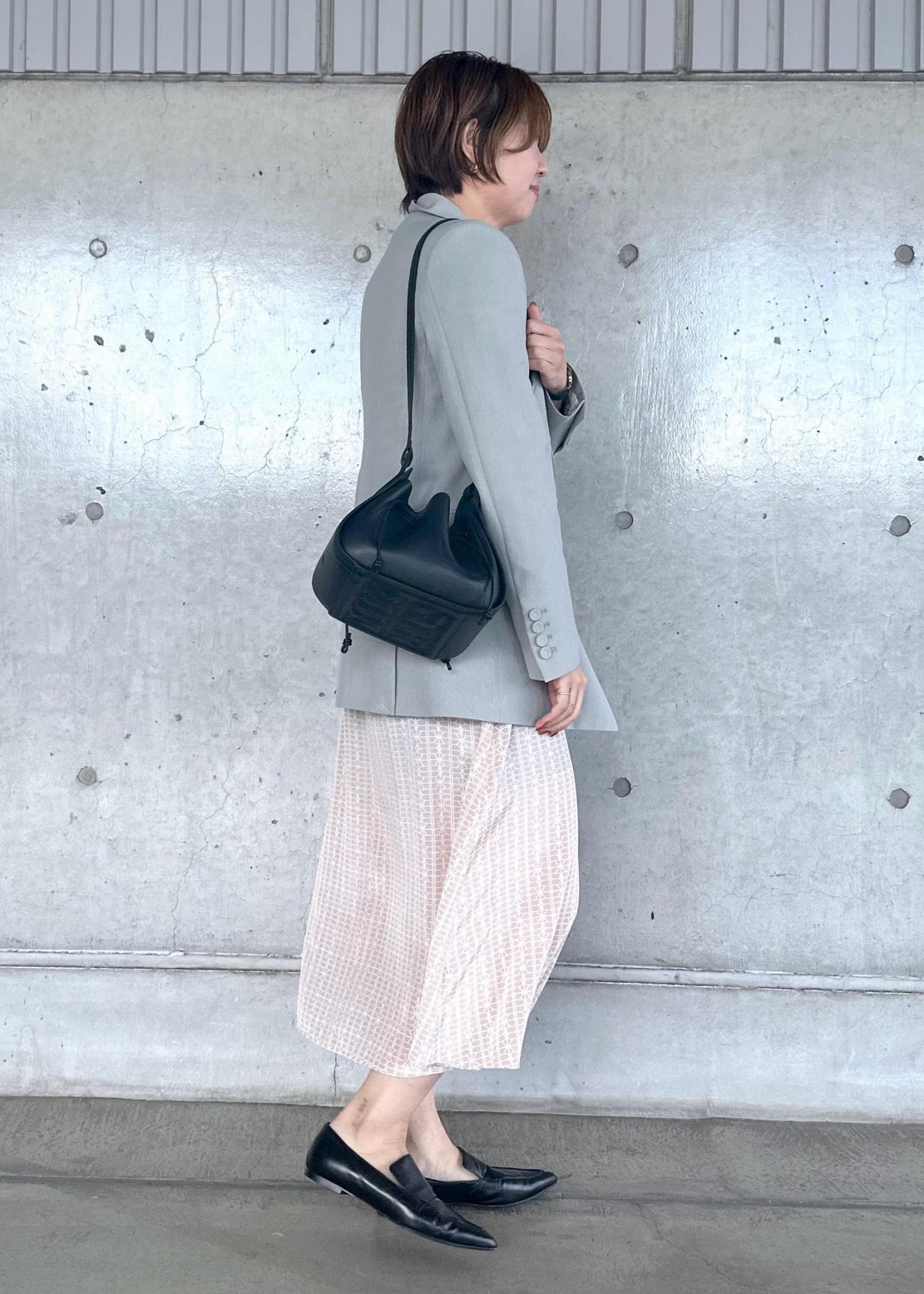 肩幅はジャストサイズでしたが、春ニットを着ると肩周りが少し窮屈でした。薄いインナーにすると
