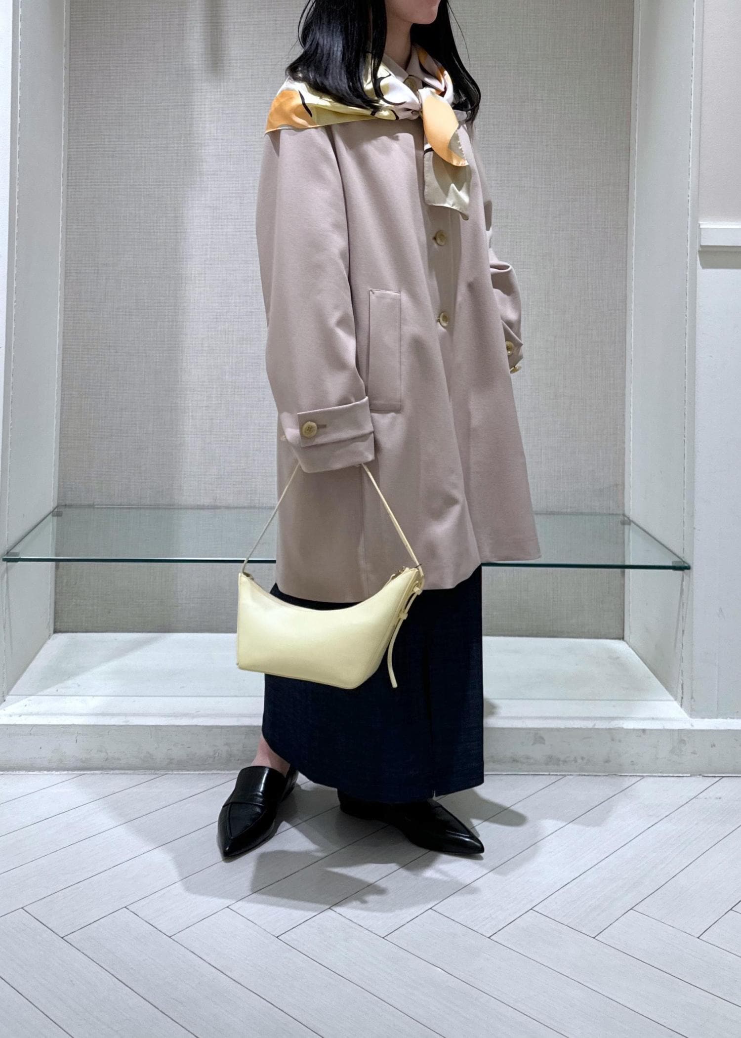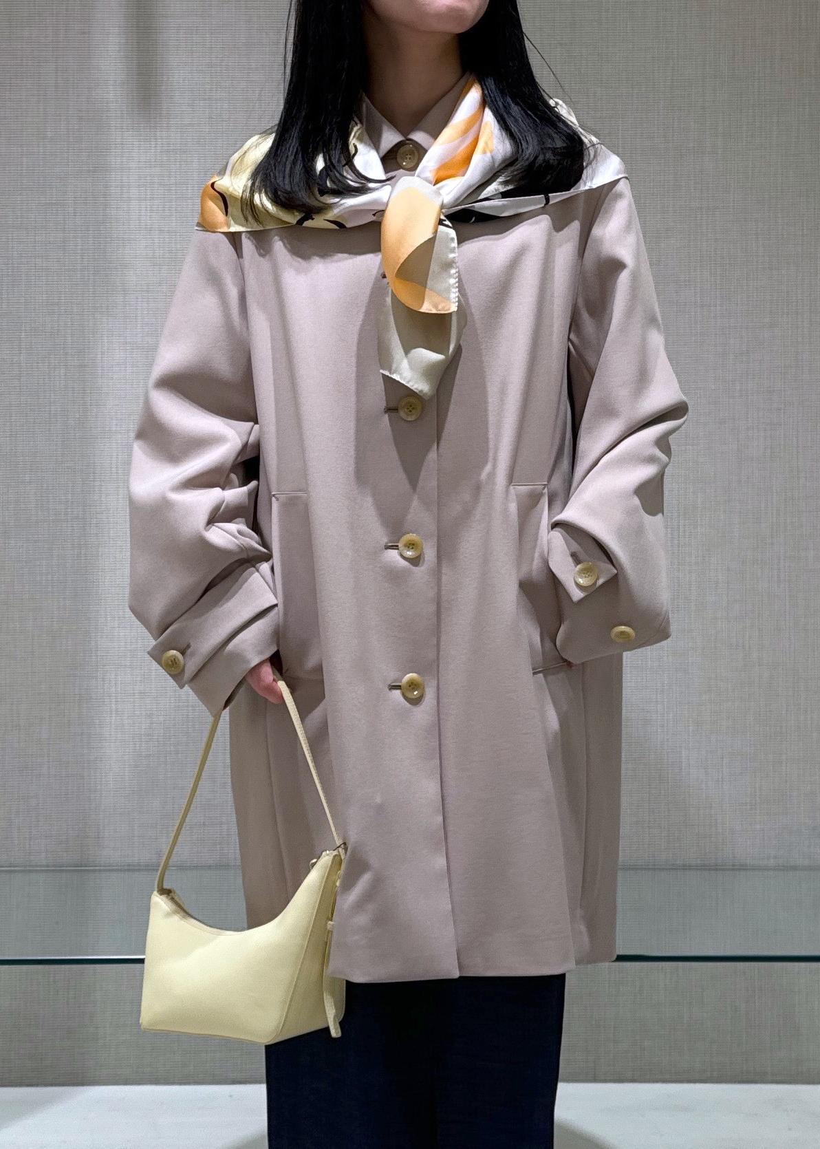 サラッとした質感でシワにもならず、とても軽量な着心地です。膝にかかるほどの丈感なので、低身長の方にもオススメのコートです!