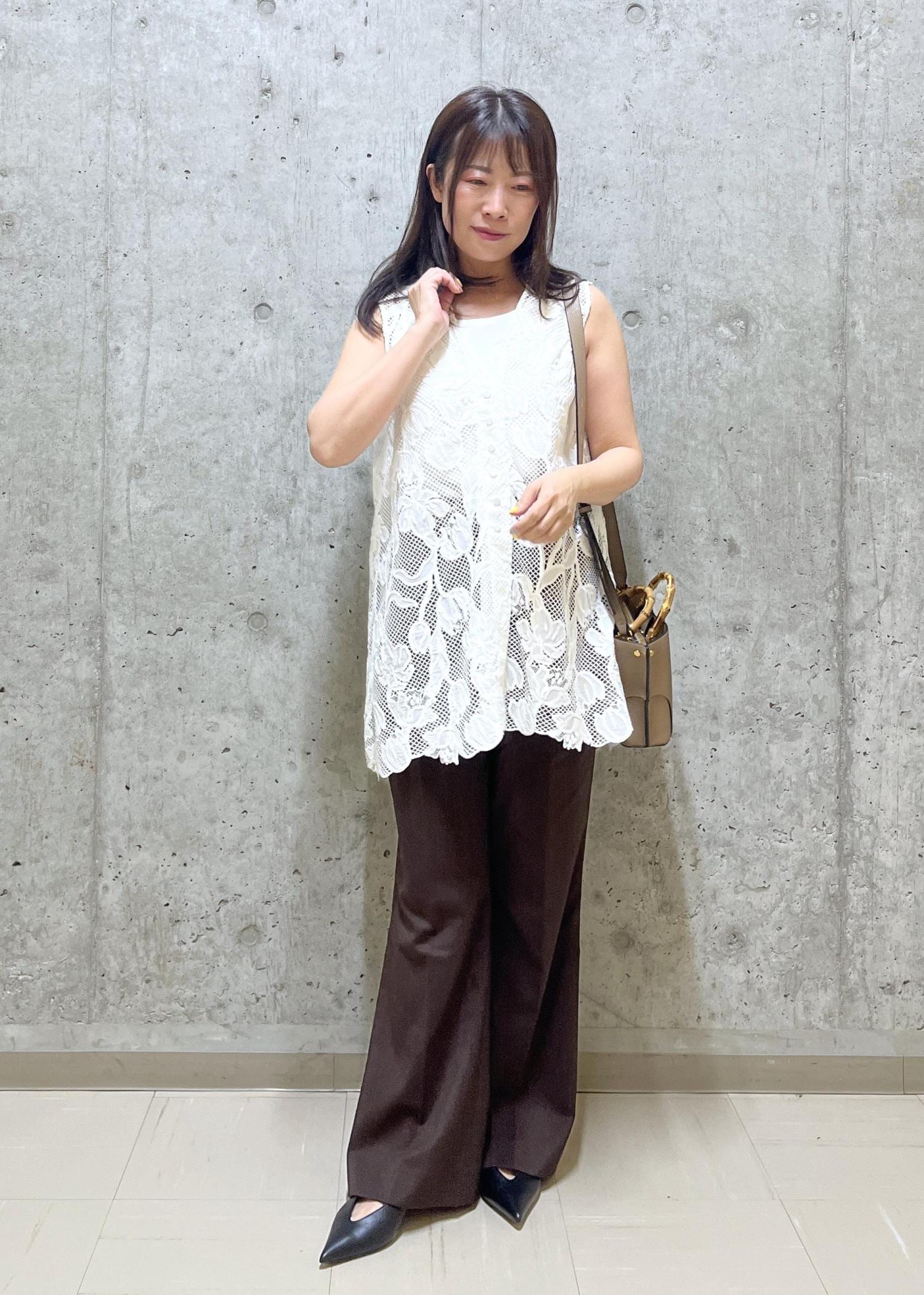 丈感は長めで、フラッシューズだと床についたので8cmヒールで合わせました。