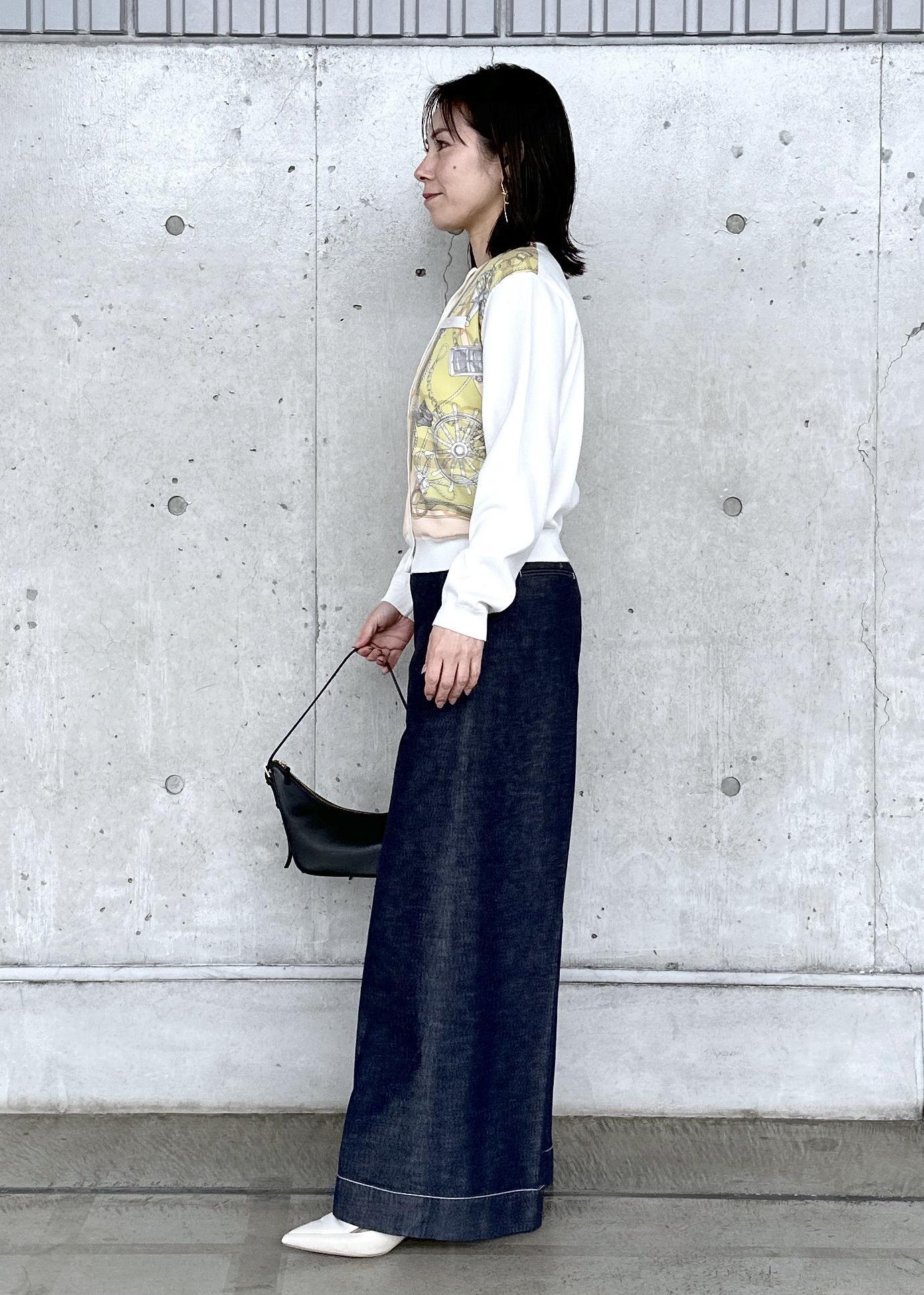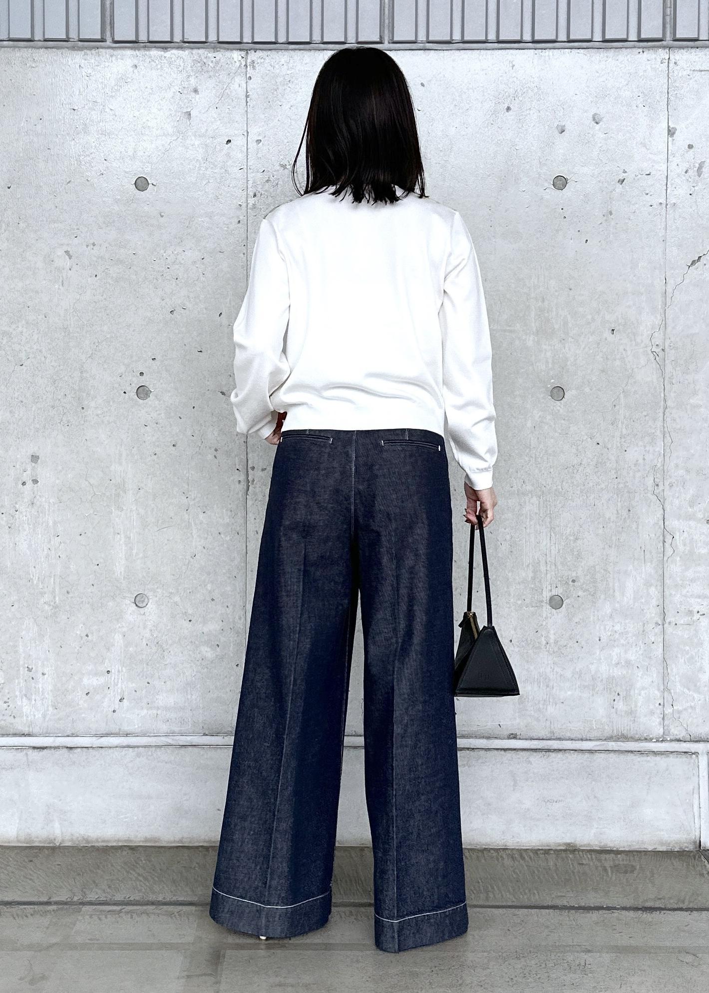 センタープレスのワイドデニムはキレイめにも使えるので、