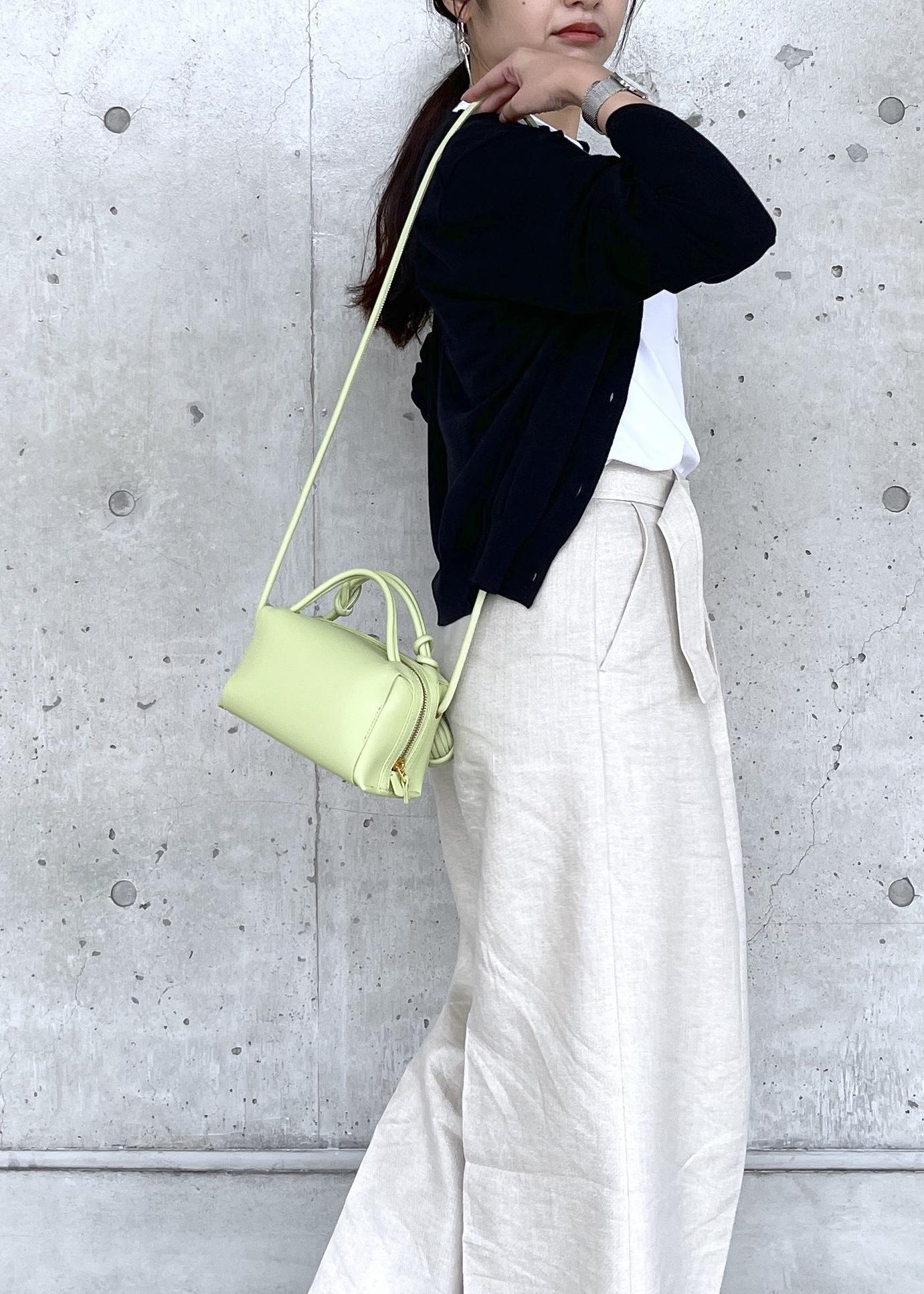 ミニ財布、携帯、ハンカチ、ティッシュ、カードケース、リップの必需品は収納可能です。間口が大きいので、荷物の出し入れがしやすいです!