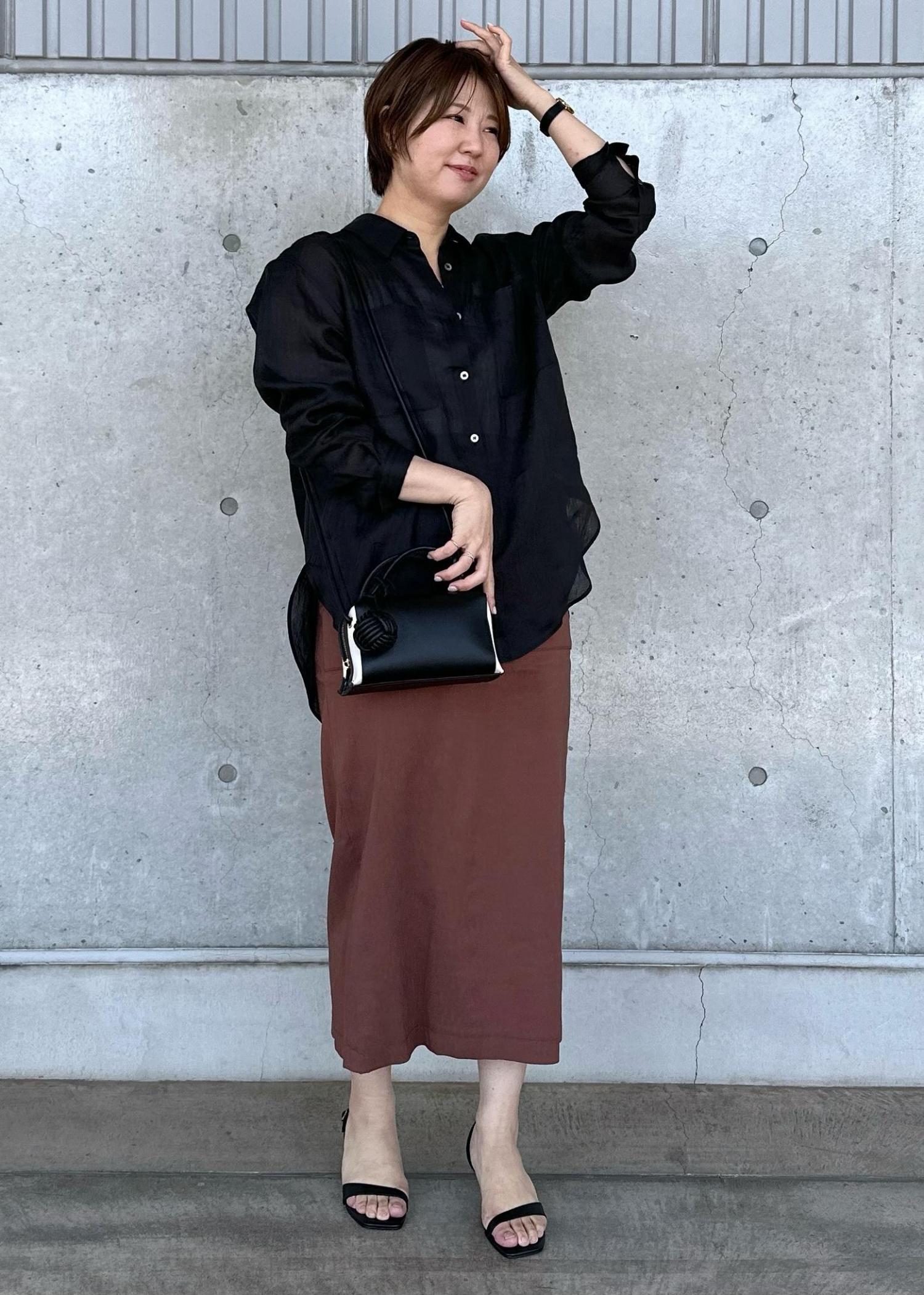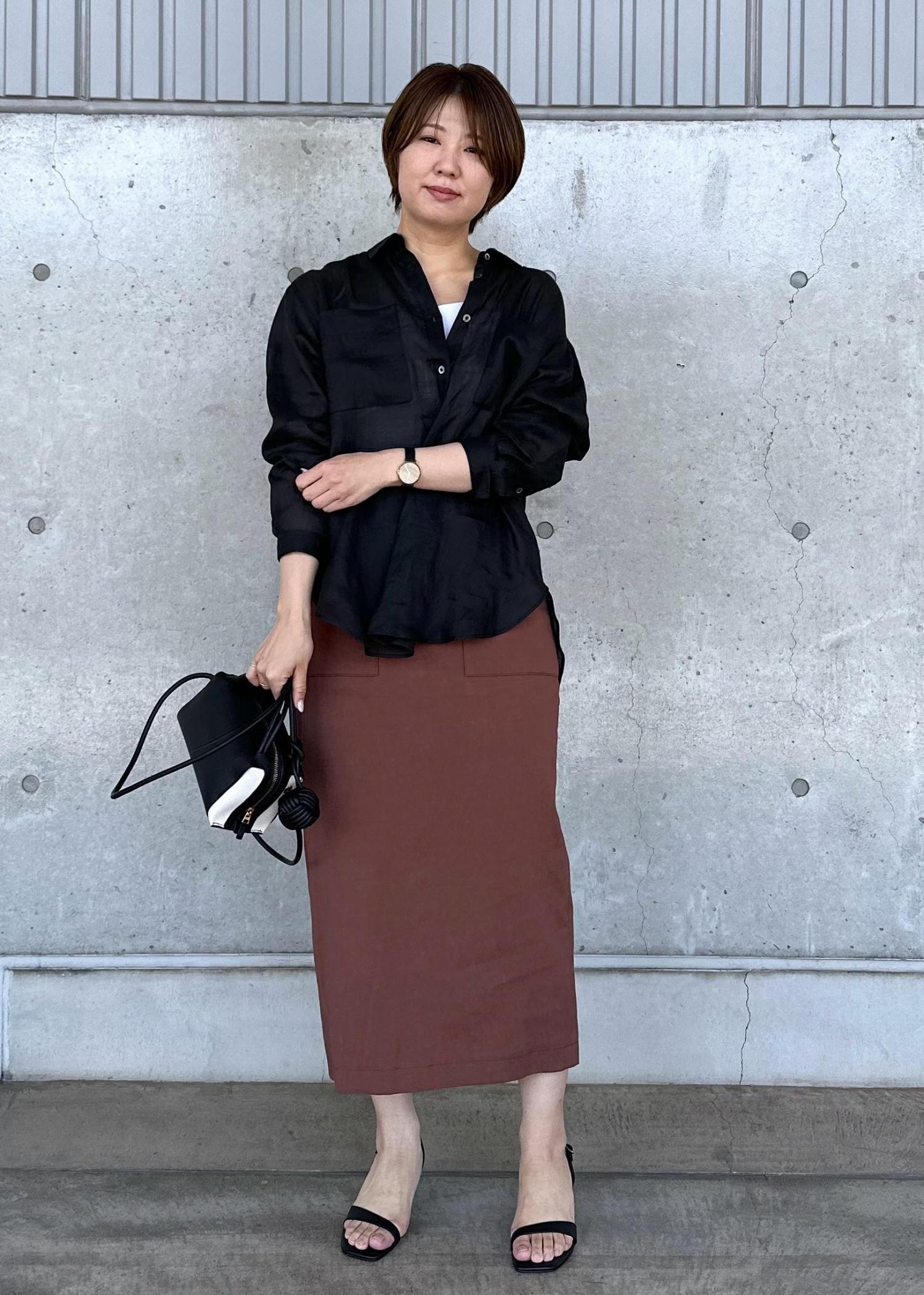 ブラックのリネンシャツとブラウンタイトスカートで合わせて着てみました!!