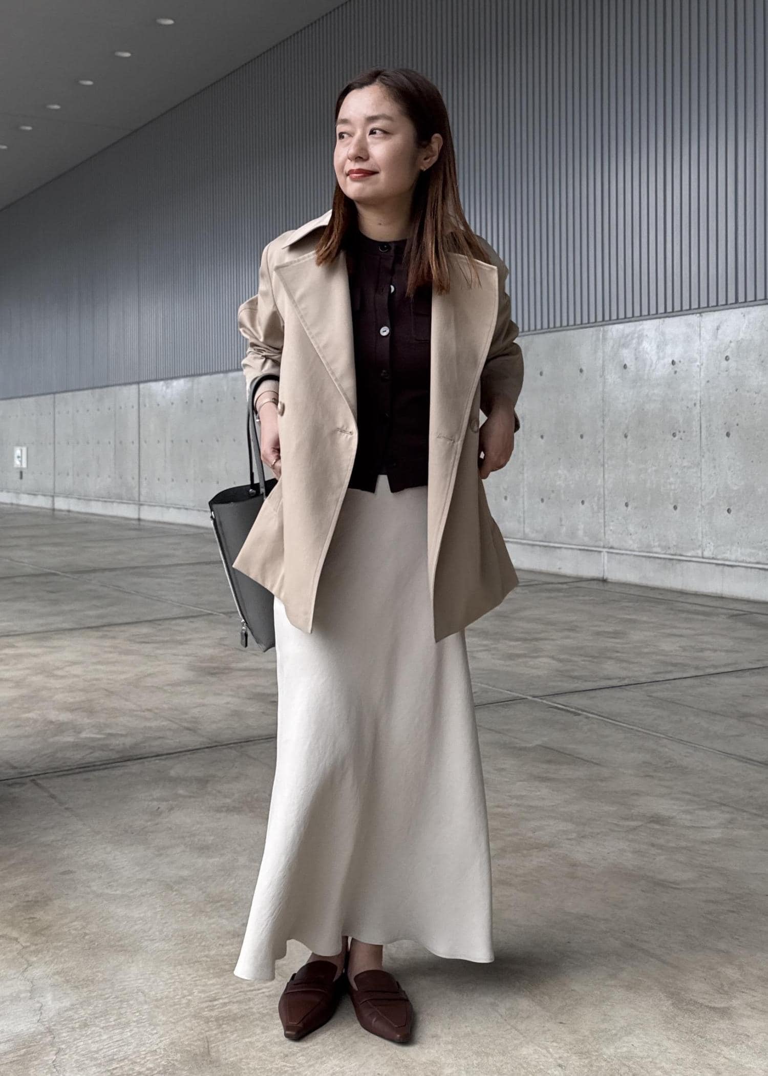 丈感はふくらはぎが隠れるくらいで、後ろスリットもあるので歩きやすいです。