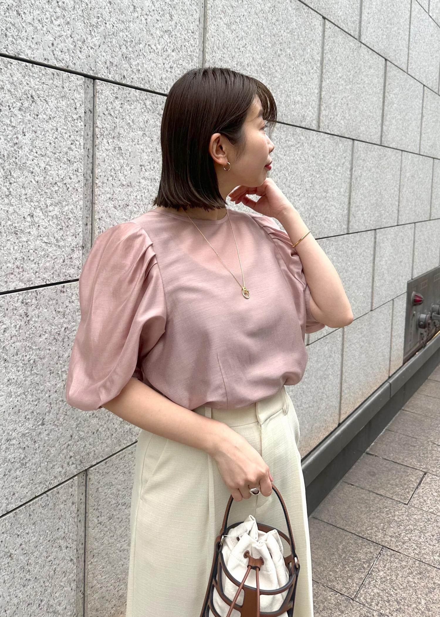 ピンクのパフスリーブブラウスに