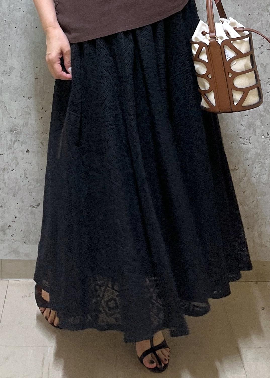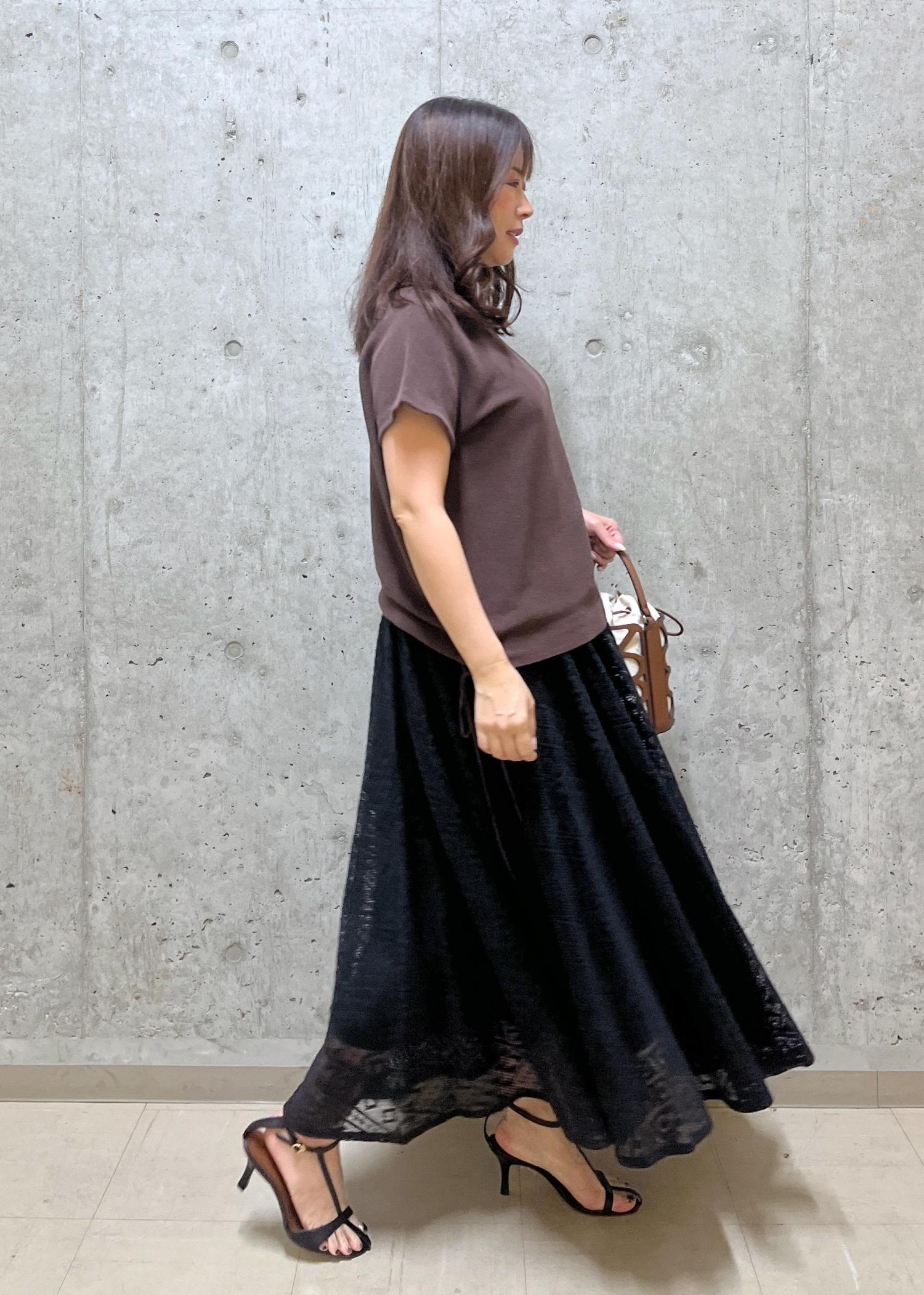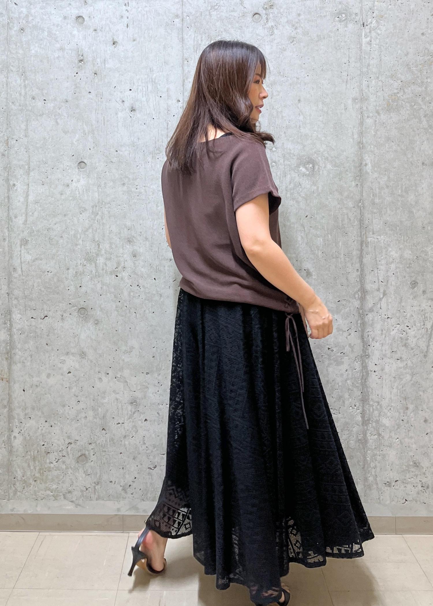 落ち着いたカラーの合わせですが、トップスはサイドがレースアップ、ボトムはレースと甘さもありつつ落ち着いた雰囲気のあるコーディネートです。