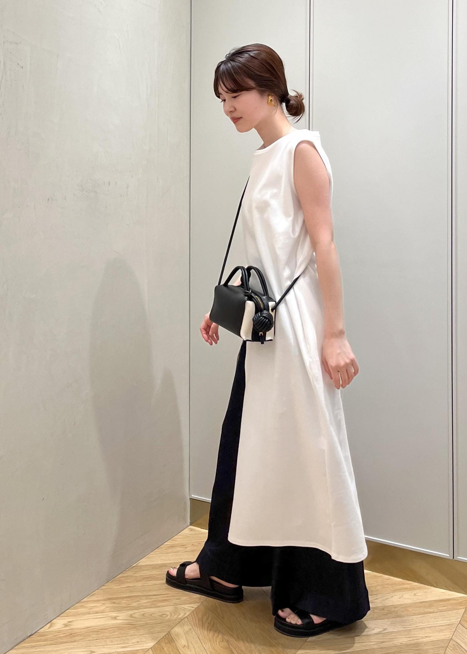 着丈は足首が見える長さなので、フラットシューズを合わせてもバランス良く着られます。