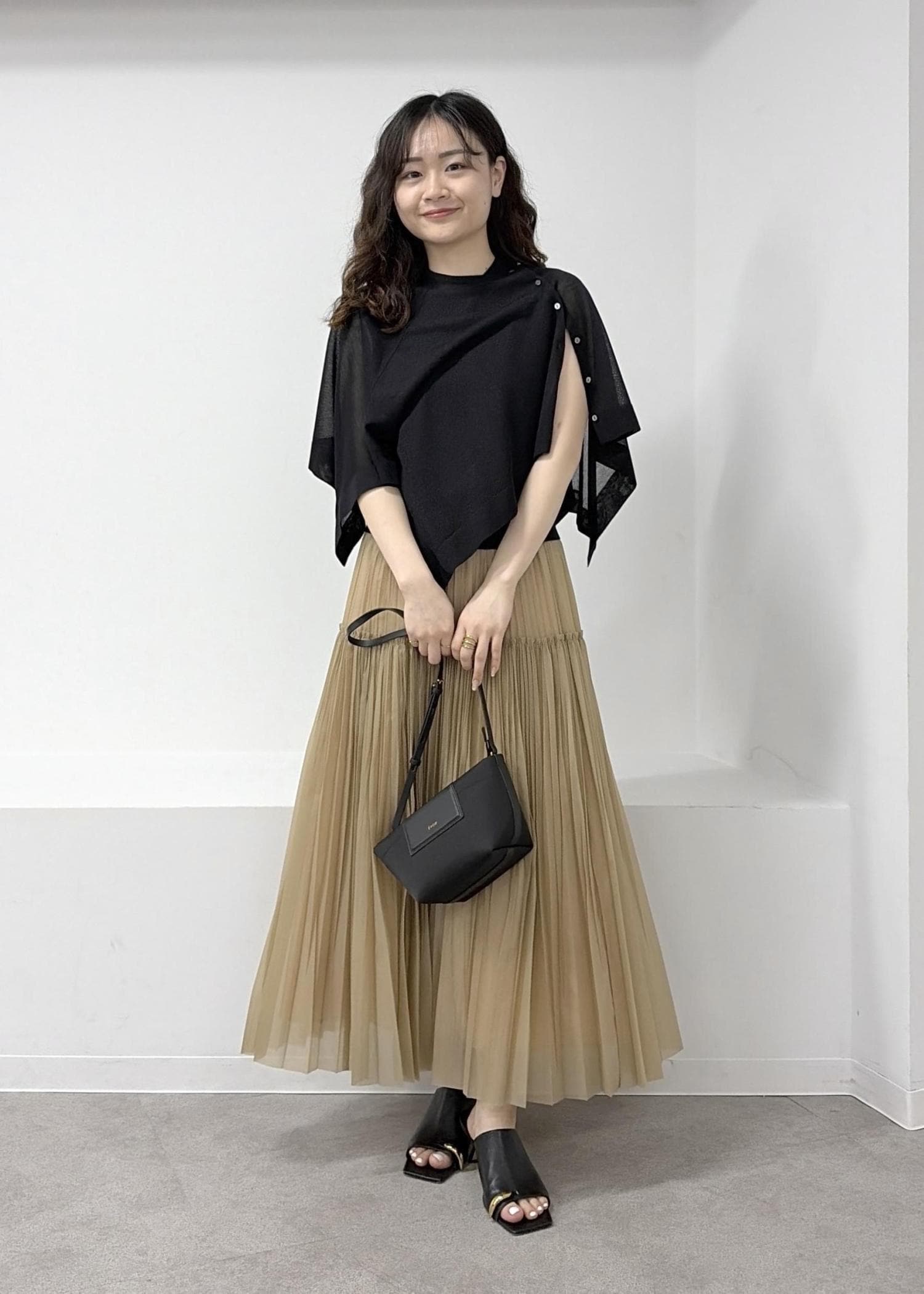 落ち感のある生地で、お腹周りはラインが出ないデザインです。プリーツがサイドに入っており細見えするのと、動きがあるデザインがとても綺麗です♪