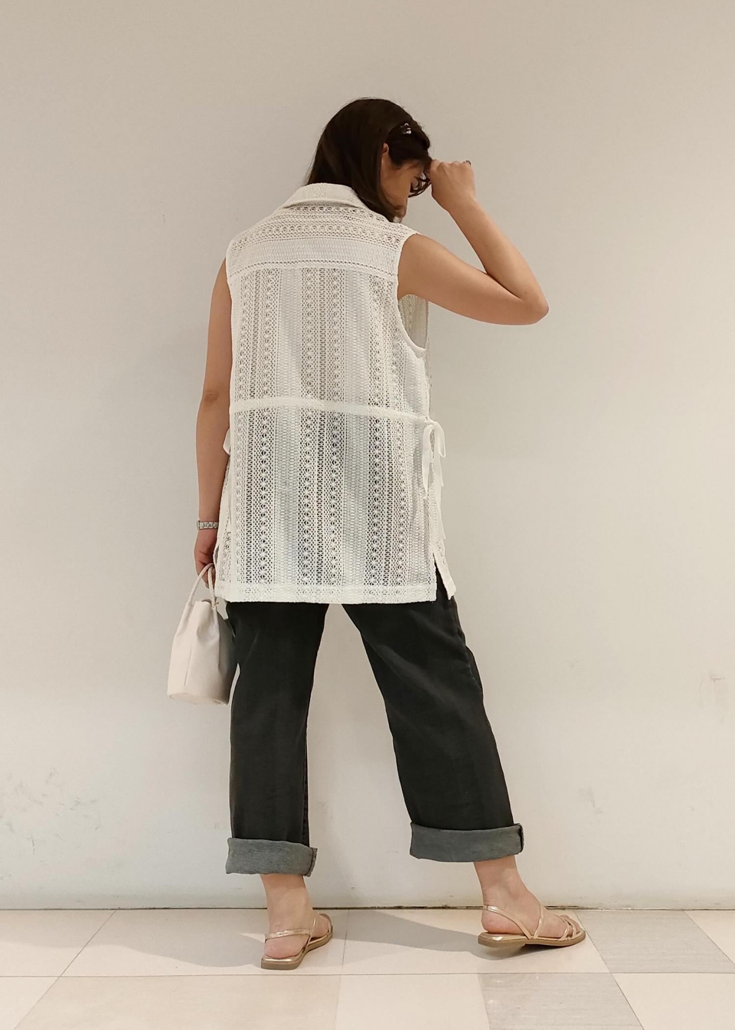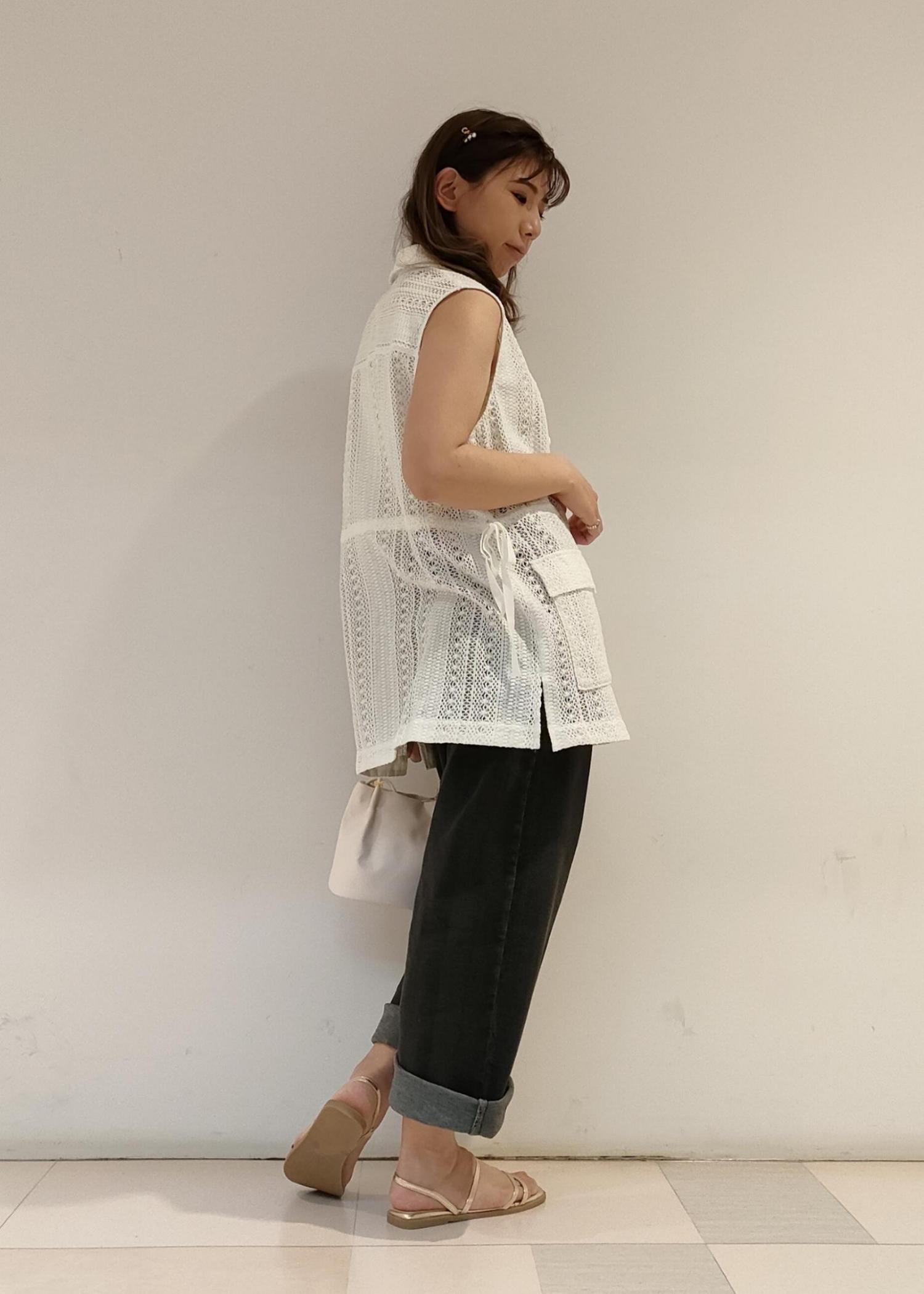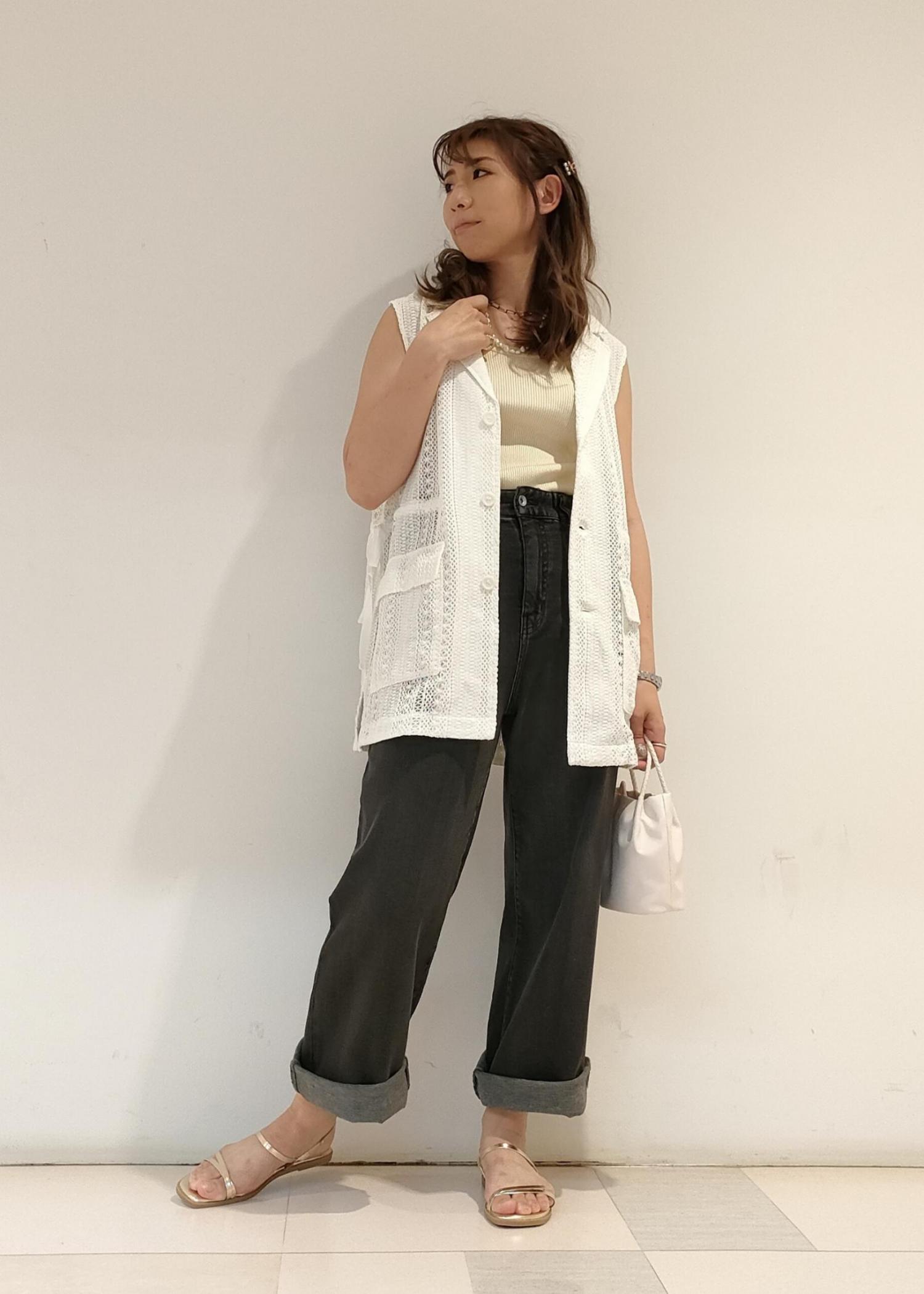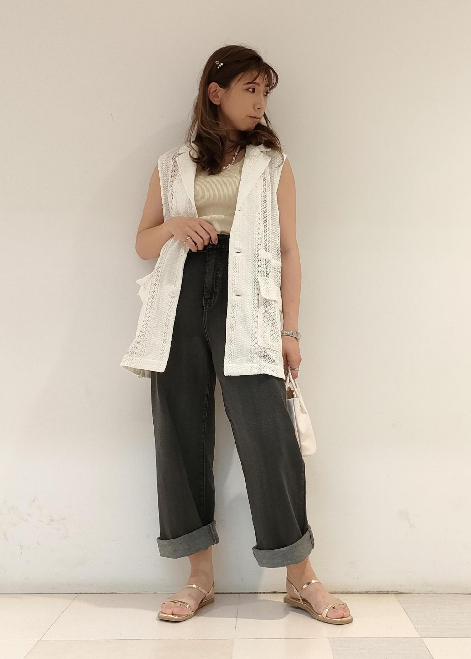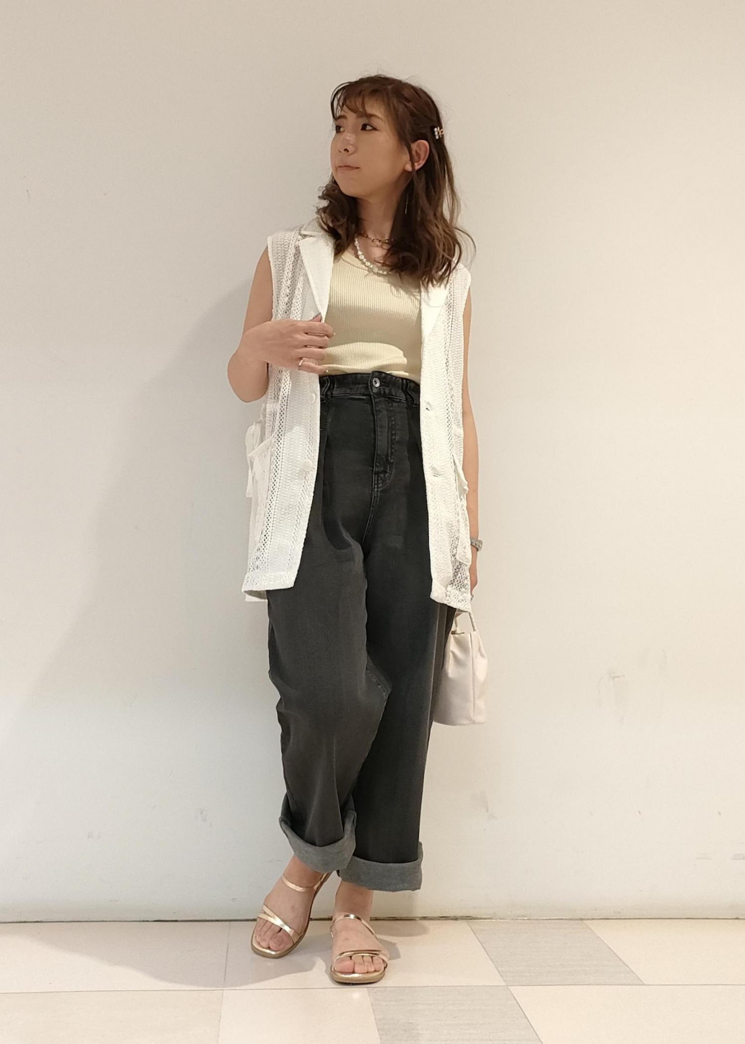 ゆったりとしたシルエットでラフな印象になりがちなタックデニムに、きちんと感もプラスできる襟付きのレースベストを羽織ったきれいめカジュアルスタイル。着回しもしやすいシンプルなデザインで。オフィスやオフの日など、色々なシーンで使えます!