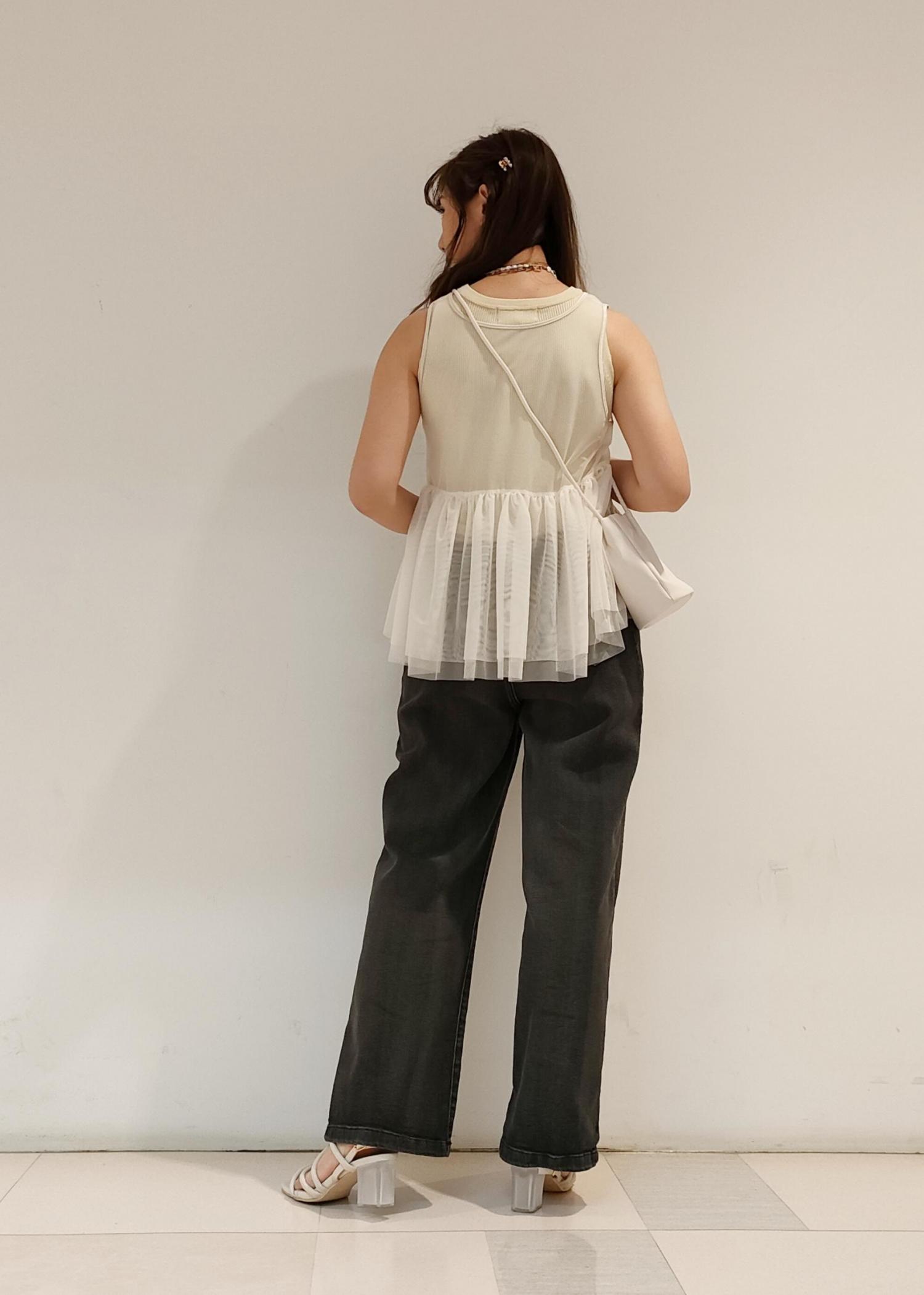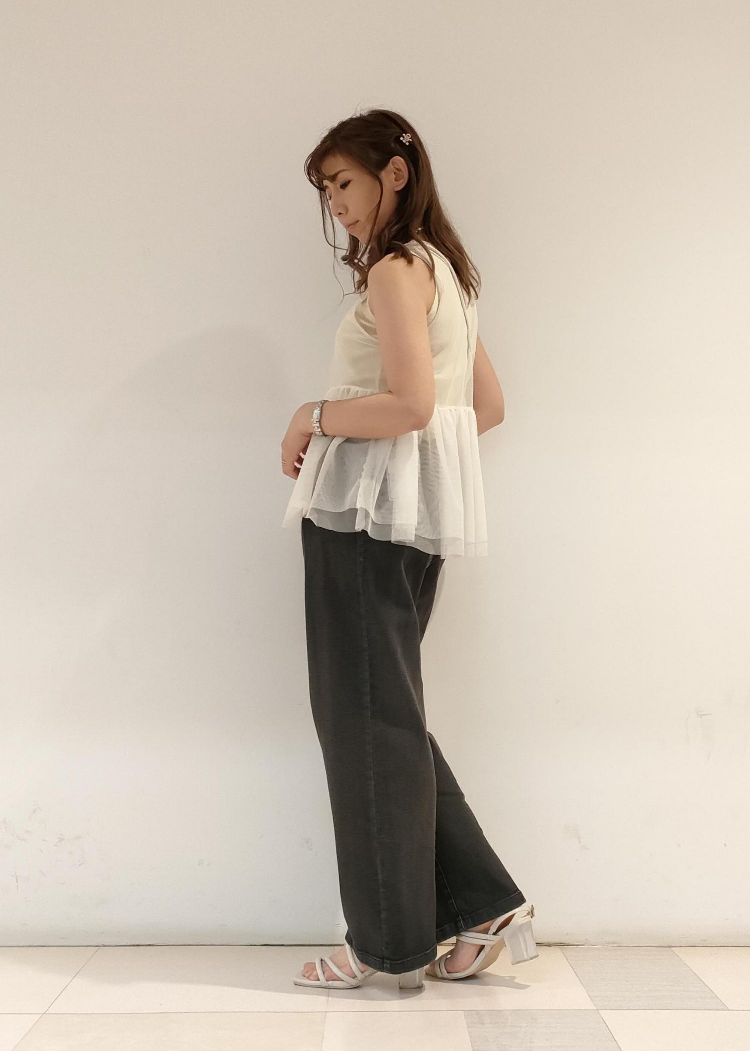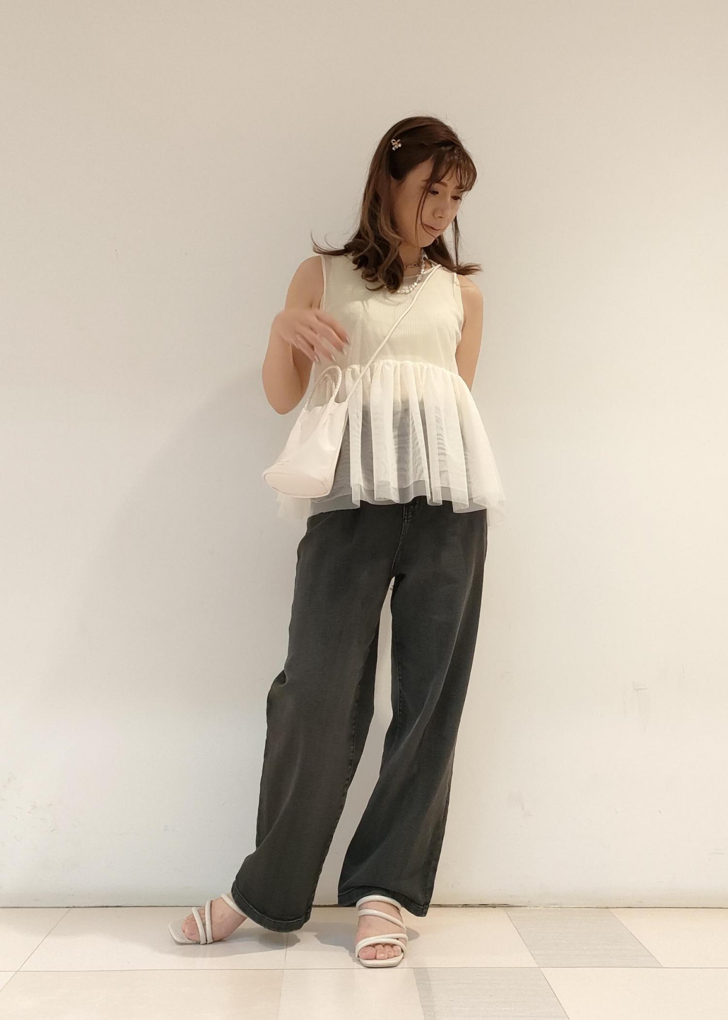 手持ちのトップスにレイヤードして、簡単にトレンドのチュールスタイルが楽しめるタンクトップを夏仕様に着回ししてみました。シャイニー感のあるニットタンクトップと重ねることでチープに見えない大人かわいいスタイリングになっています。