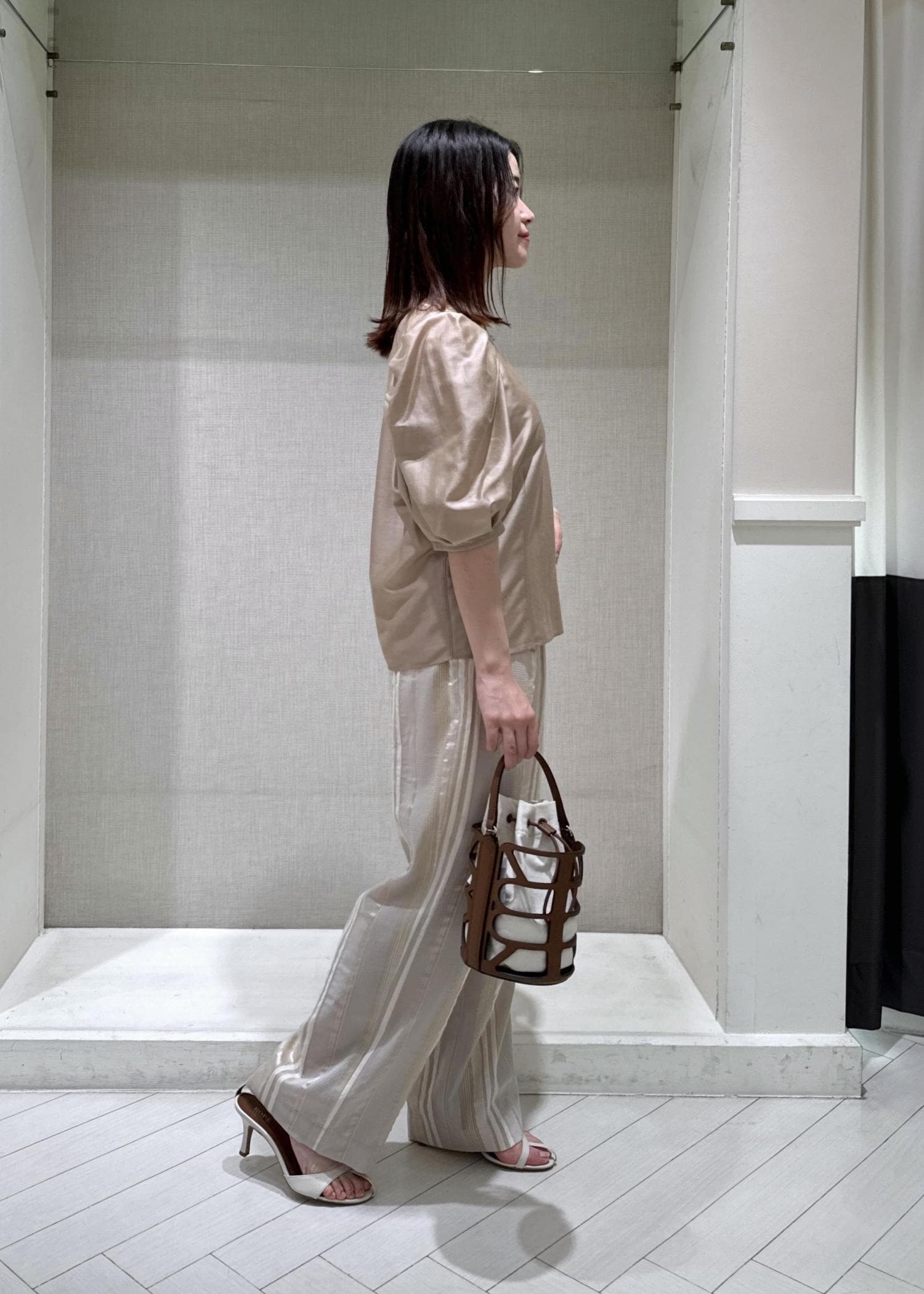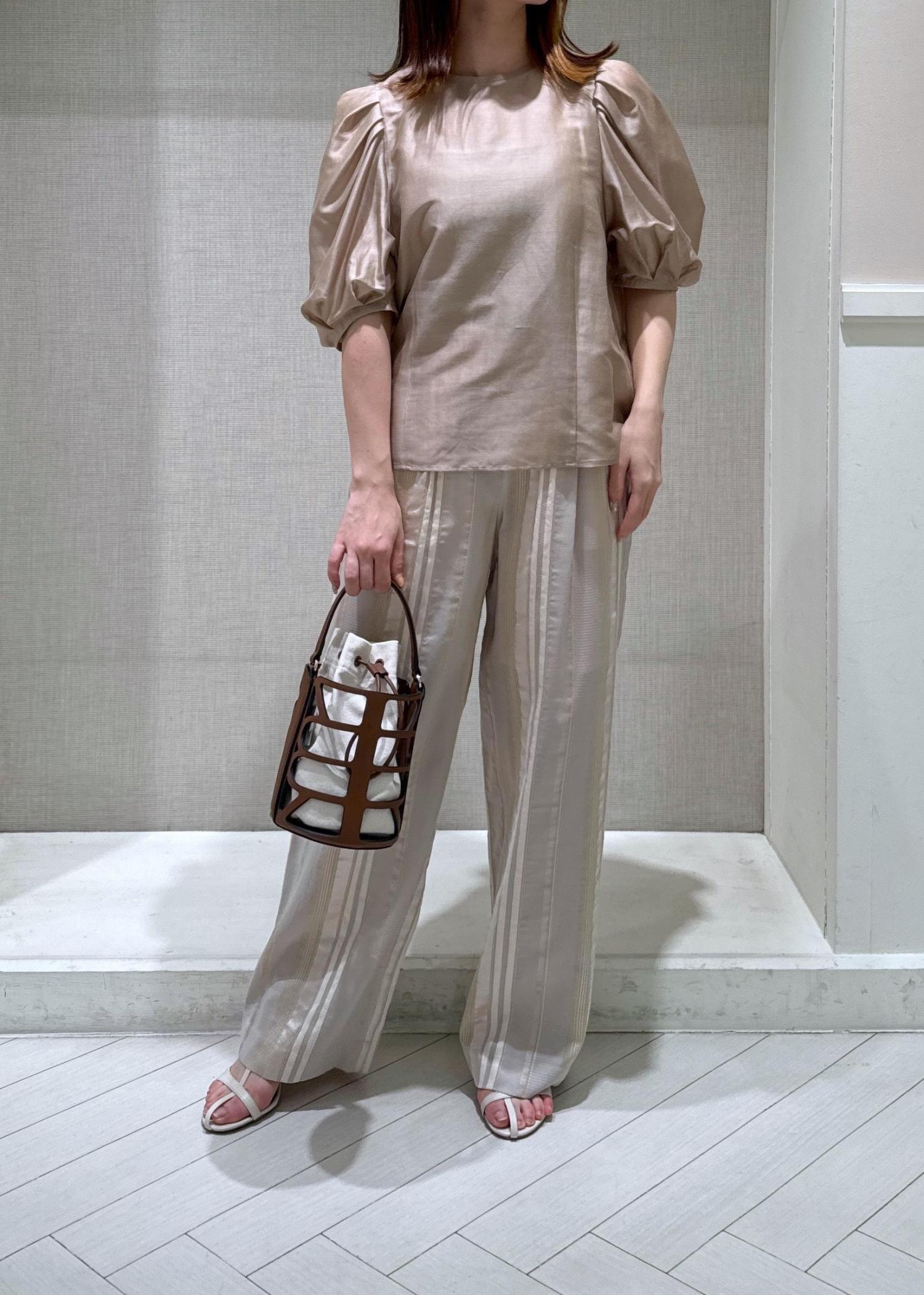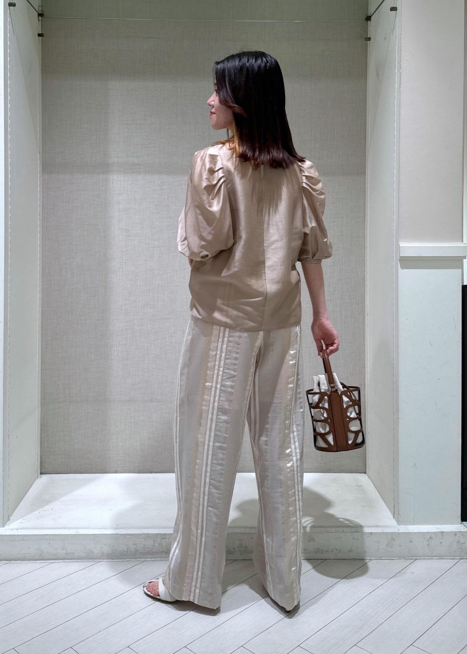 入荷を楽しみにしていたカールマイヤーパフスリーブブラウスの新色を着用してみました♩ベージュの他に、ブラック、サックス、が新色として入荷しています。少しシアー感があるので涼しく、今の季節から夏場にかけた長く着用できます。羽織なしで一枚で着映えするおすすめのブラウスです◎