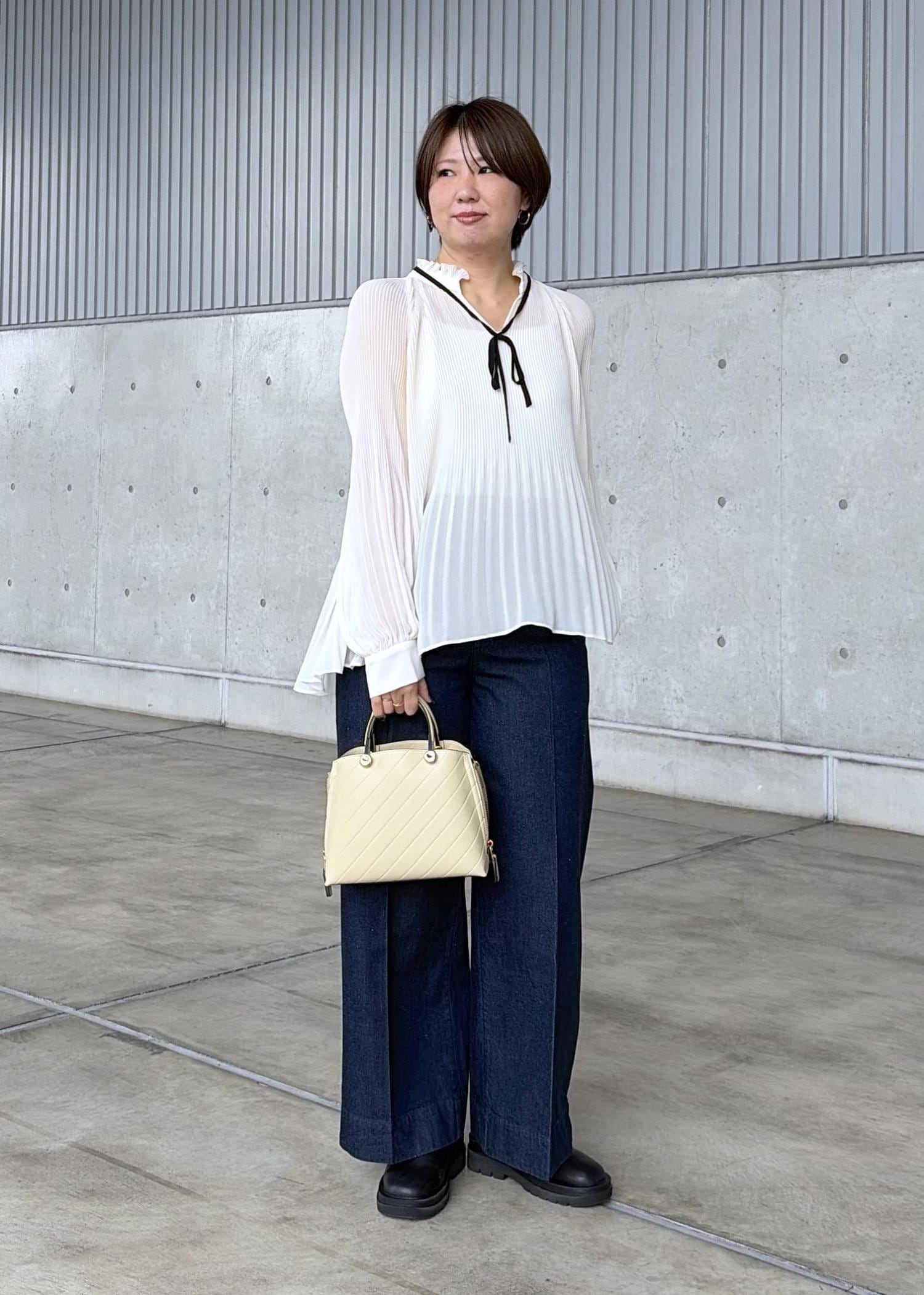 くるぶしがしっかり見える丈感で裾にシアー感があるので軽い印象で着ていただけます。
