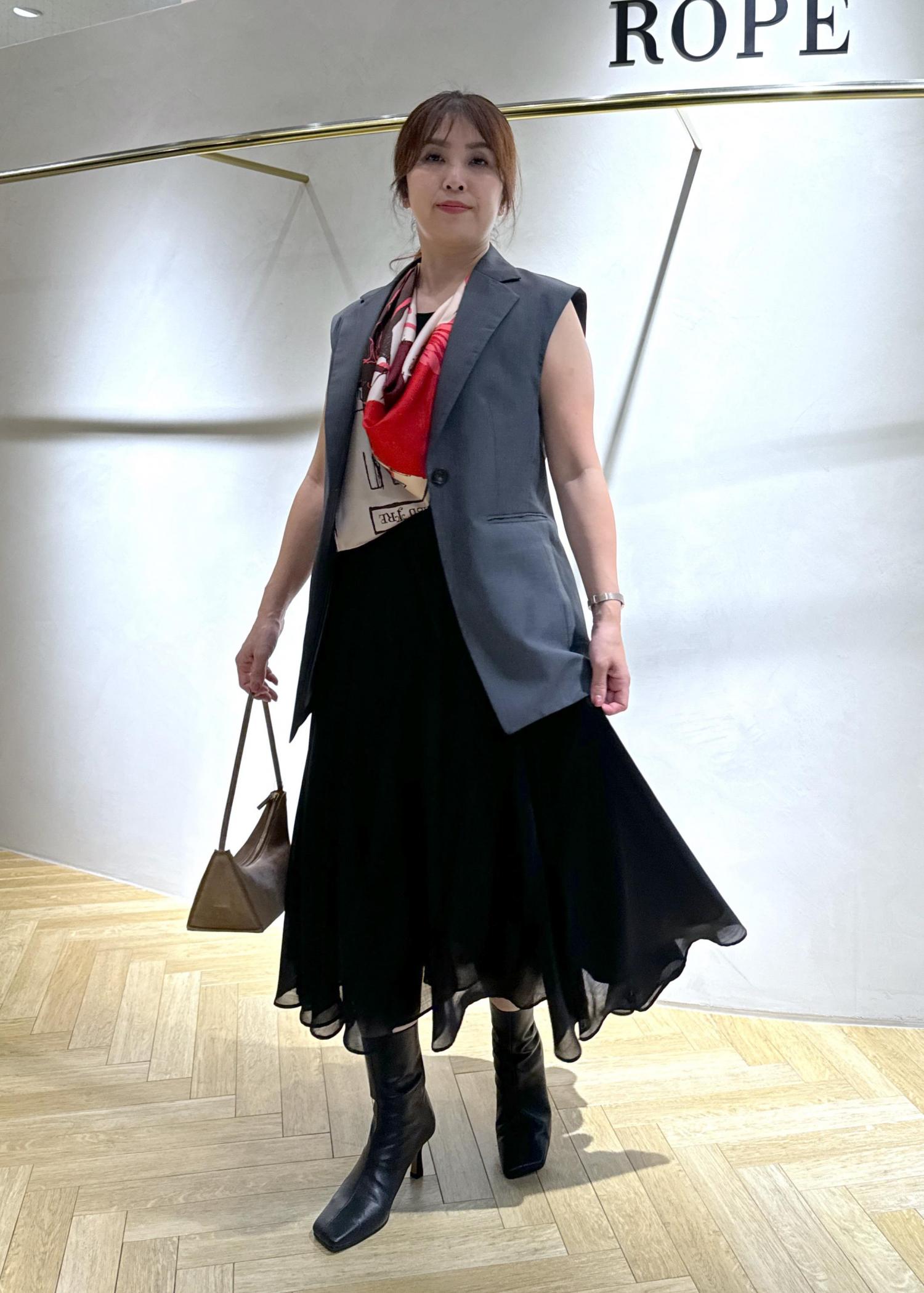 バッグの素材や秋色のスカーフを投入で一気に秋のコーデに!