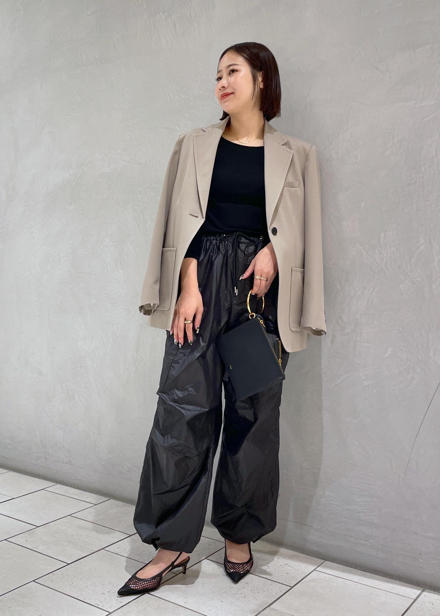 スポーティーなパラシュートパンツにジャケットとヒールを合わせ女性らしさをプラスしたコーディネート!