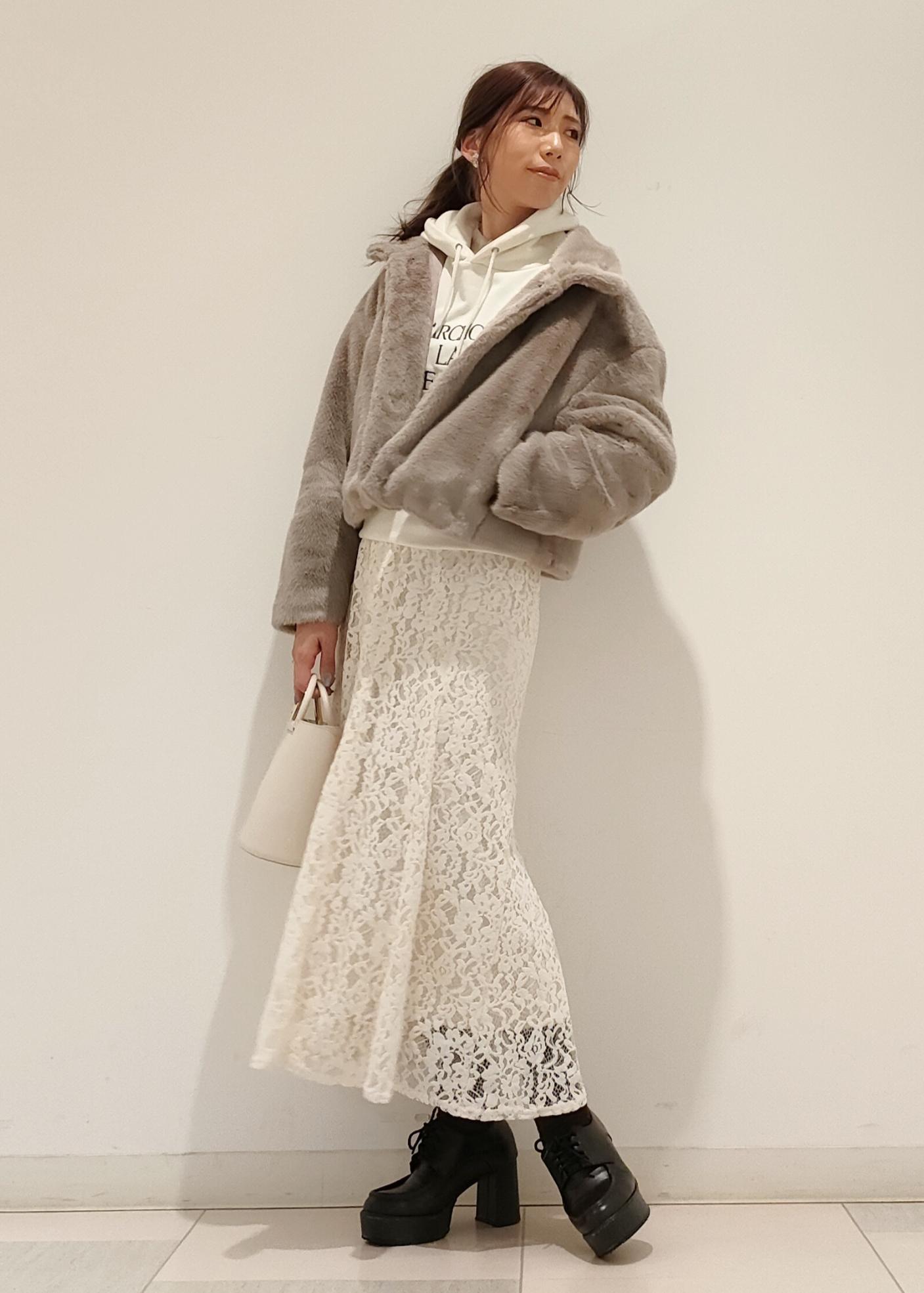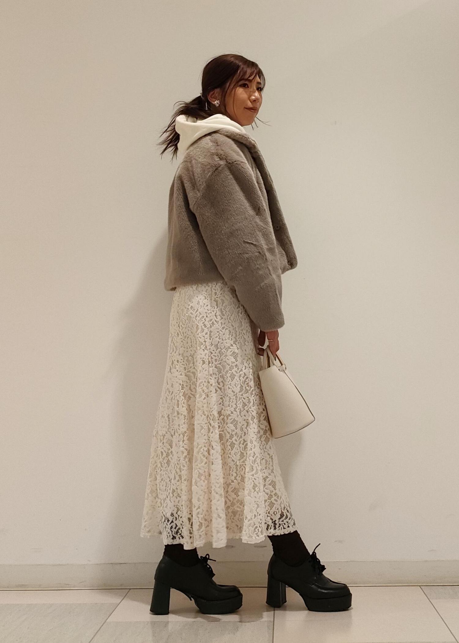キレイめカジュアルなホワイトコーデにファーのアウターを合わせて温かみのある冬らしいスタイリングに。高見えするのにカジュアルさもあり、冬のお出かけにピッタリのコーディネートです!