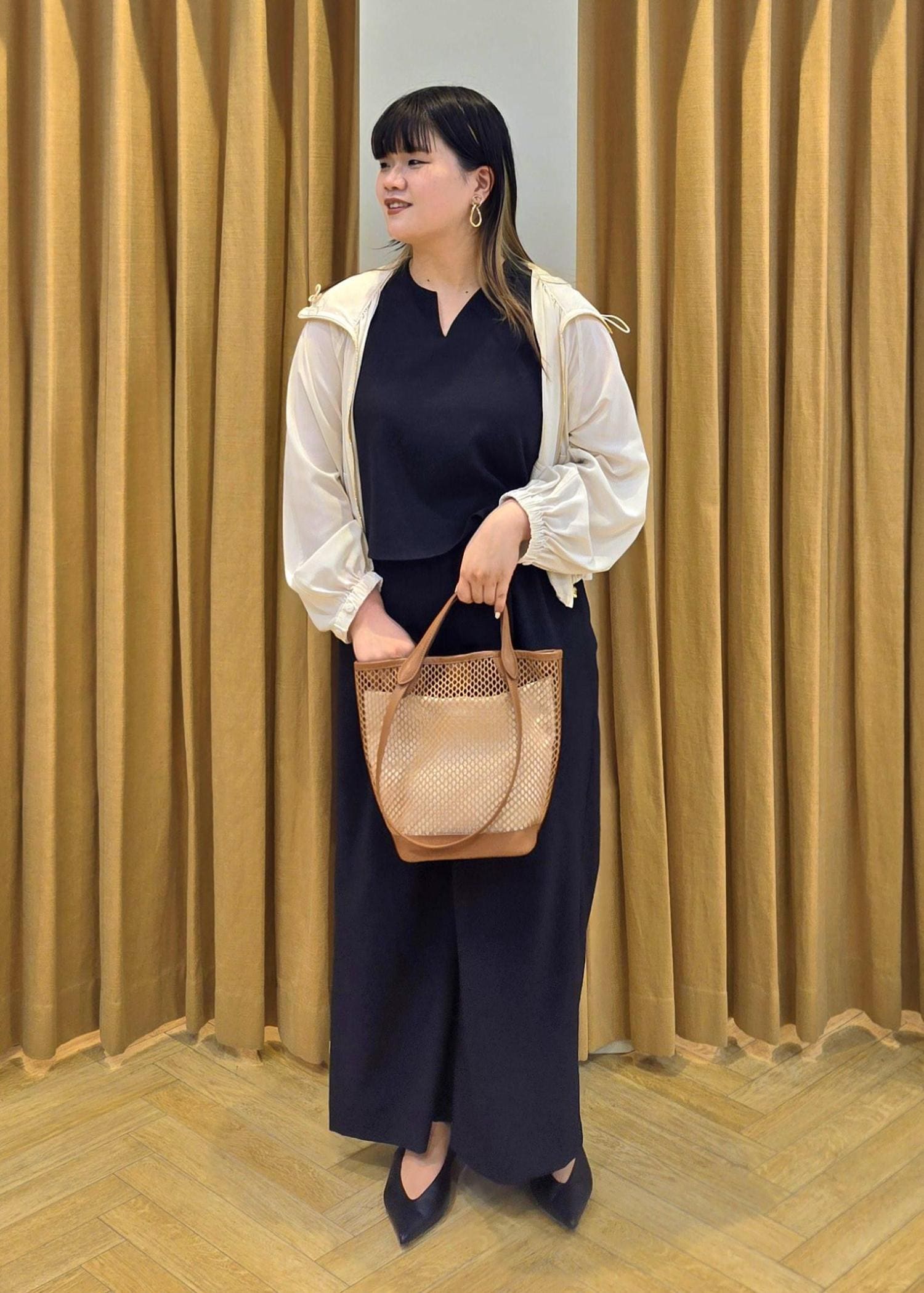 甘くなりすぎないようブラックの小物で大人スタイルな印象に。