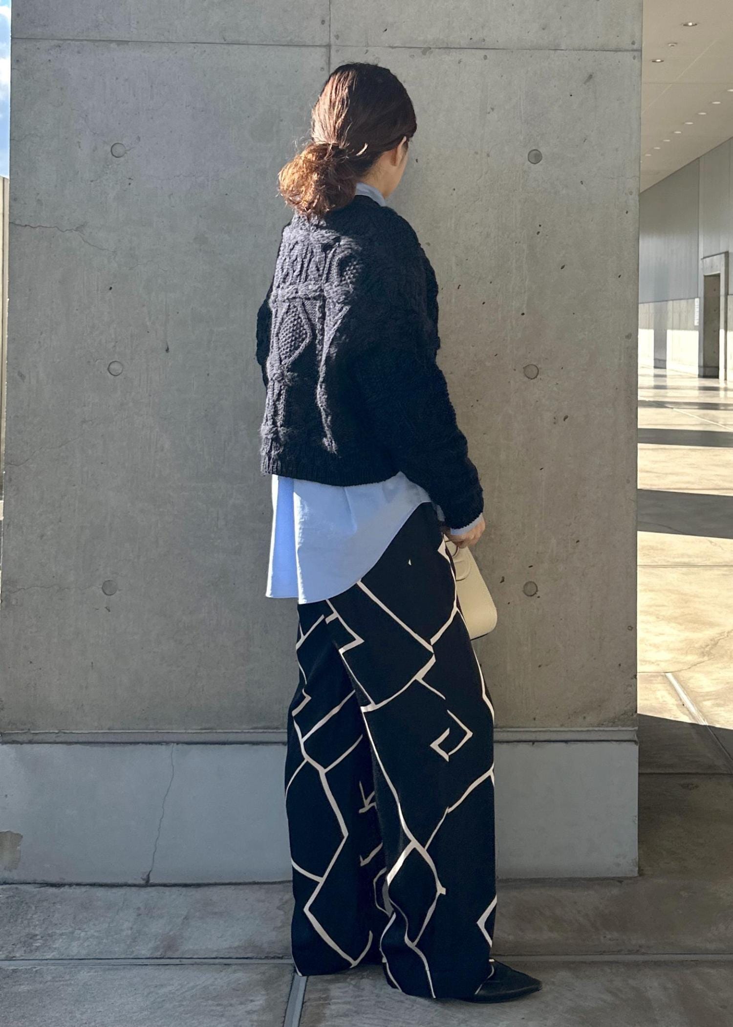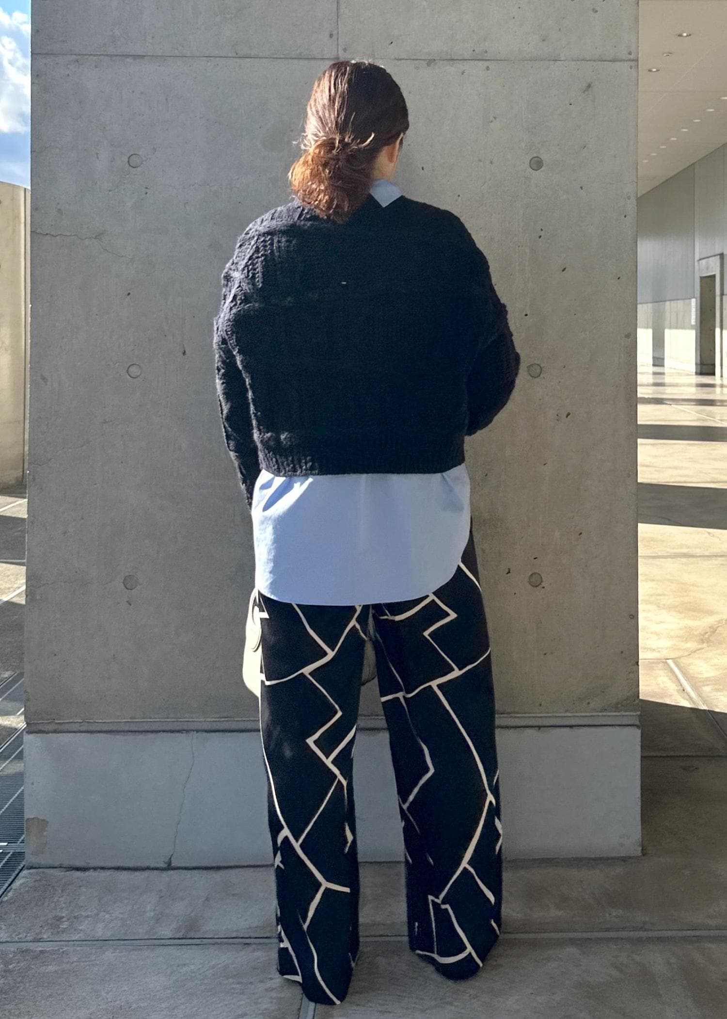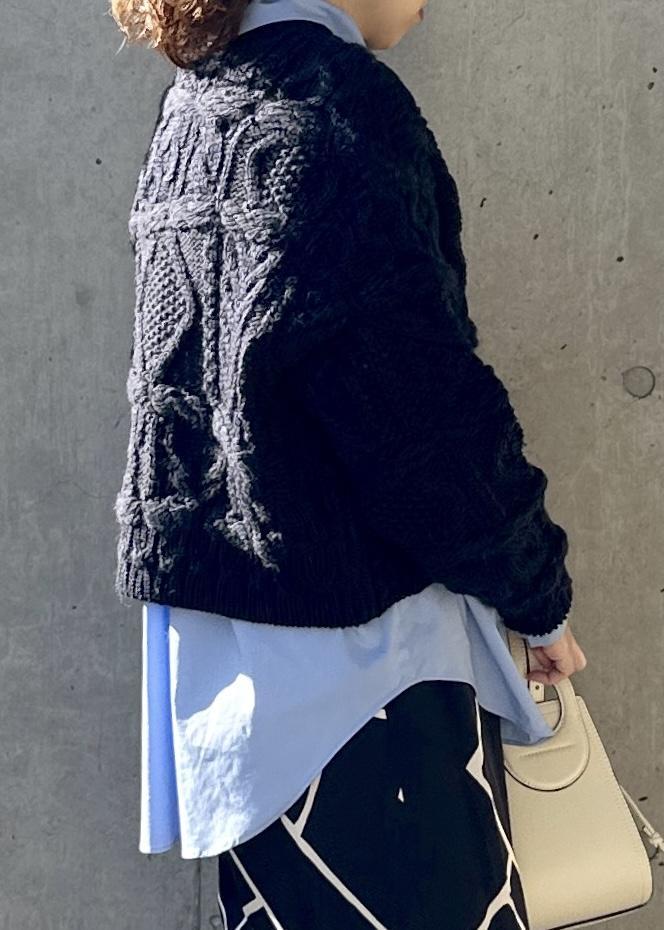 見頃幅の広い丈が短めのニットなので、ダボッと見えにくく、重ね着しやすいアイテムです。