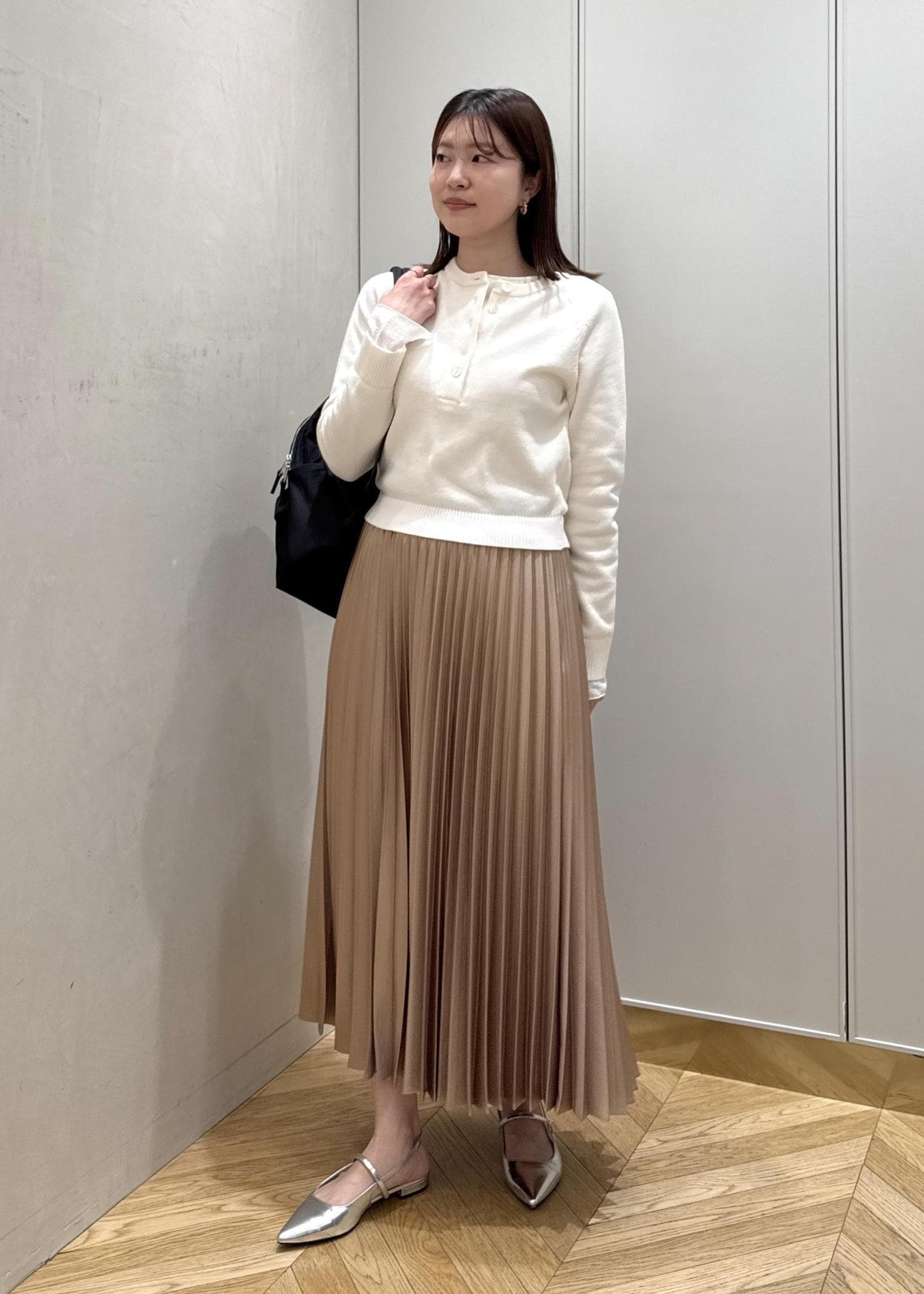 ラムウールのミドル丈コートを使って、春まで着られるスタイリングにしました。