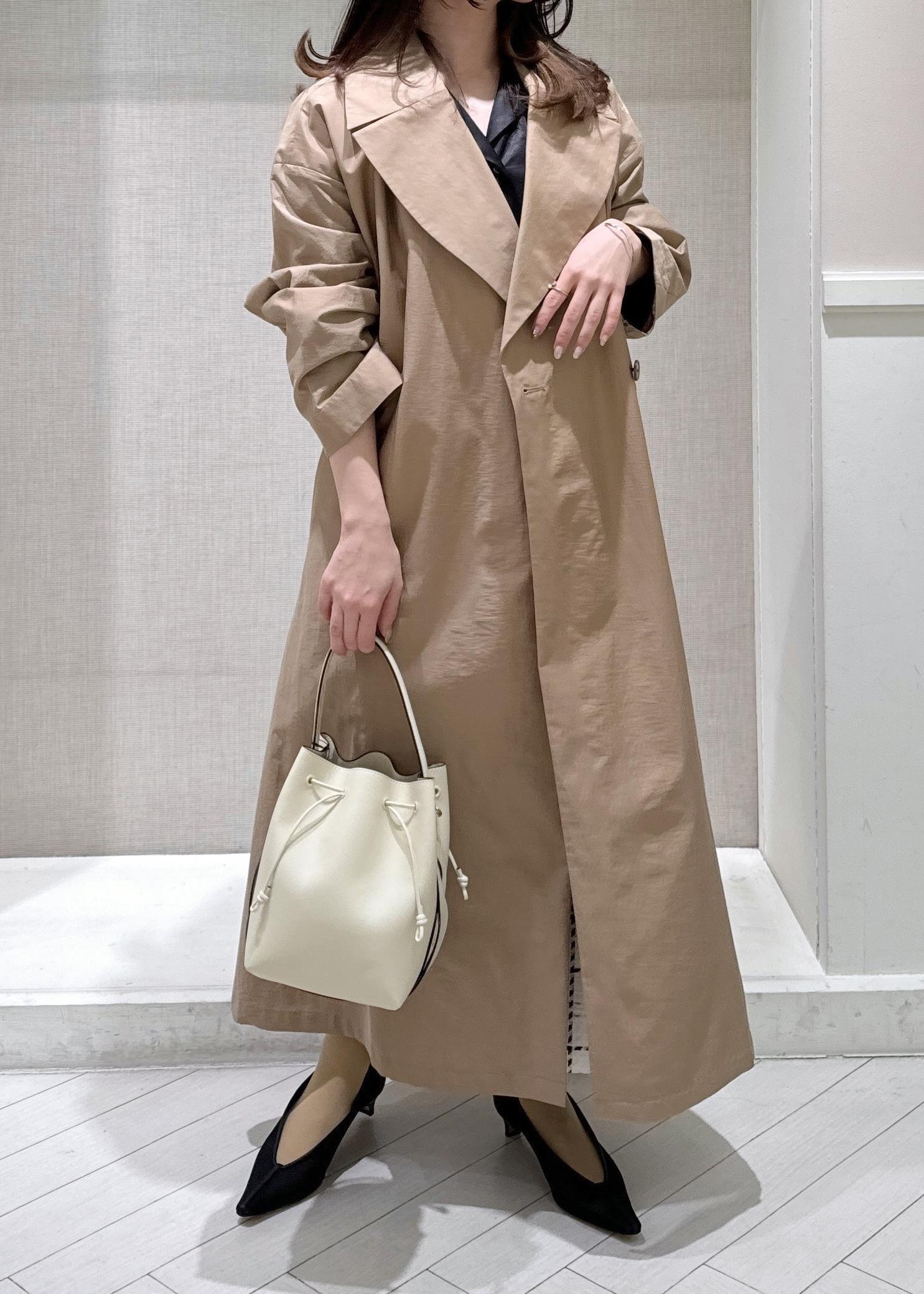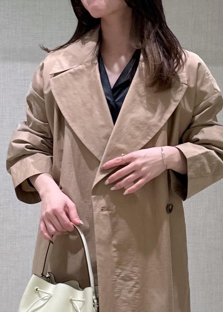 アウトレットROPÉ【軽量】コットンポプリン スプリングコートベージュ / 36¥25,520レビュー身長150cmの私には少しオーバーサイズ感がありますが、リボンを後ろで絞ってウエストラインを作って着用してみました。腕回り、身幅ともにゆとりのあるサイズ感なので、肌寒い日は中に着込んでいただいても窮屈感はないです。